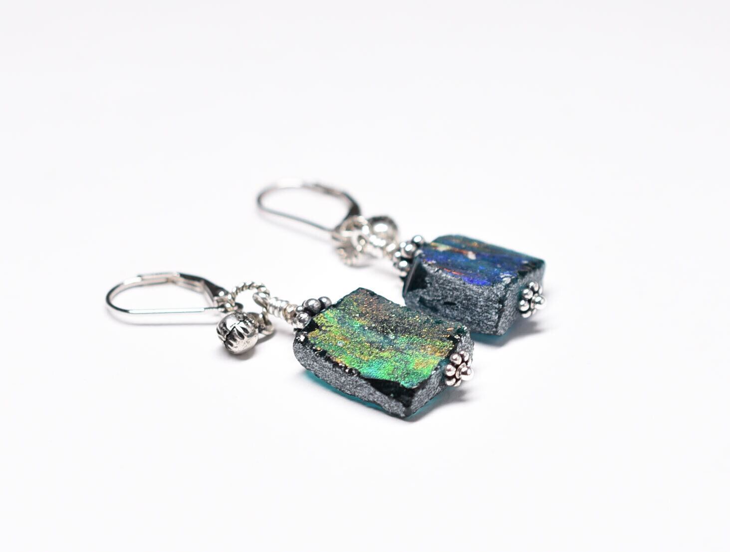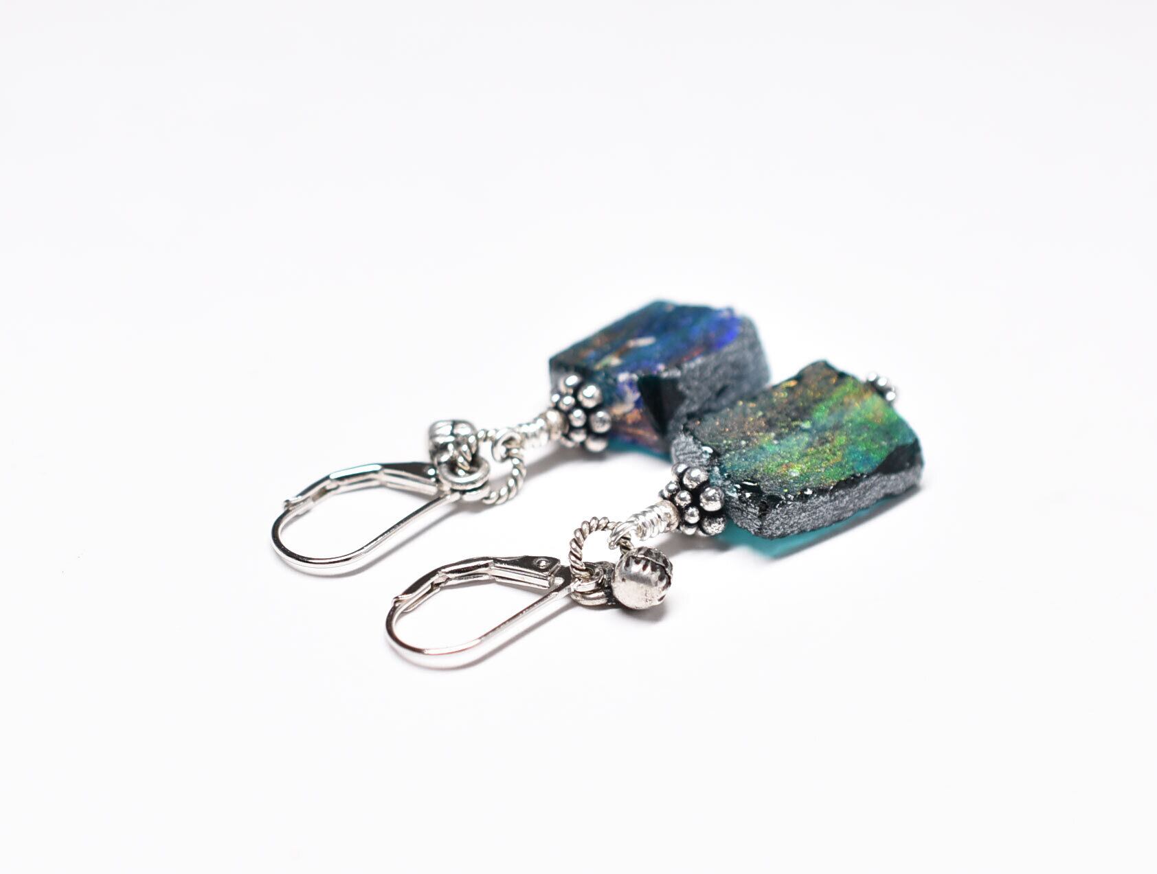 ブルーグリーンの玉虫色銀化ローマングラスと小さなインドシルバー鈴を繋いだピアスです。