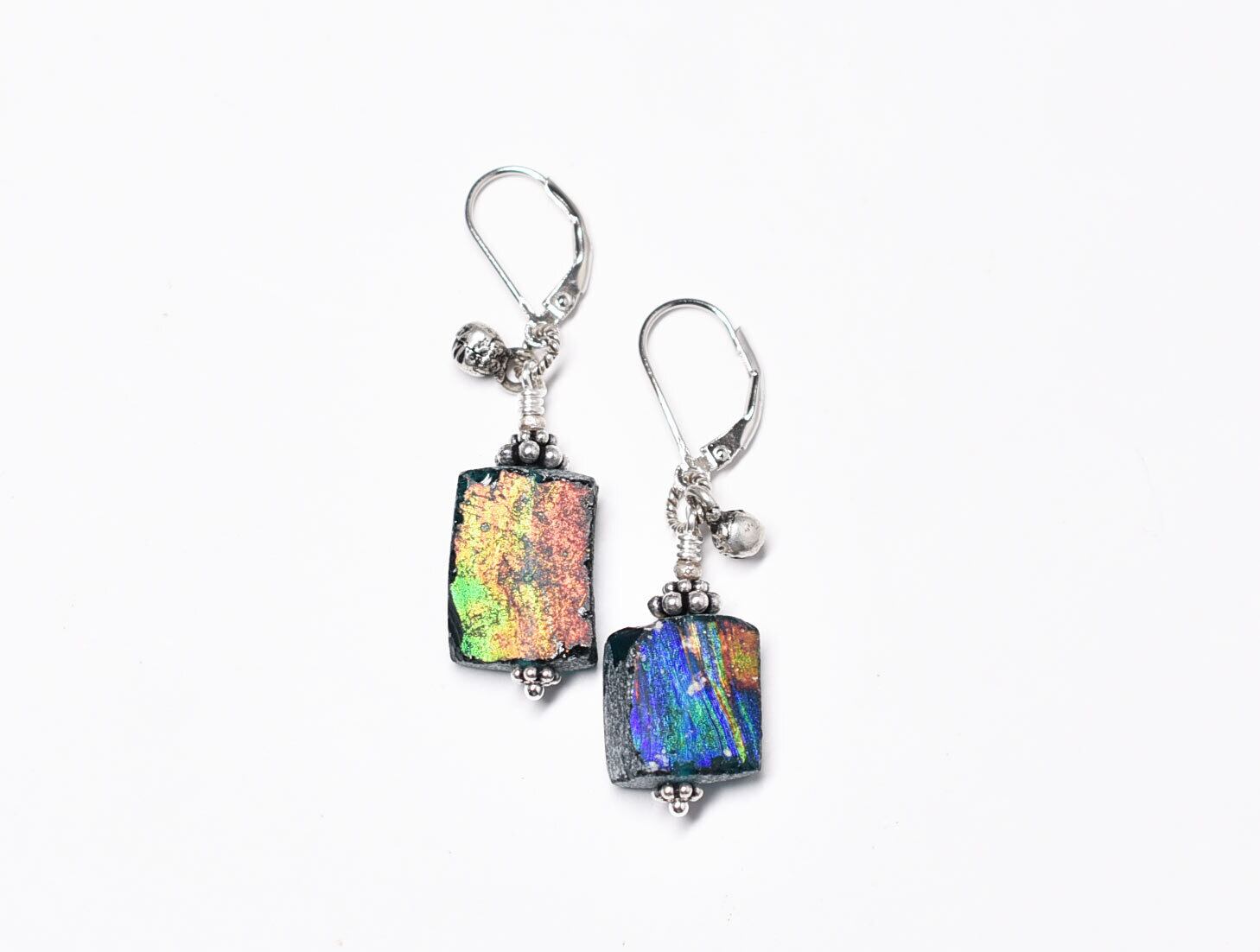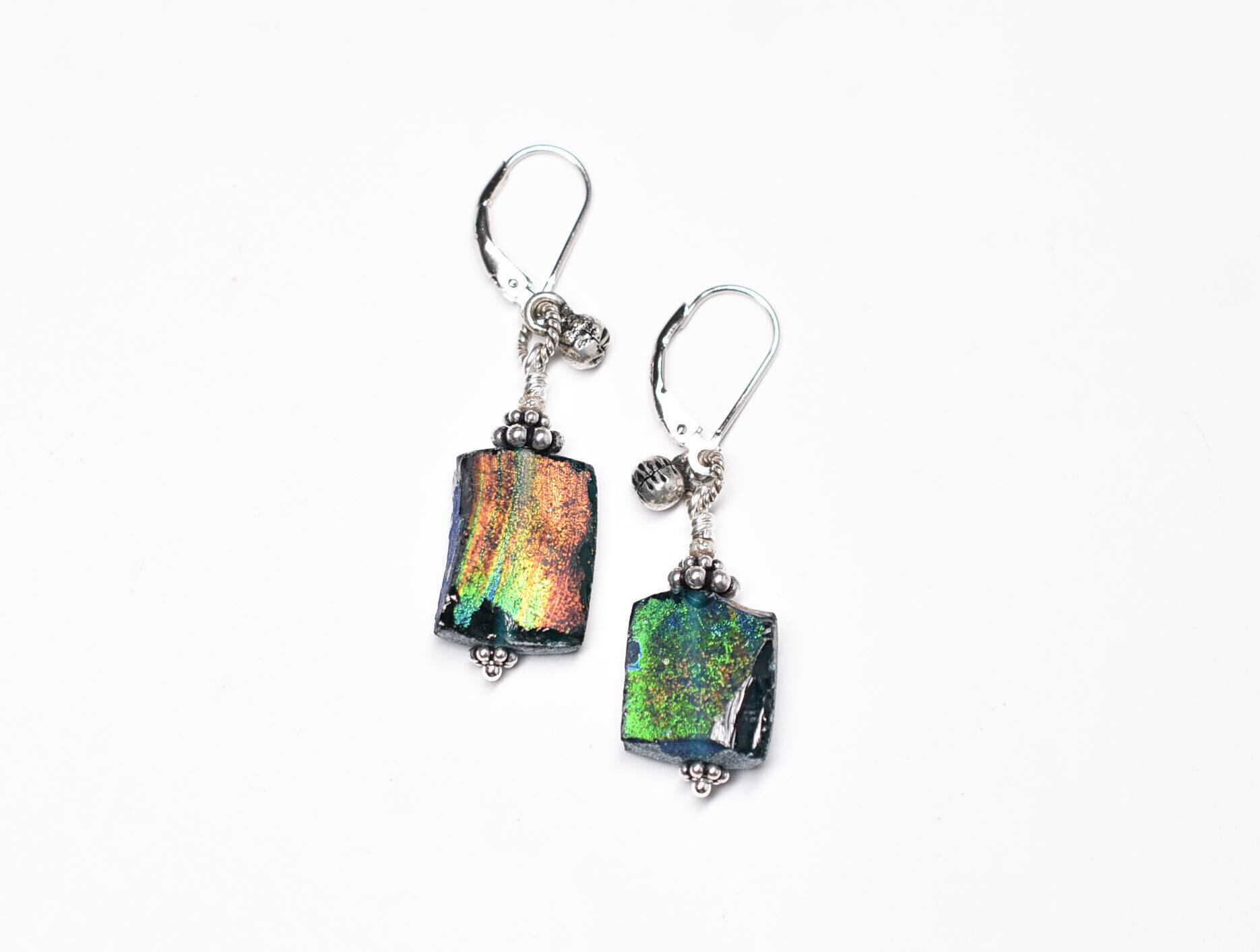 ブルーグリーン玉虫色銀化ローマングラスと小さなインドシルバー鈴のピアス