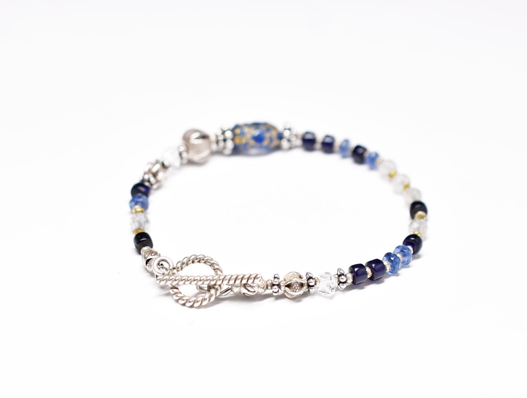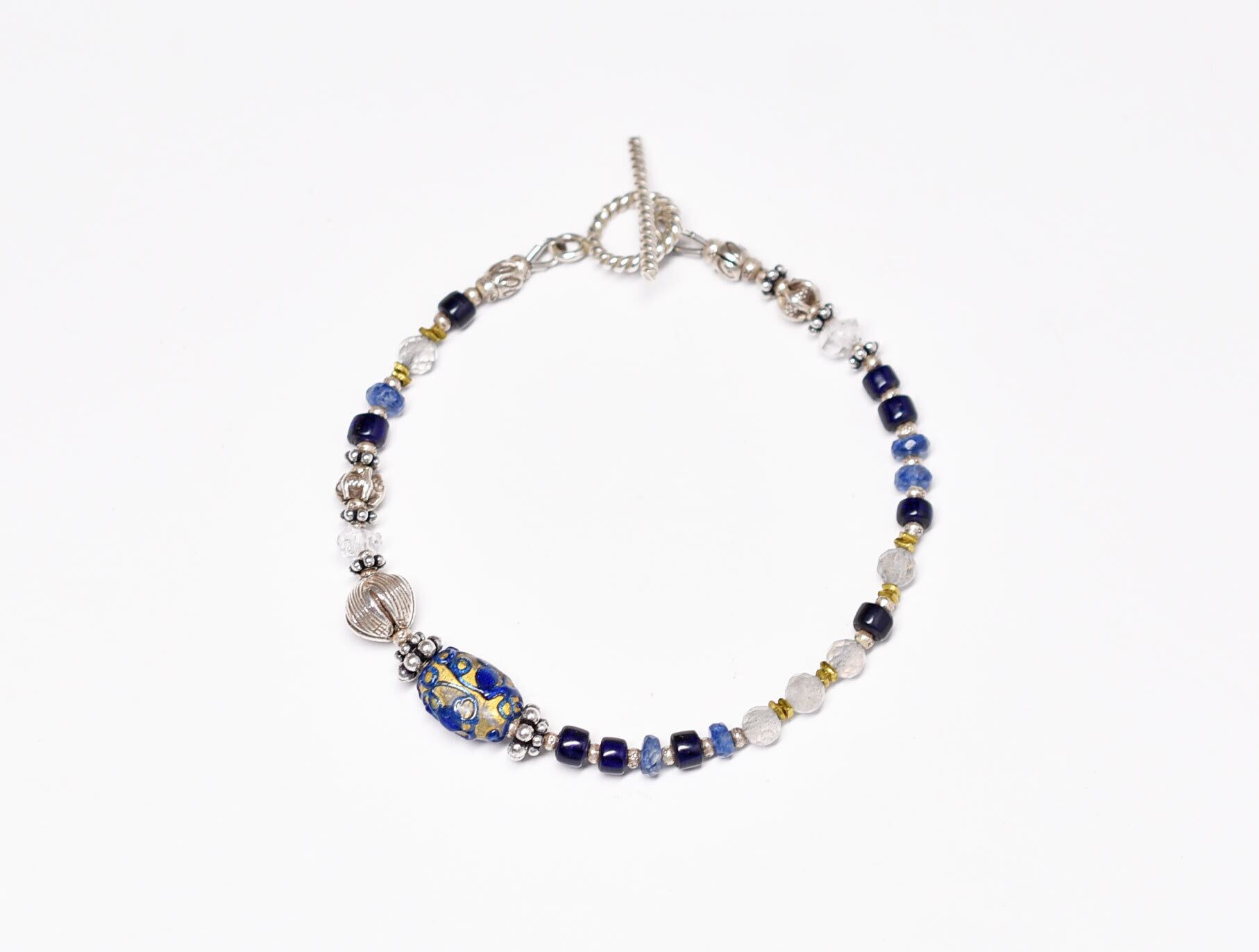 アンティーク瑠璃色トレイルデコレーションの金箔装飾ビーズと瑠璃色ビーズ、ラブラドライト、カイヤナイト、カレンシルバーのブレス