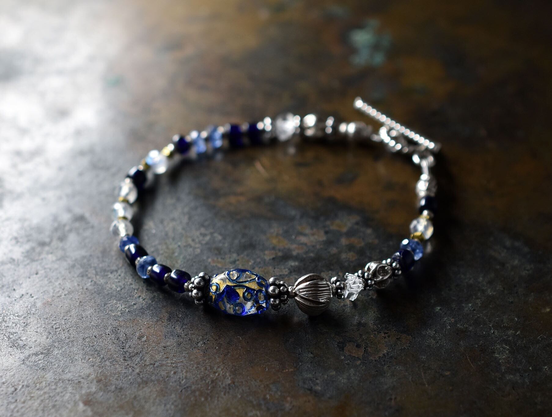 アンティーク瑠璃色トレイルデコレーションの金箔装飾ビーズと瑠璃色ビーズ、ラブラドライト、カイヤナイト、カレンシルバーを繋いだブレスです。