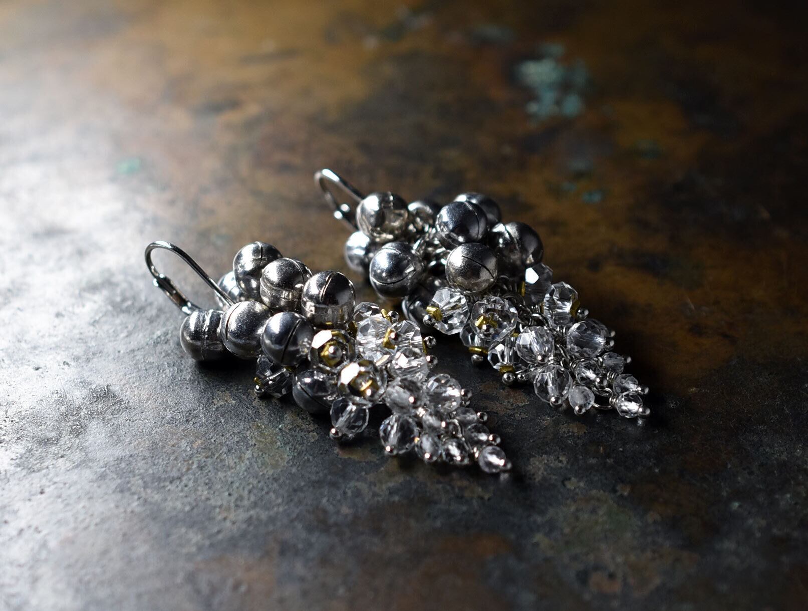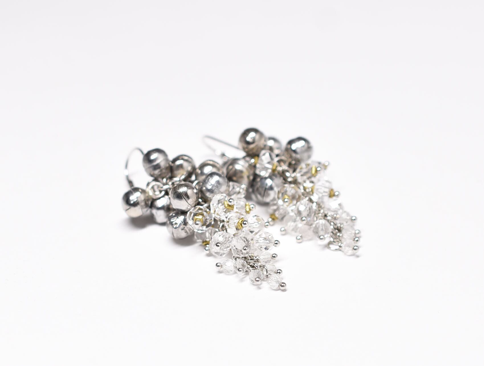 たわわな鈴と3種類のクォーツを繋いだ少しボリュームのあるピアスです。