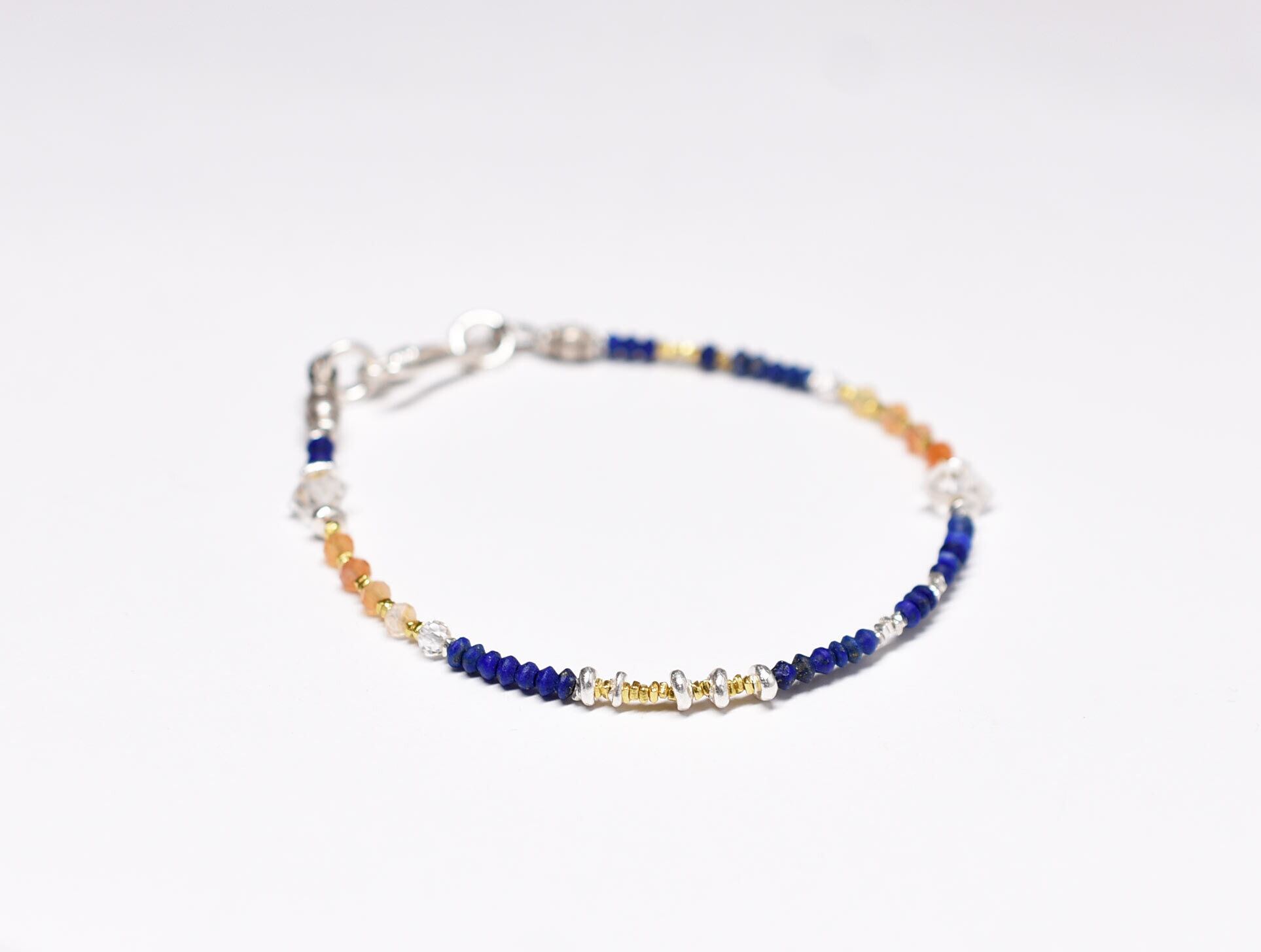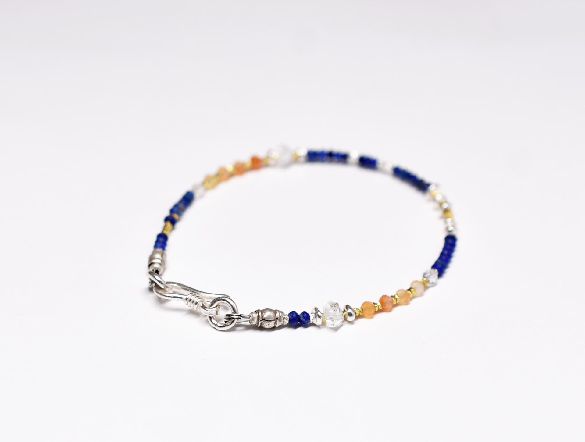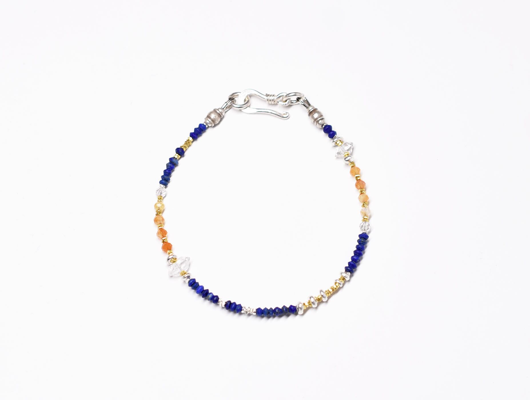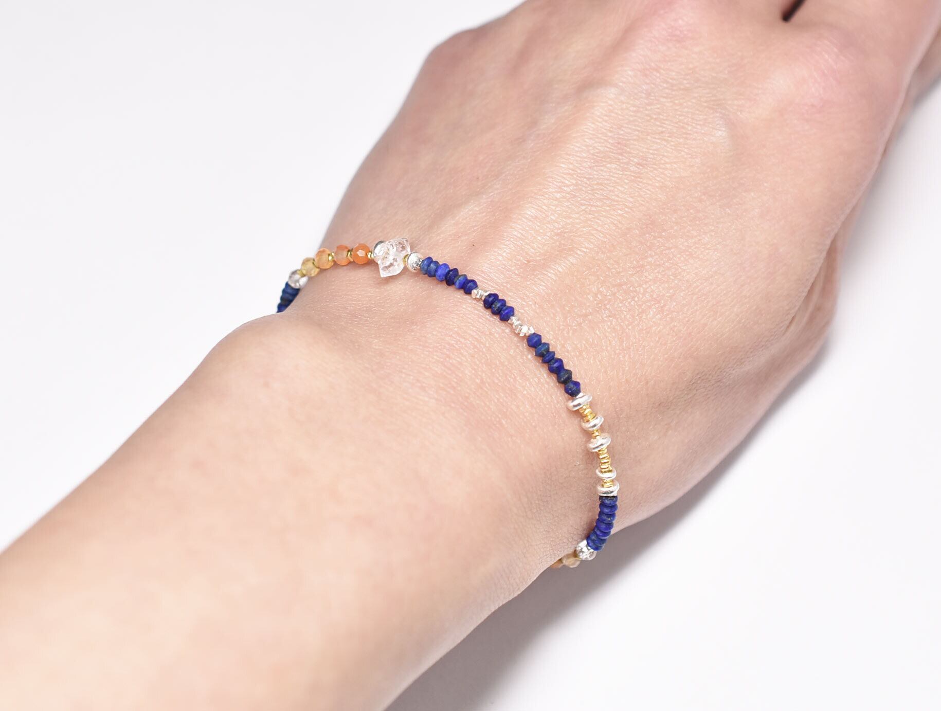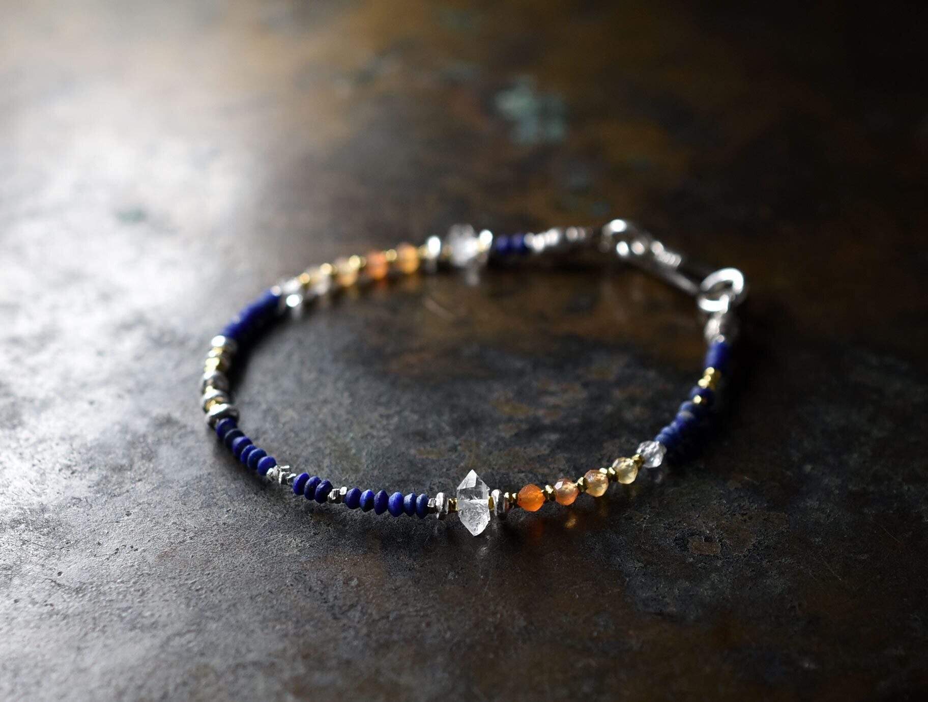 ラピスと、カーネリアンなどの小さな天然石、ハーキマーダイヤモンド、カレンシルバーを繋いだ華奢なブレスです。