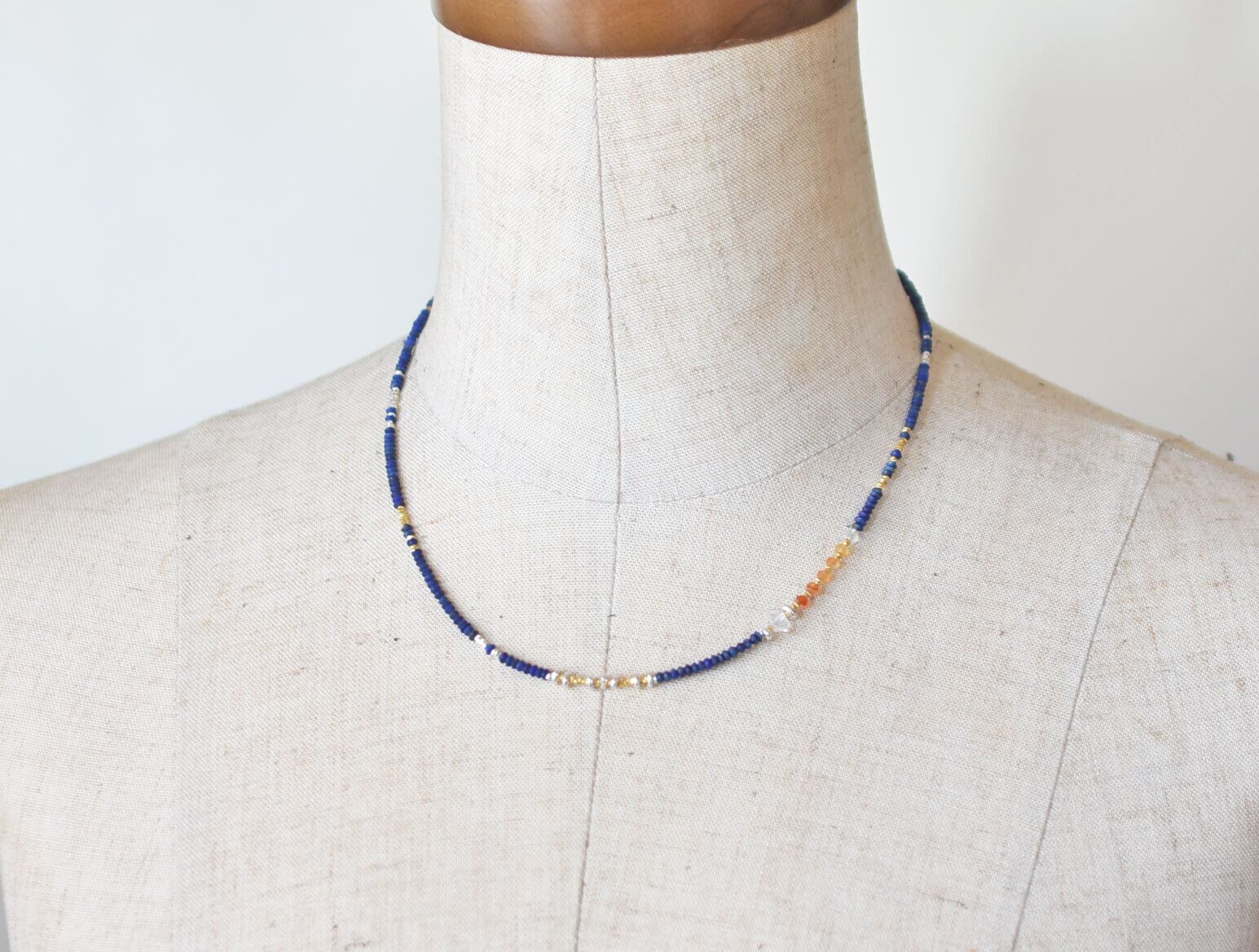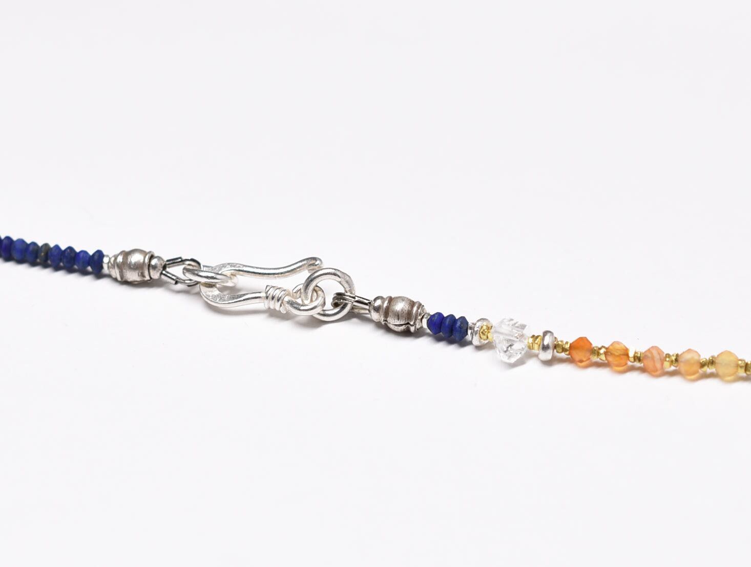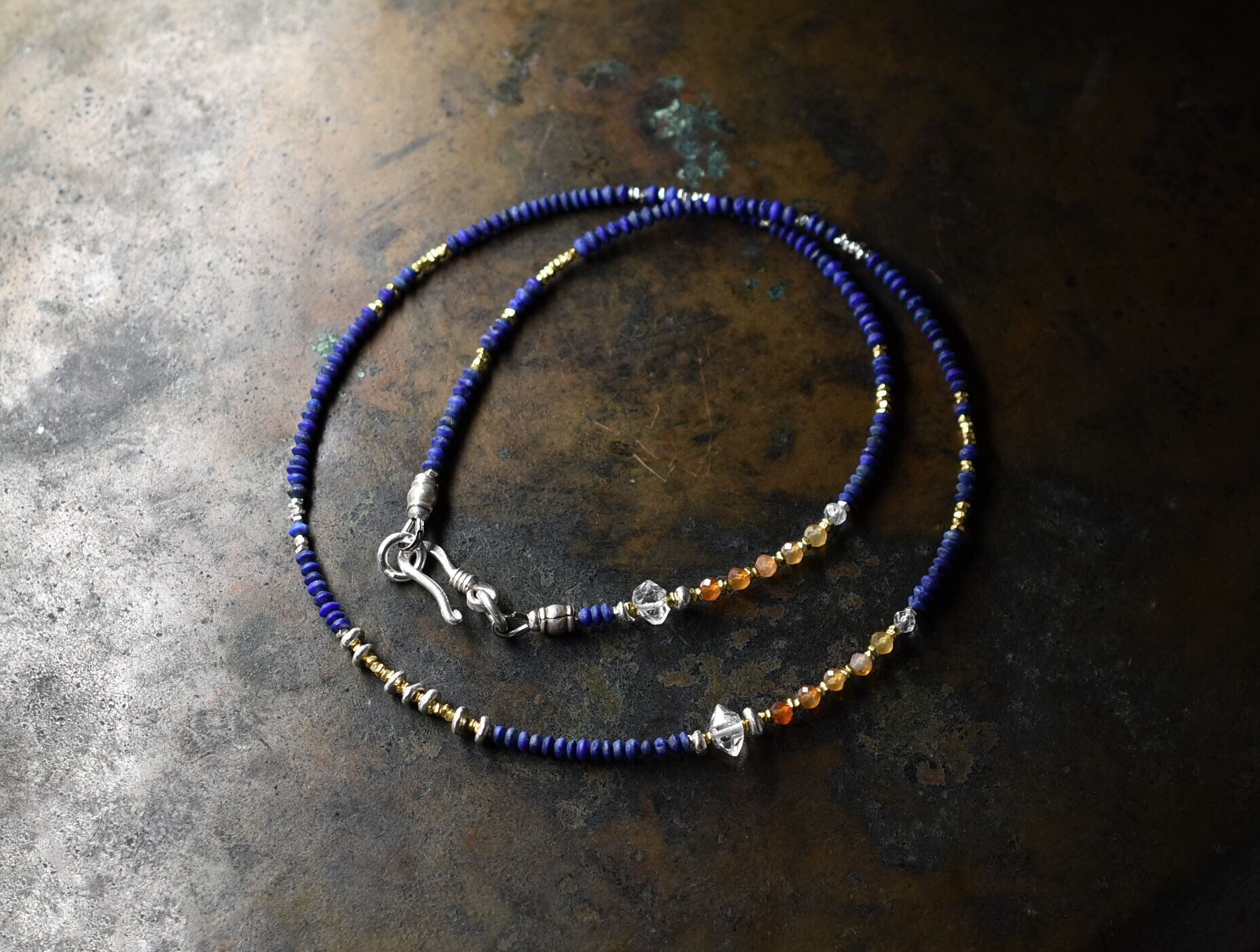 ラピスと、カーネリアンなどの小さな天然石、ハーキマーダイヤモンド、カレンシルバーを繋いだ華奢なネックレスです。