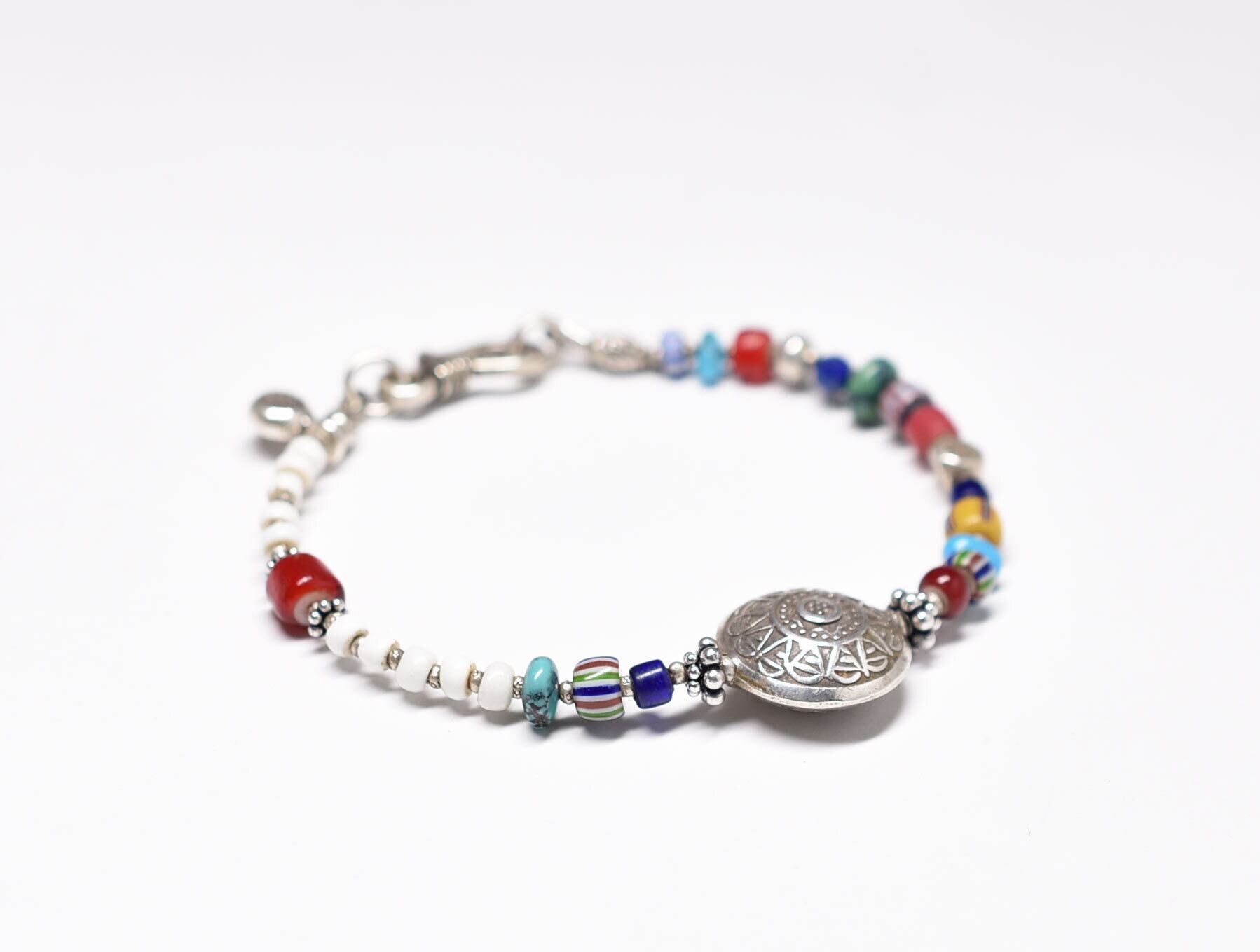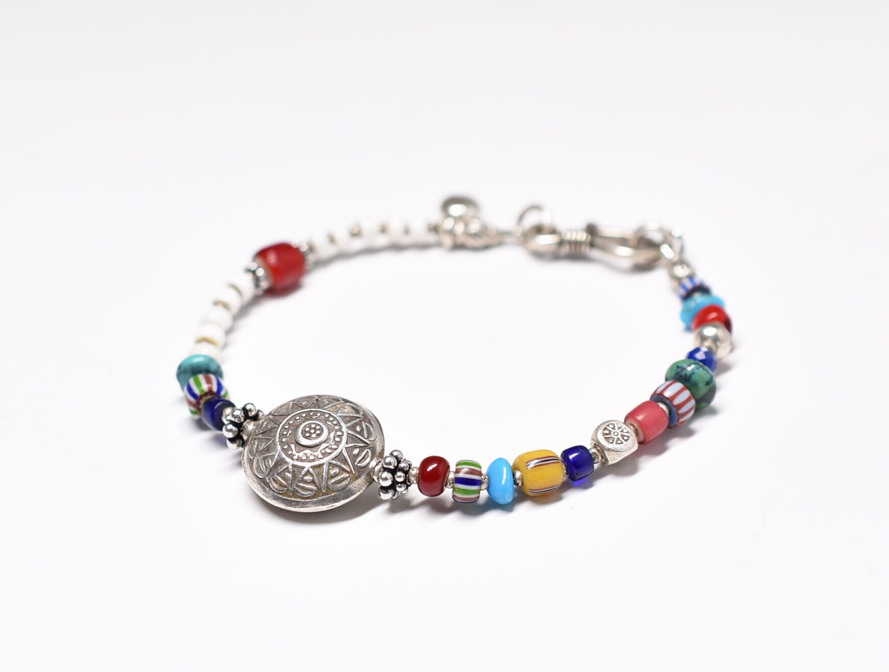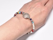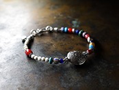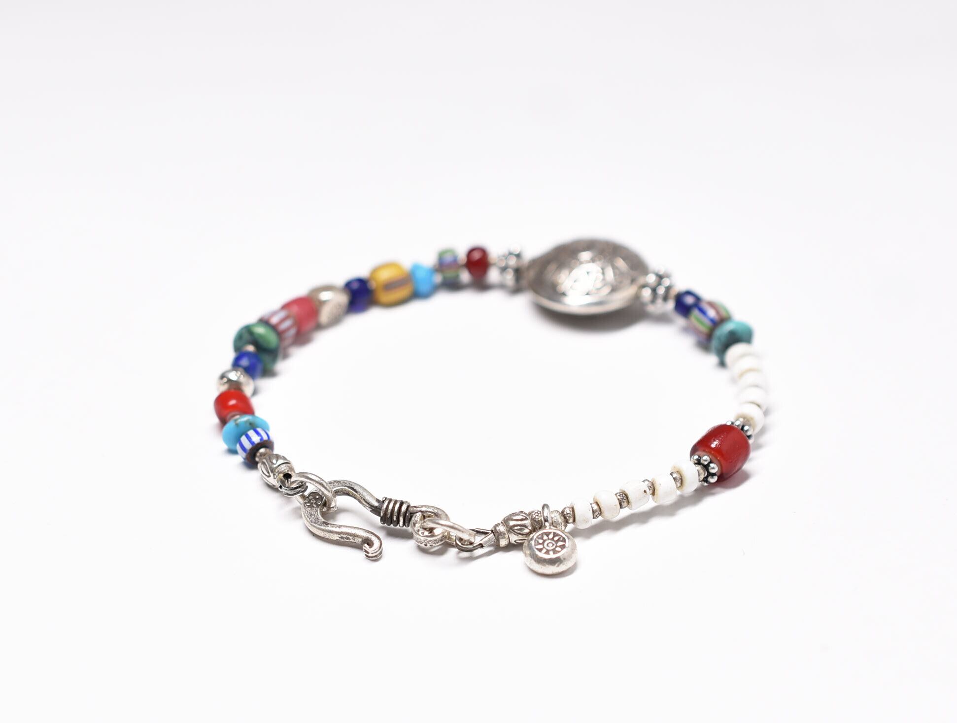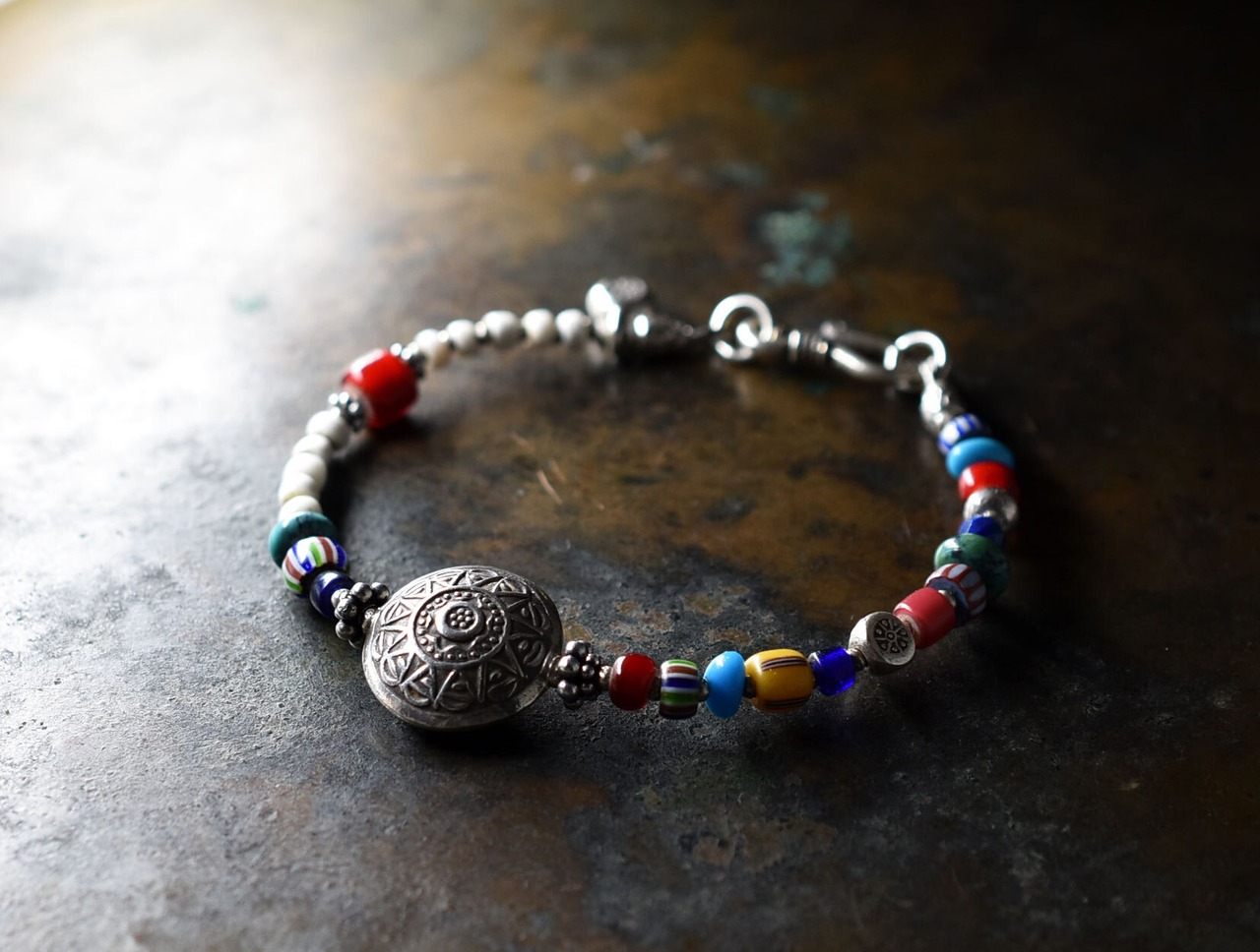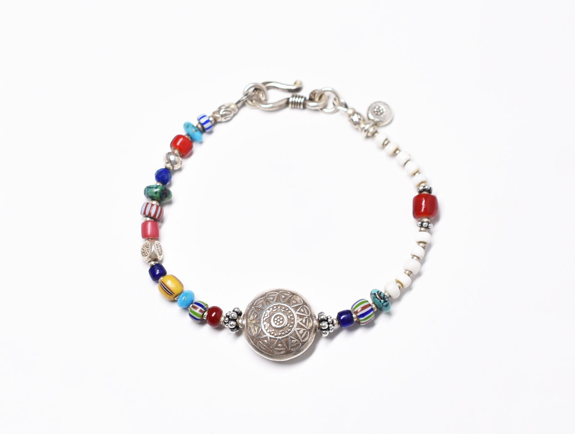 魔法陣のようなカレンシルバーをトップに、色んなベネチア産のアンティークビーズや天然石、カレンシルバービーズをミックスした賑やかなブレスです。