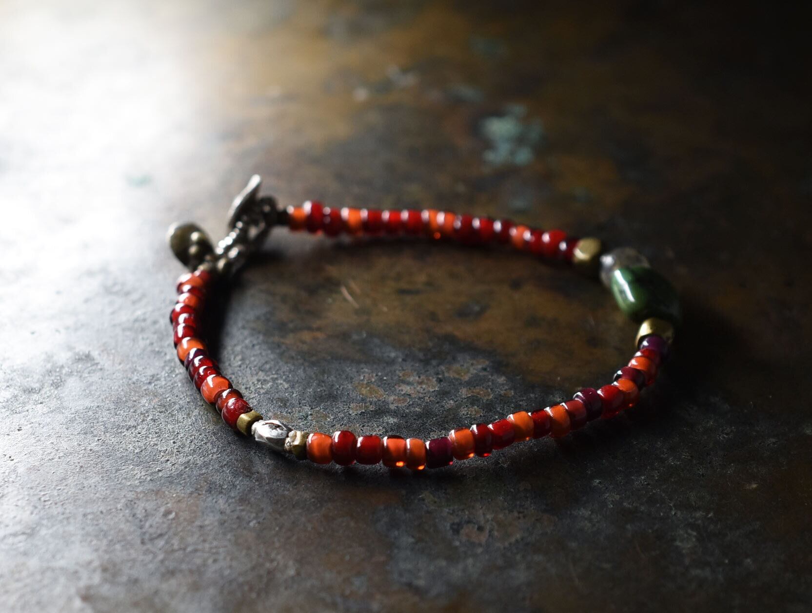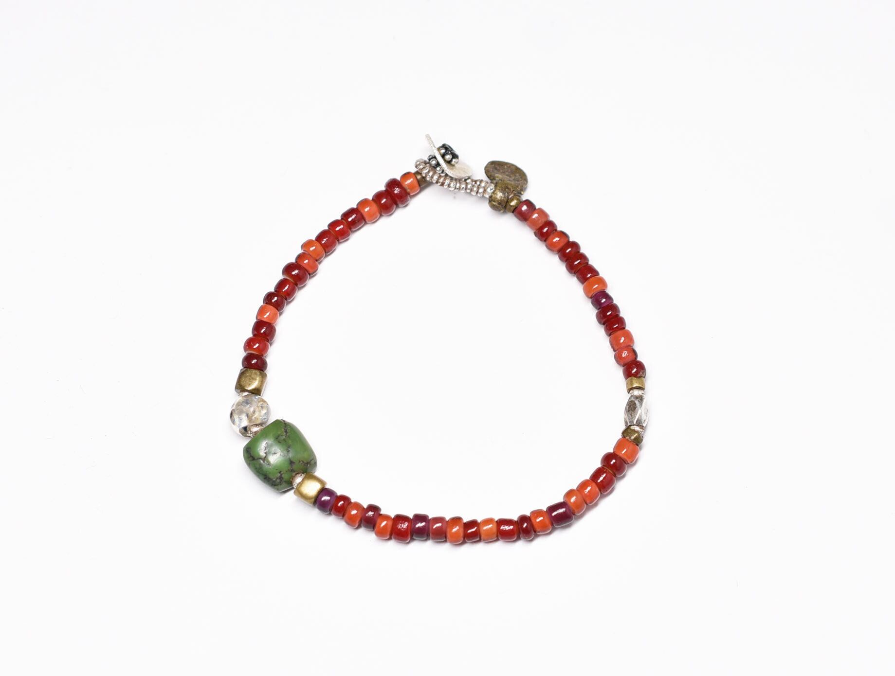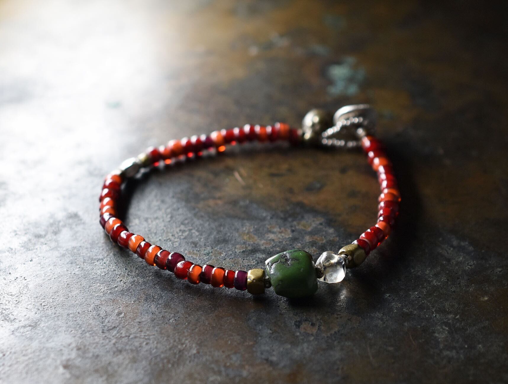 oldチベタンターコイズと古代施釉水晶、oldチンシルバー、oldオリッサブラス、血赤&金赤ホワイトハーツを繋いだブレスです。