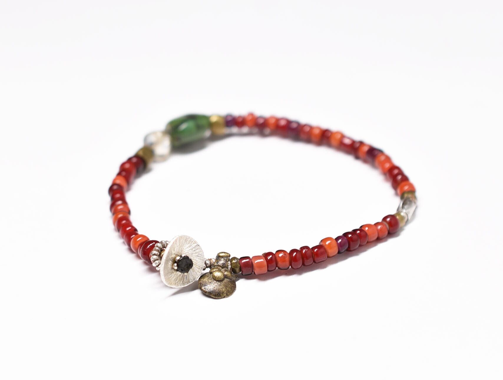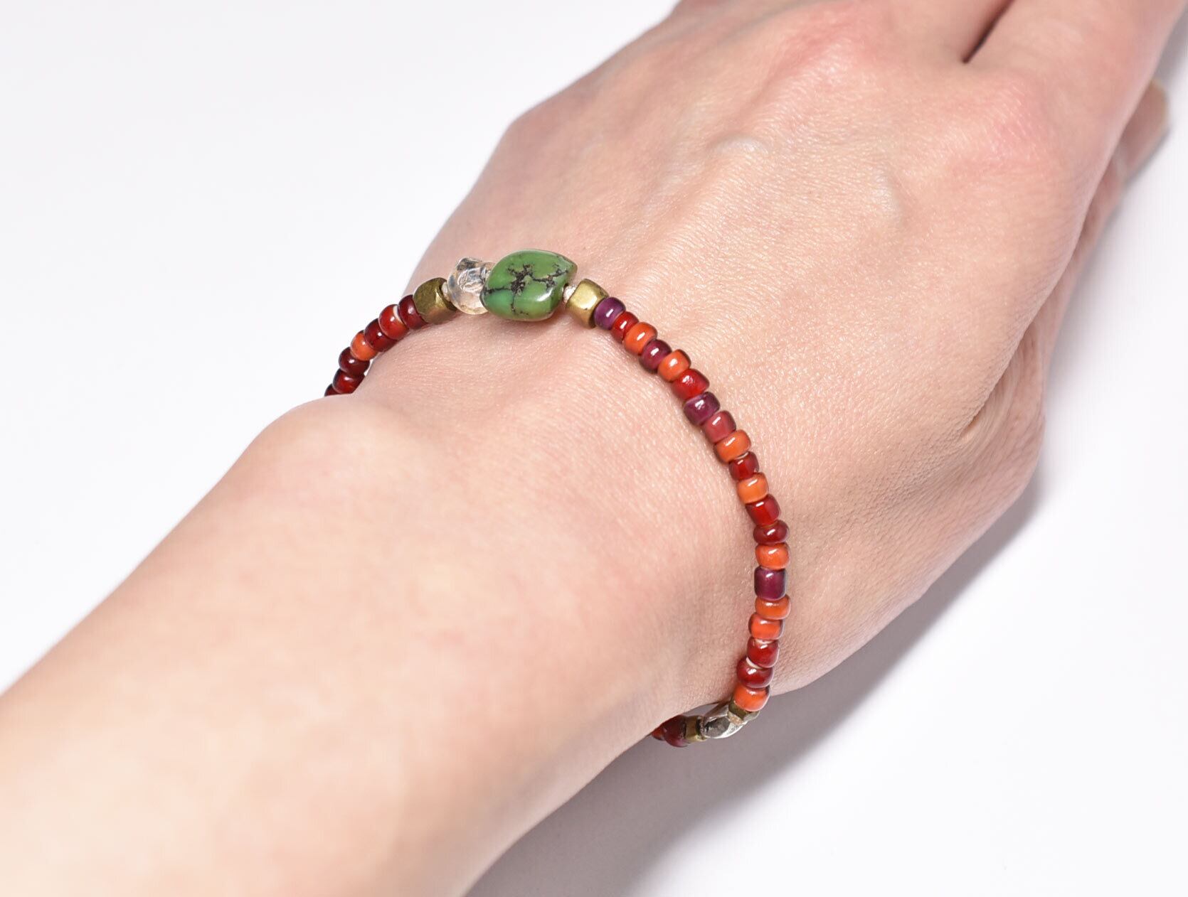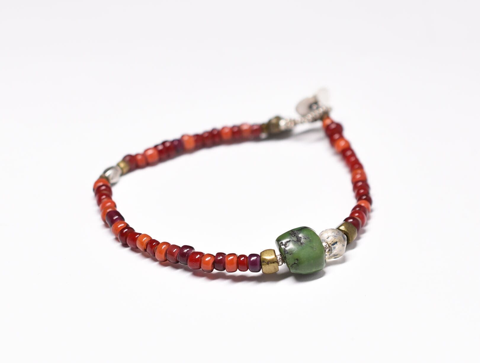 oldチベタンターコイズと古代施釉水晶、oldチンシルバー、oldオリッサブラス、血赤&金赤ホワイトハーツを繋いだブレスです。