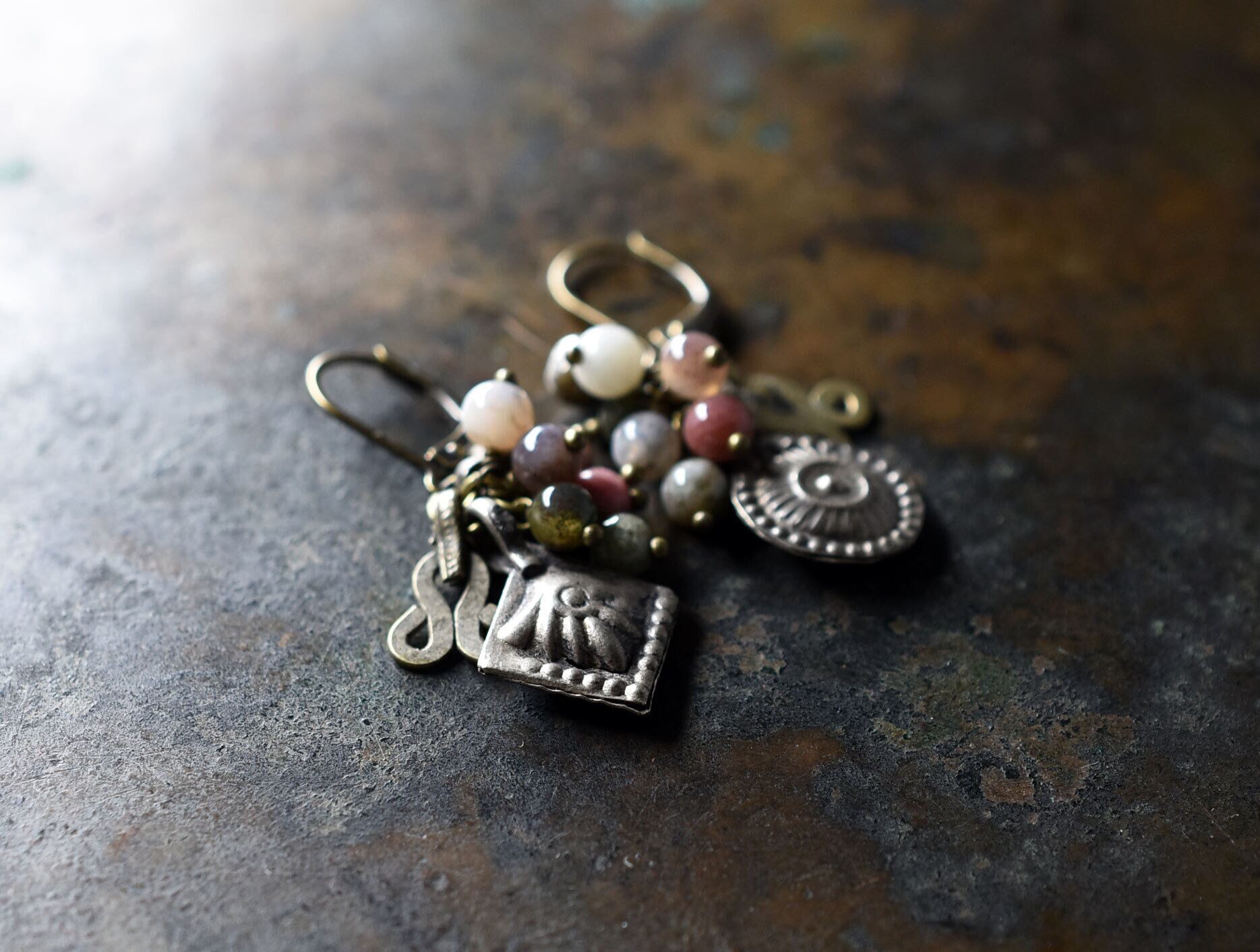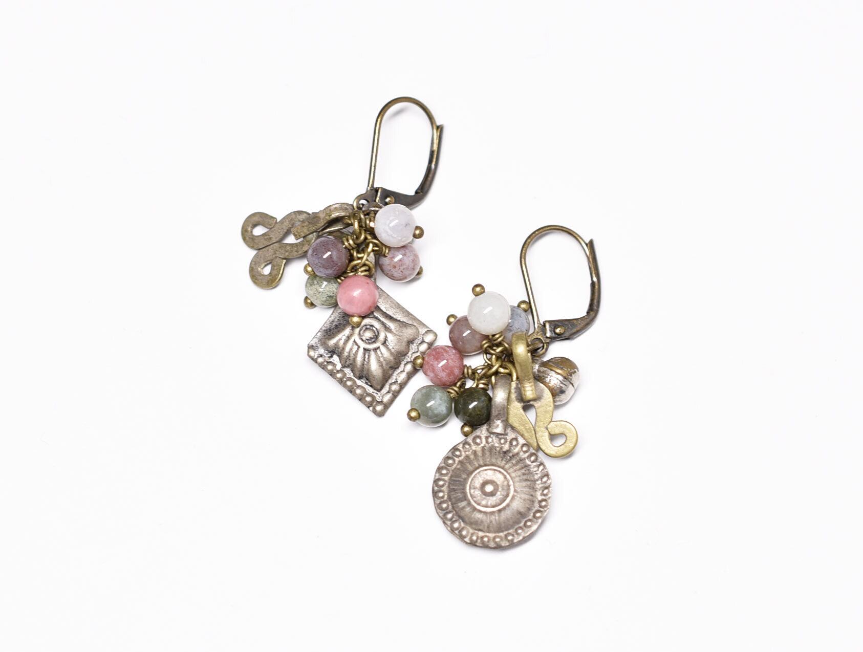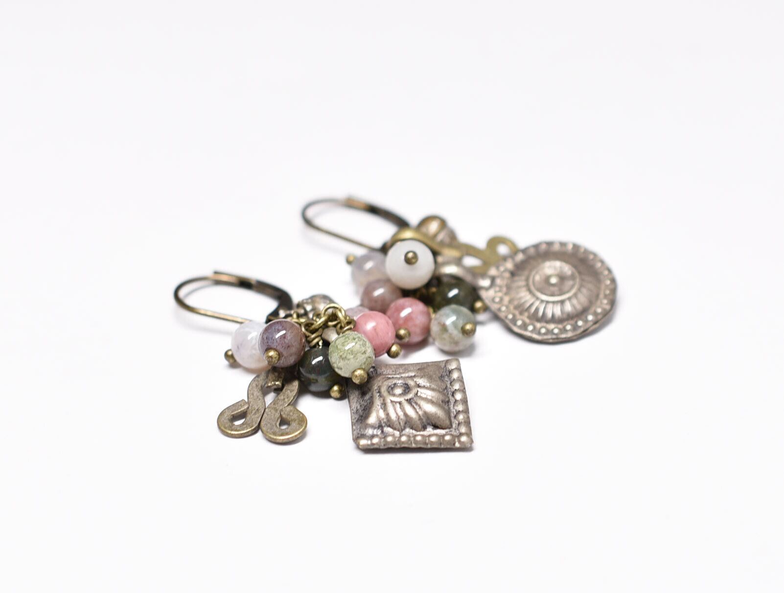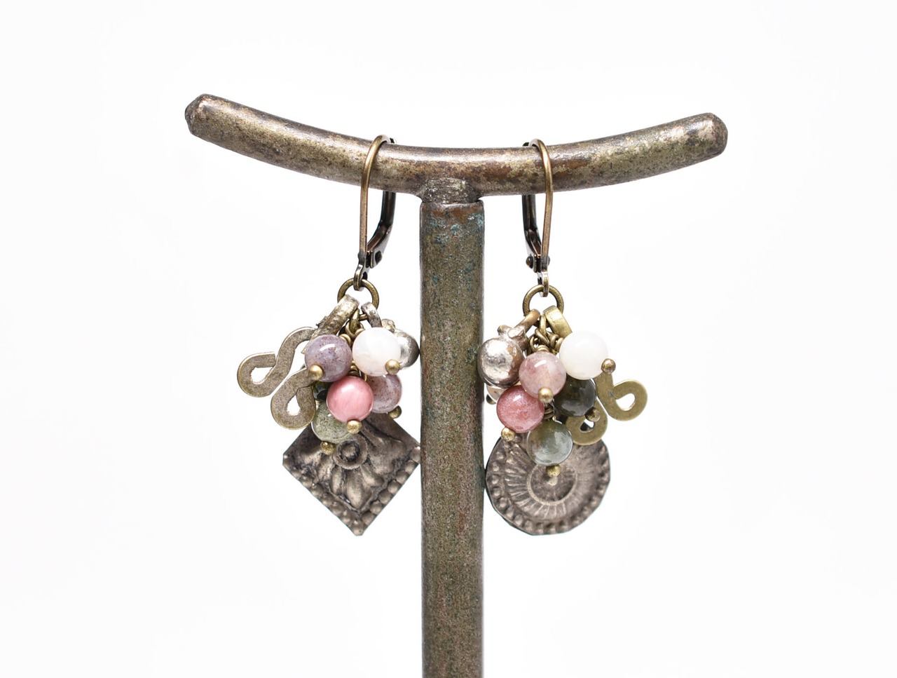 アフガンメタルと鈴、たわわなまん丸ストーンビーズを繋いだピアスです。