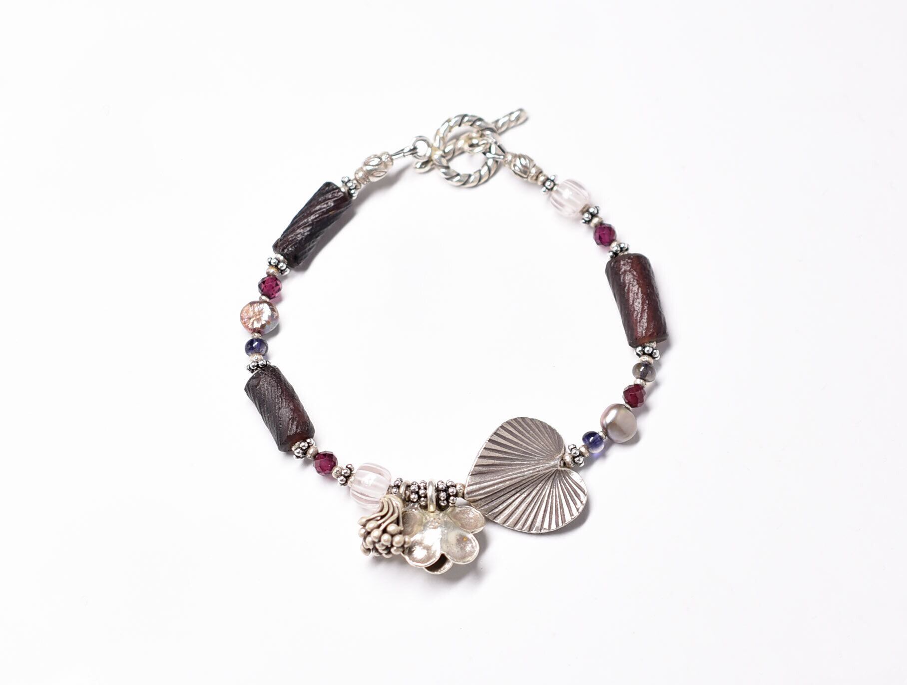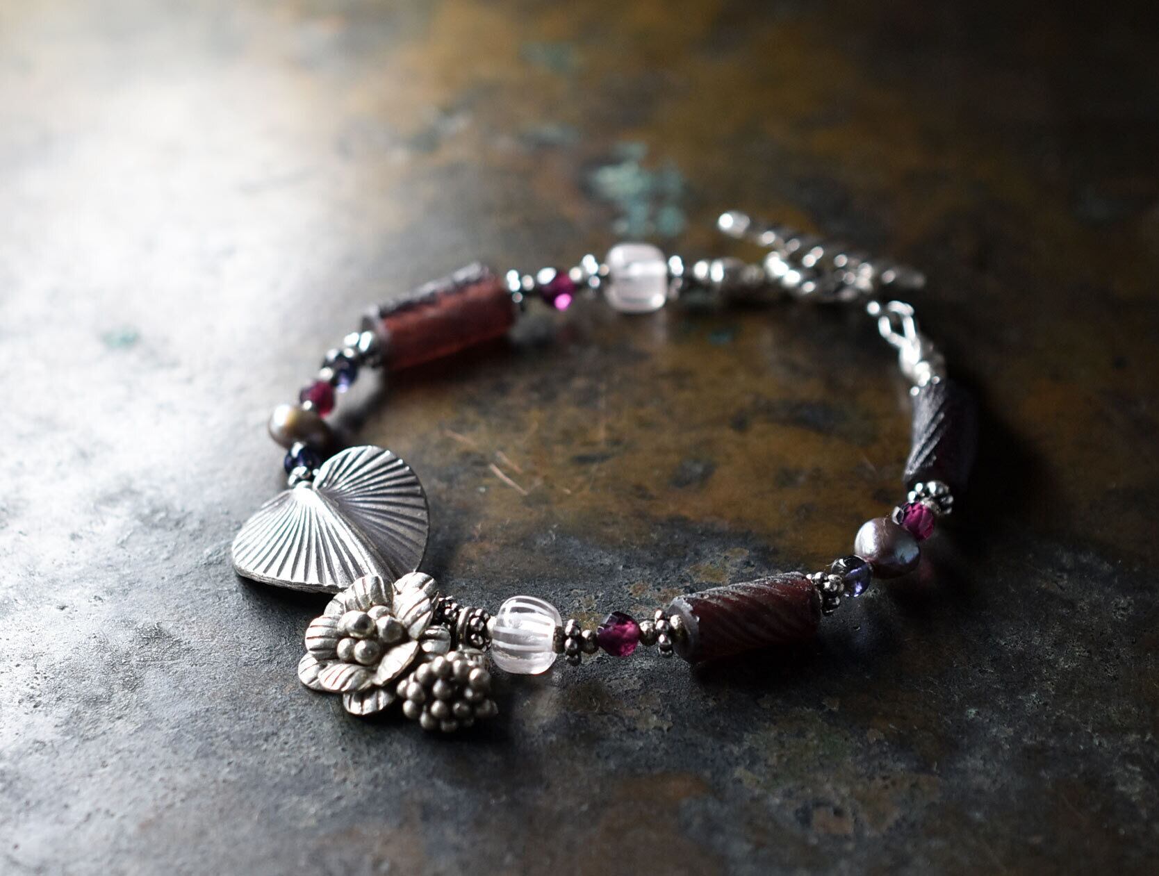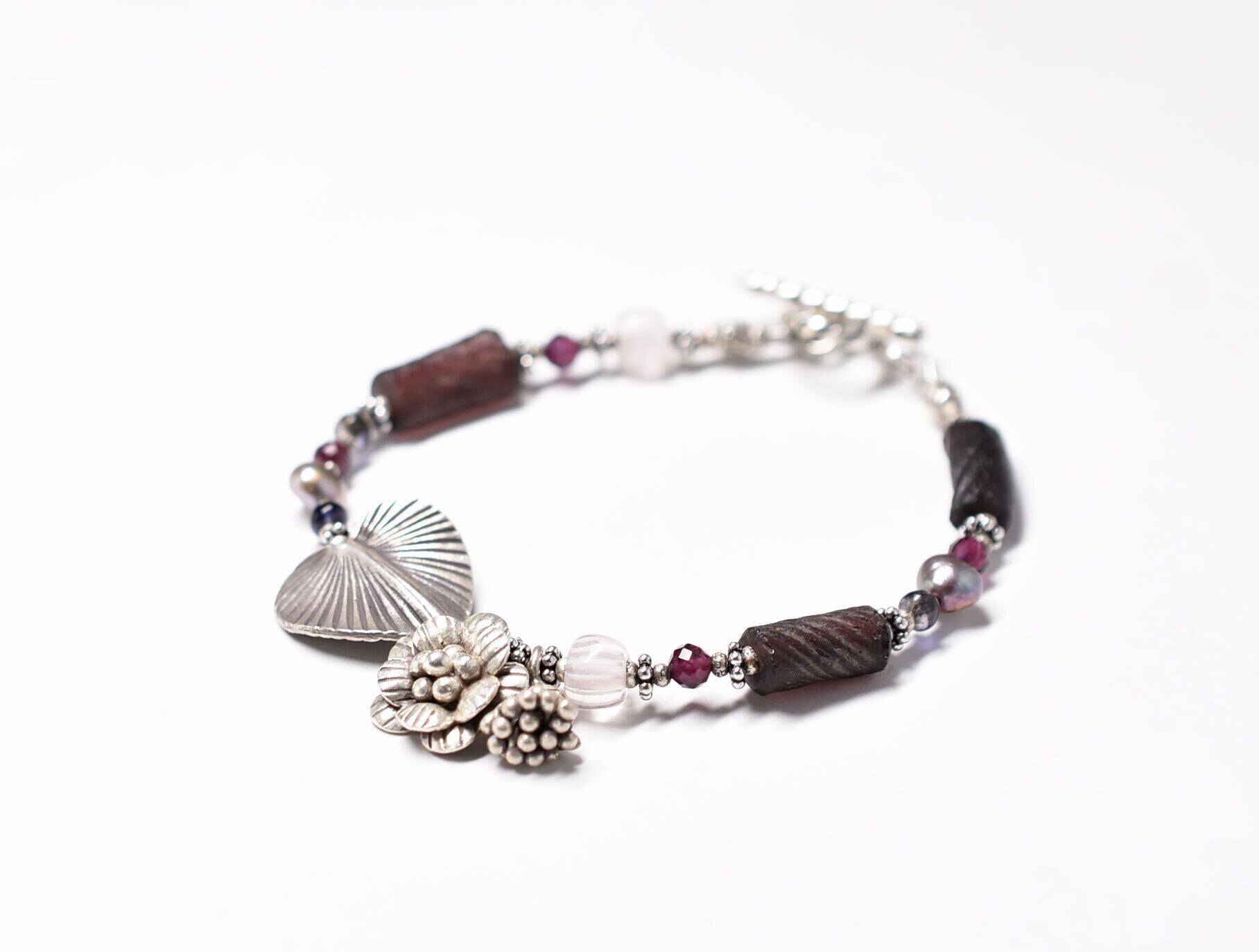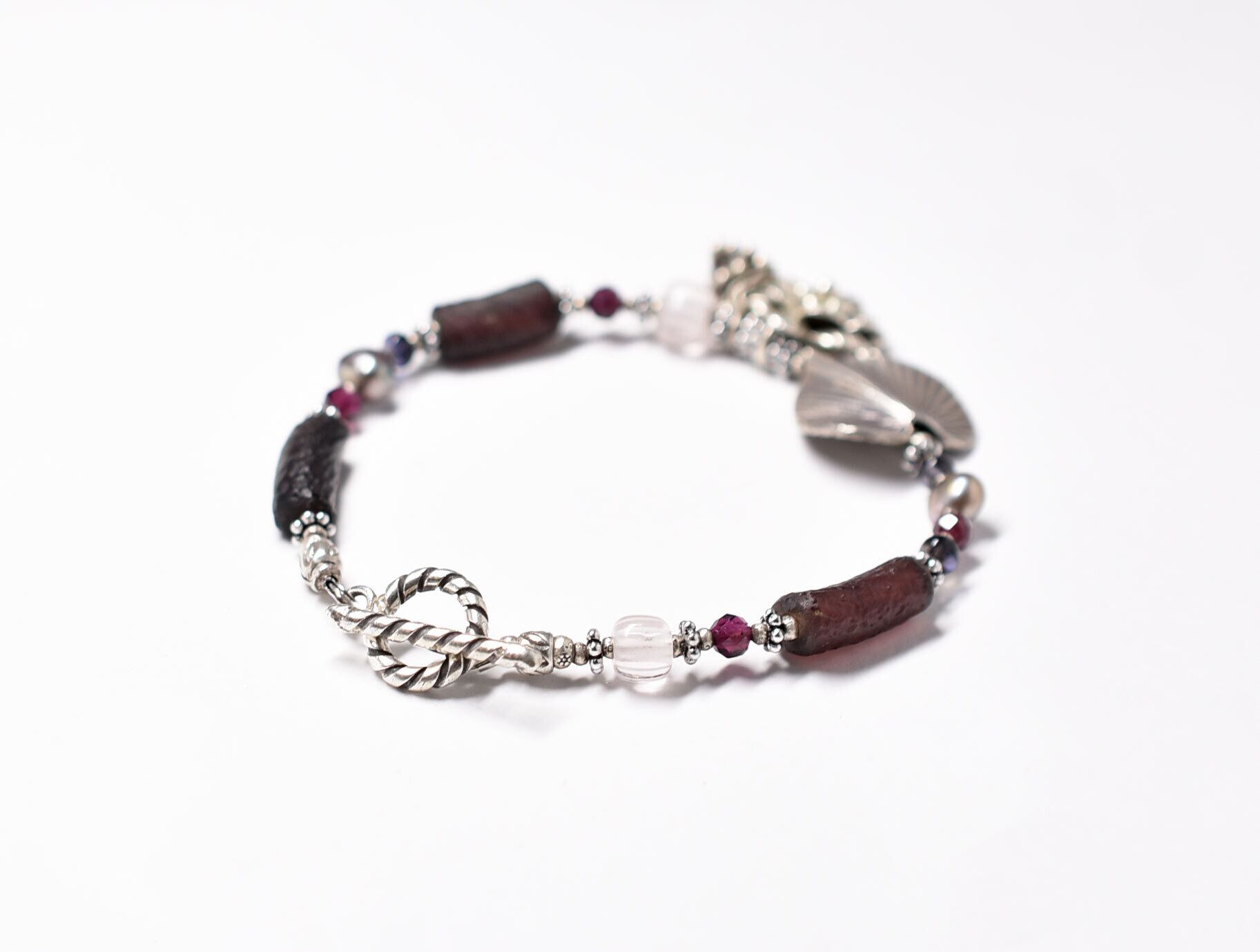 素材:ガラス、カレンシルバー、ガーネット、アイオライト、淡水パール、ワイヤー