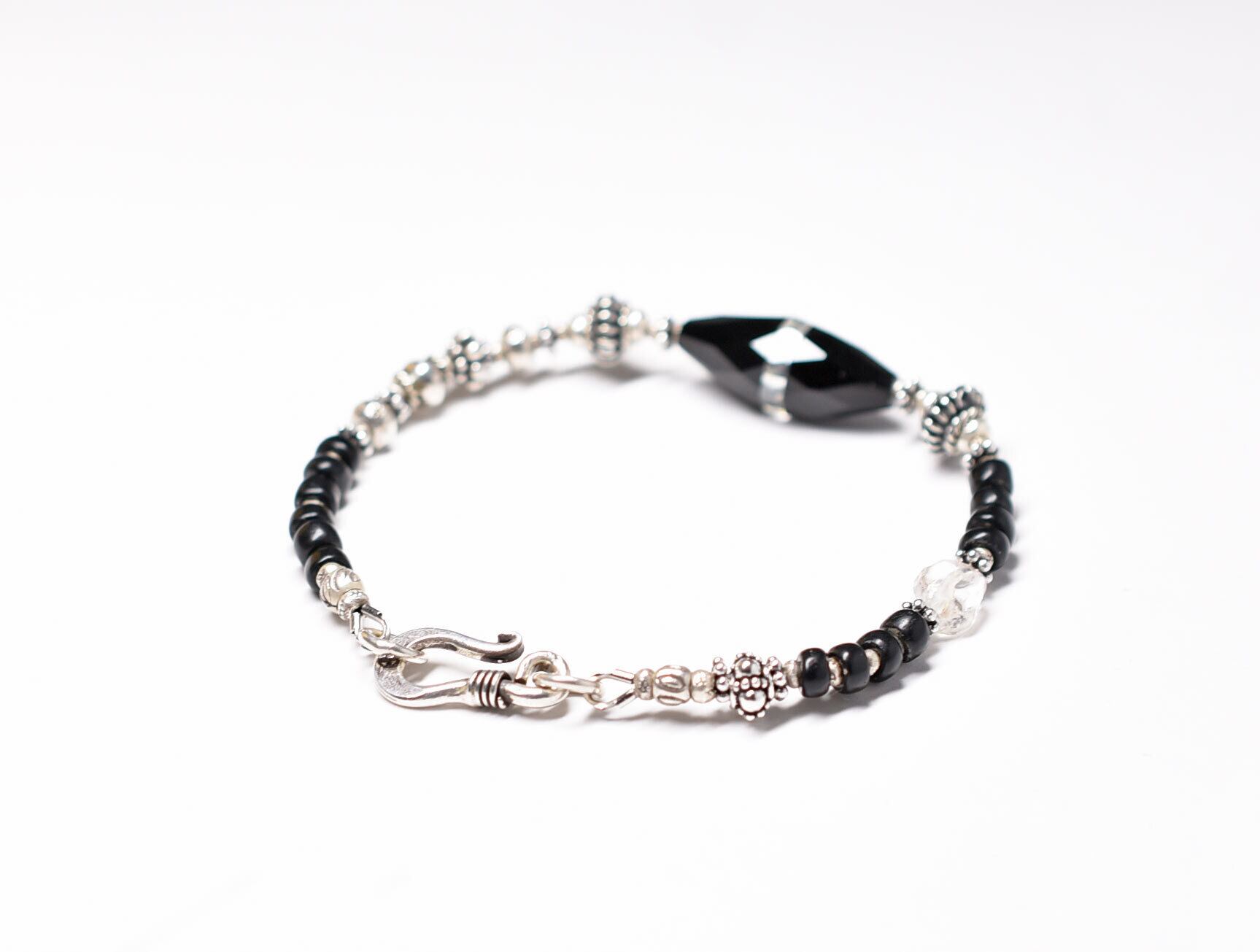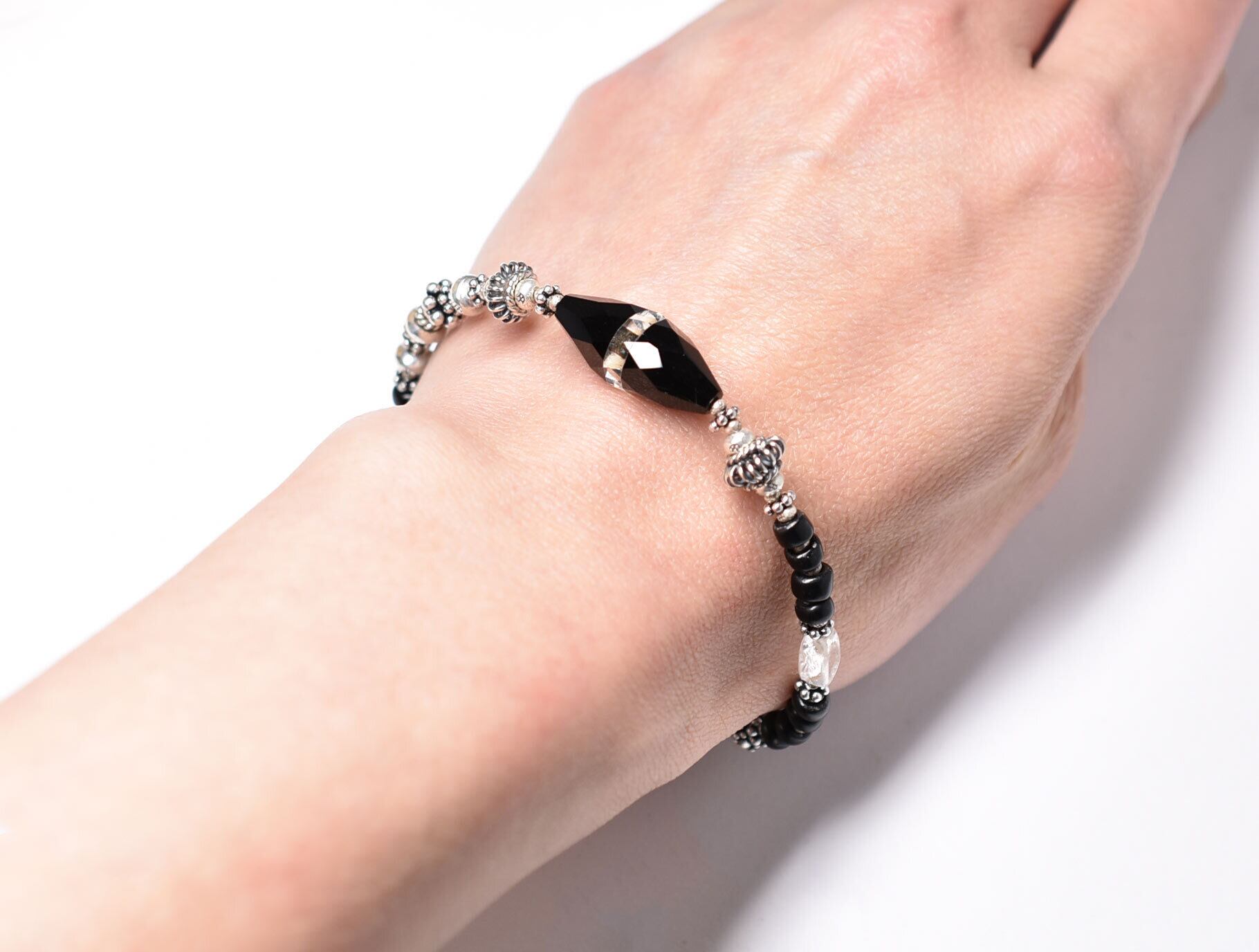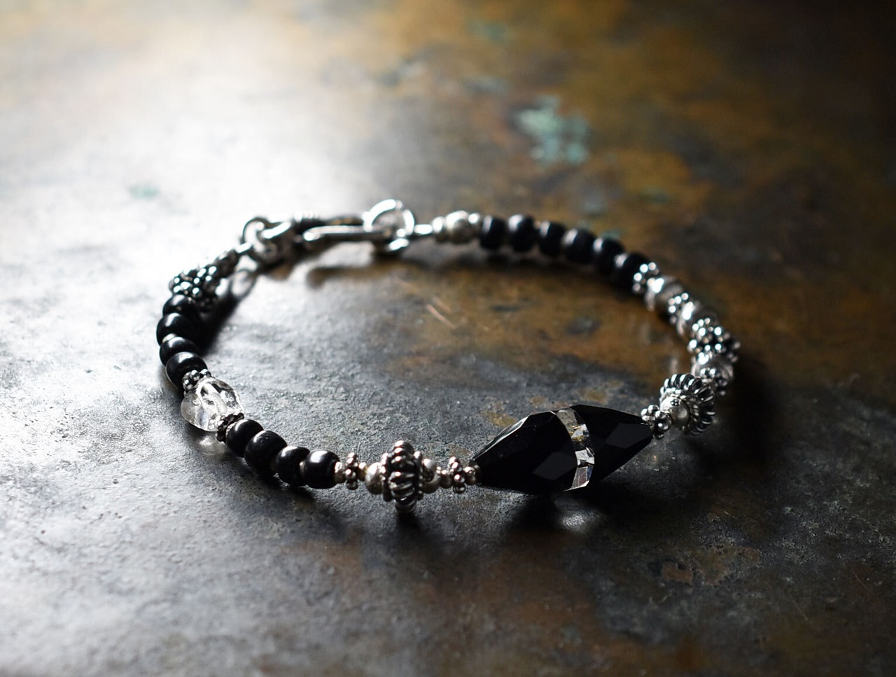 モノトーンオールドスワロと古代水晶、多彩カレンシルバーと漆黒ビーズを繋いだブレスです。