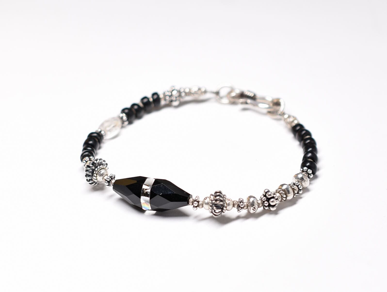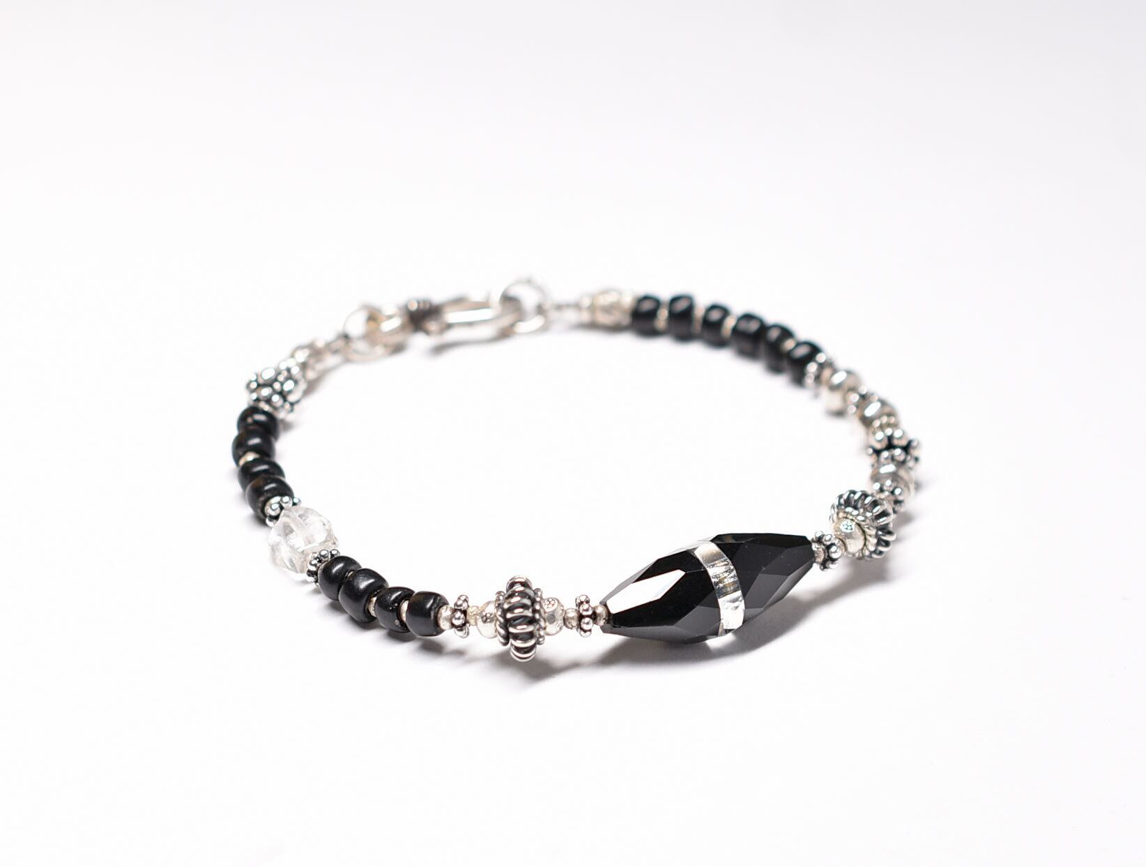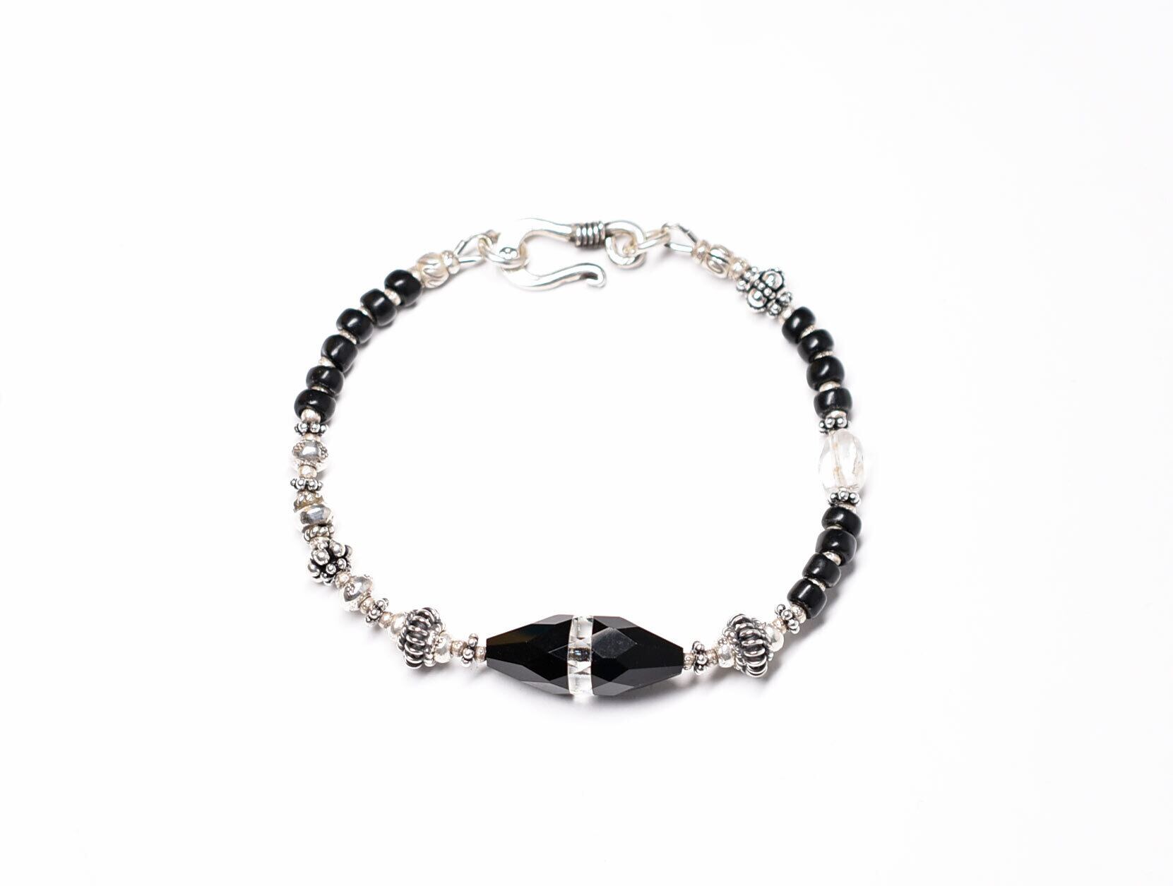 モノトーンオールドスワロと古代水晶、多彩カレンシルバーと漆黒ビーズを繋いだブレスです。