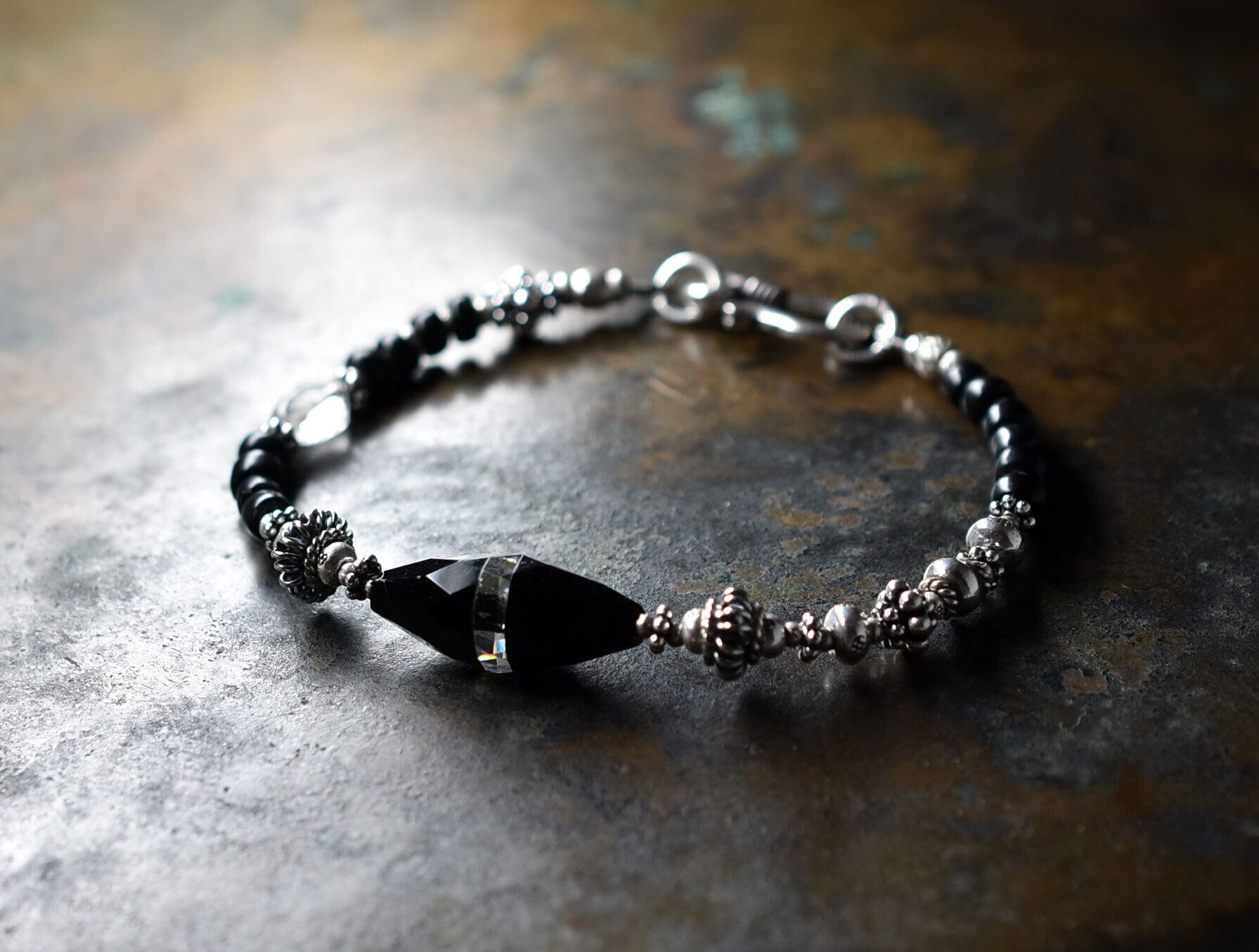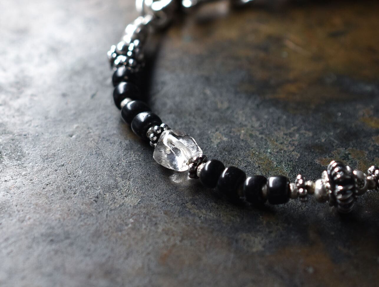 モノトーンオールドスワロと古代水晶、多彩カレンシルバーと漆黒ビーズのブレス
