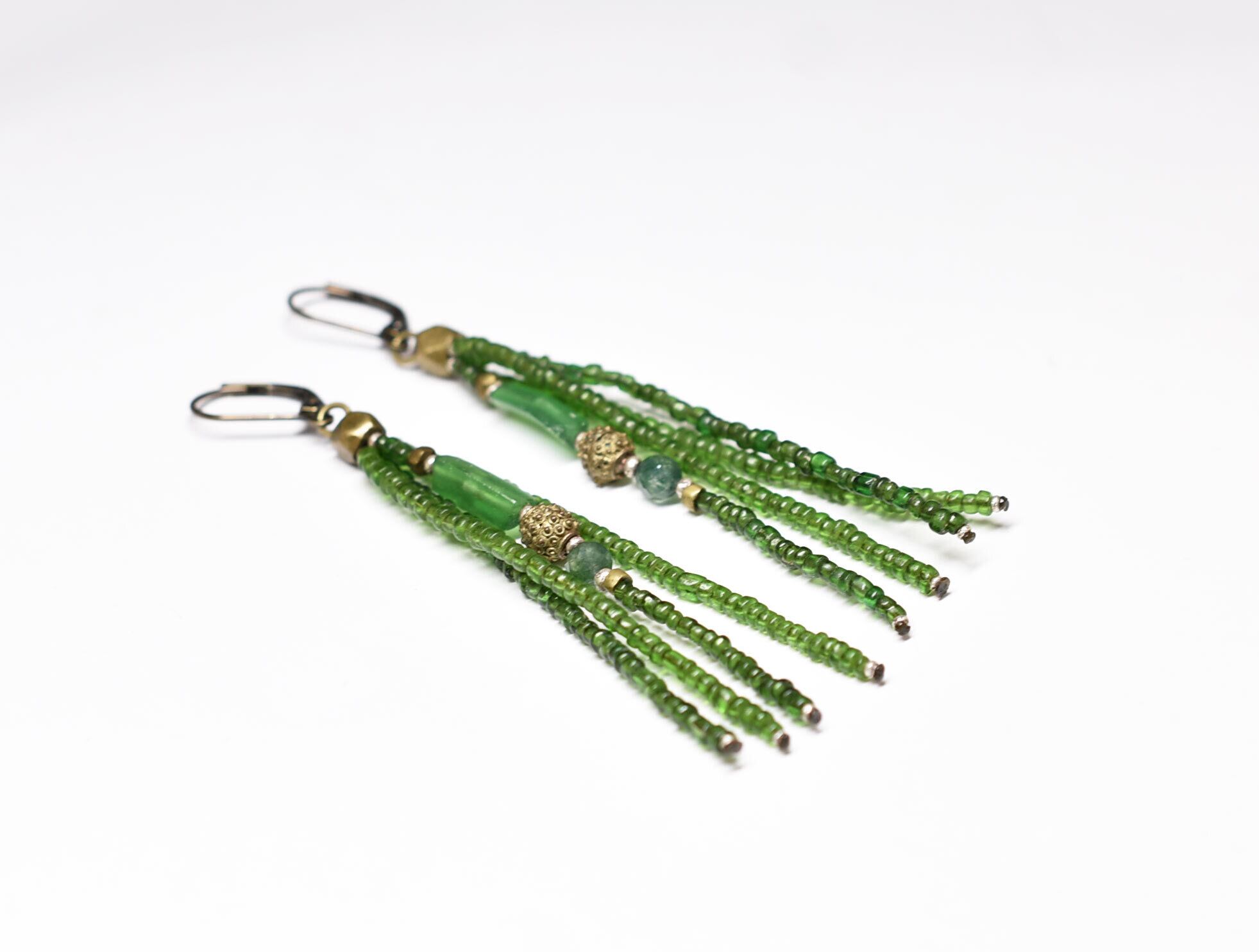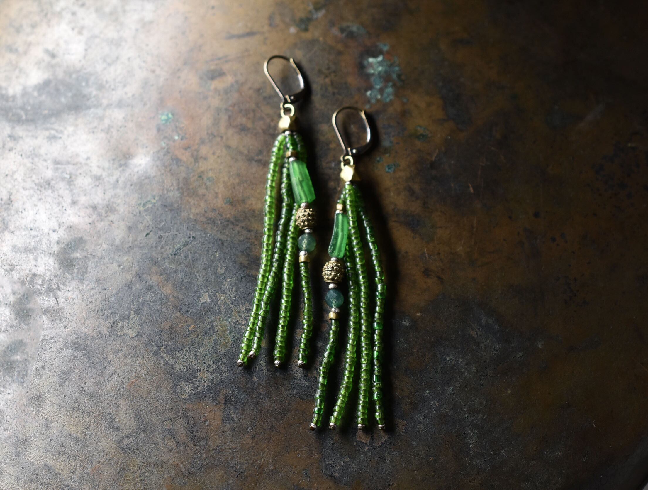 グリーンのシードビーズ、ローマングラス、モスアゲート、ツブツブブラス、oldオリッサブラスなどで繋いだ4連のピアスです。