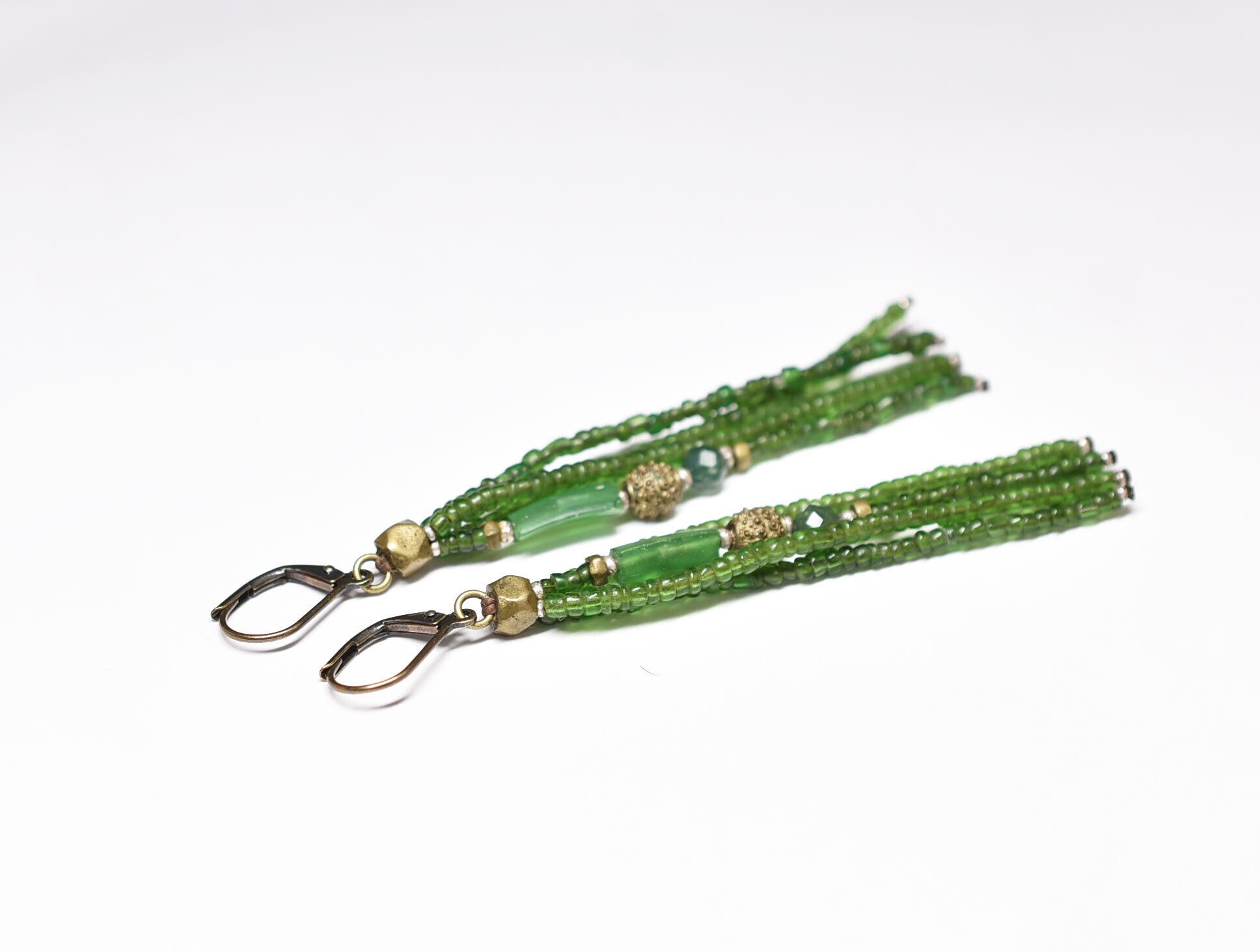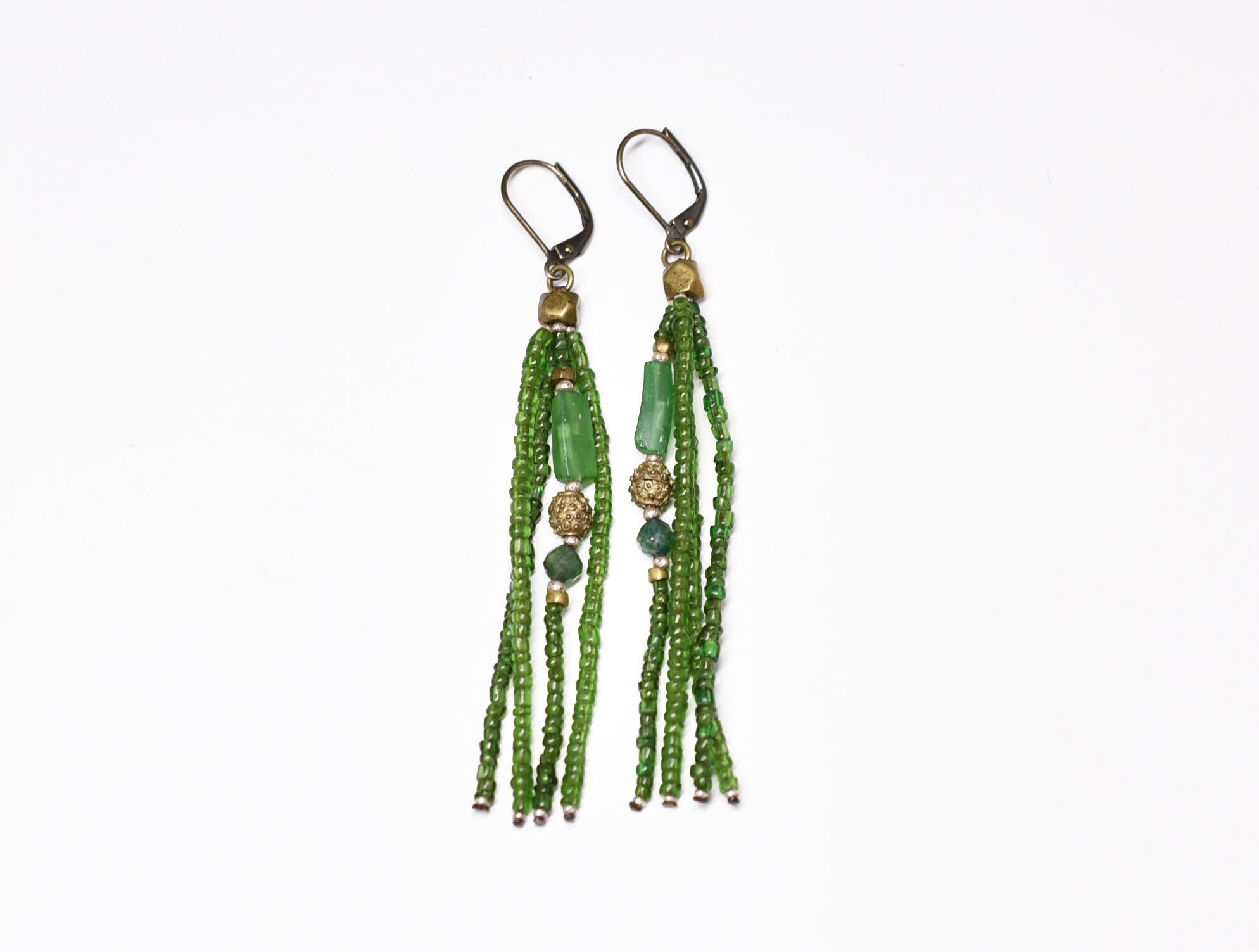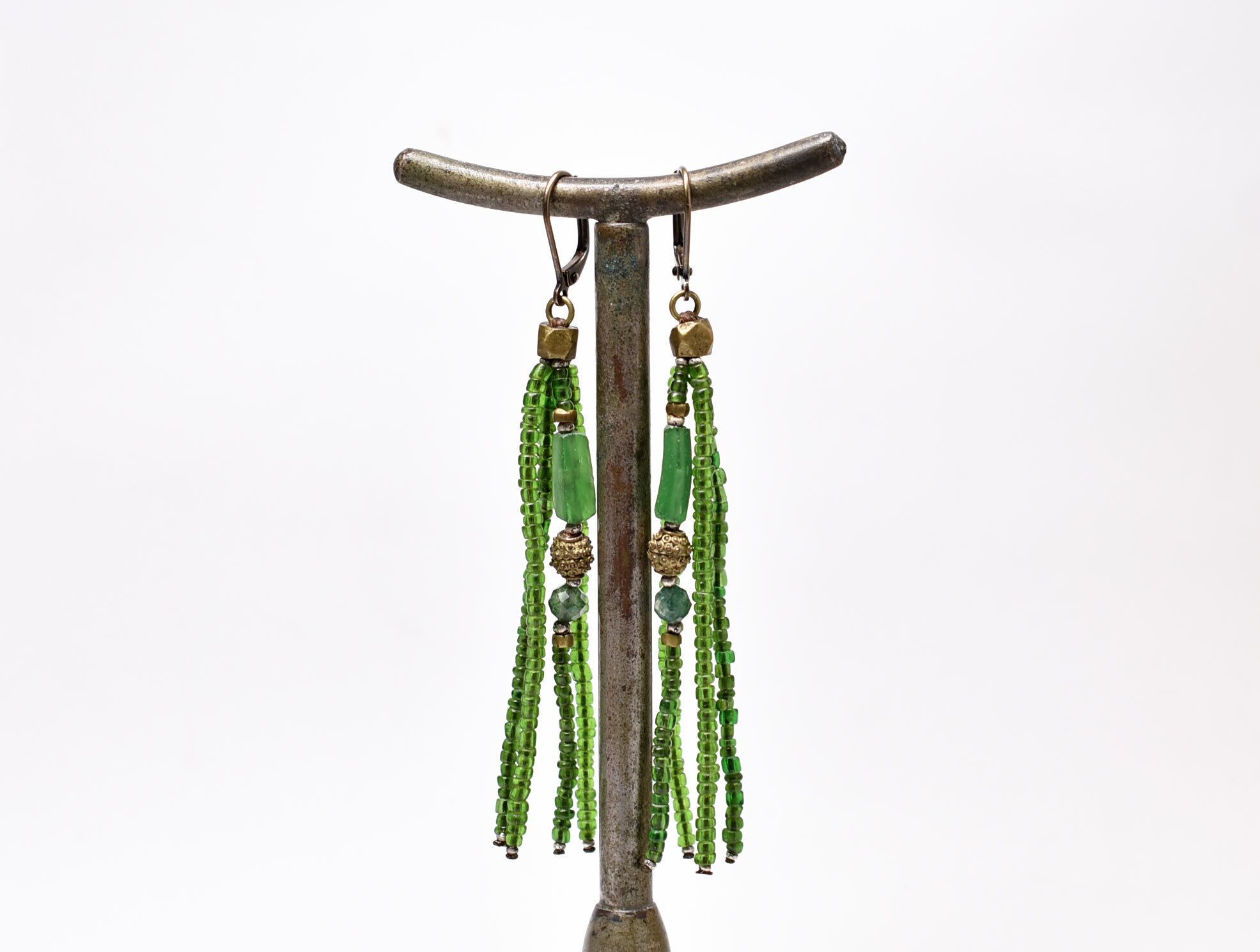 グリーンシードビーズ、ローマングラスとモスアゲート、ツブツブブラス、oldオリッサブラスの4連ピアス