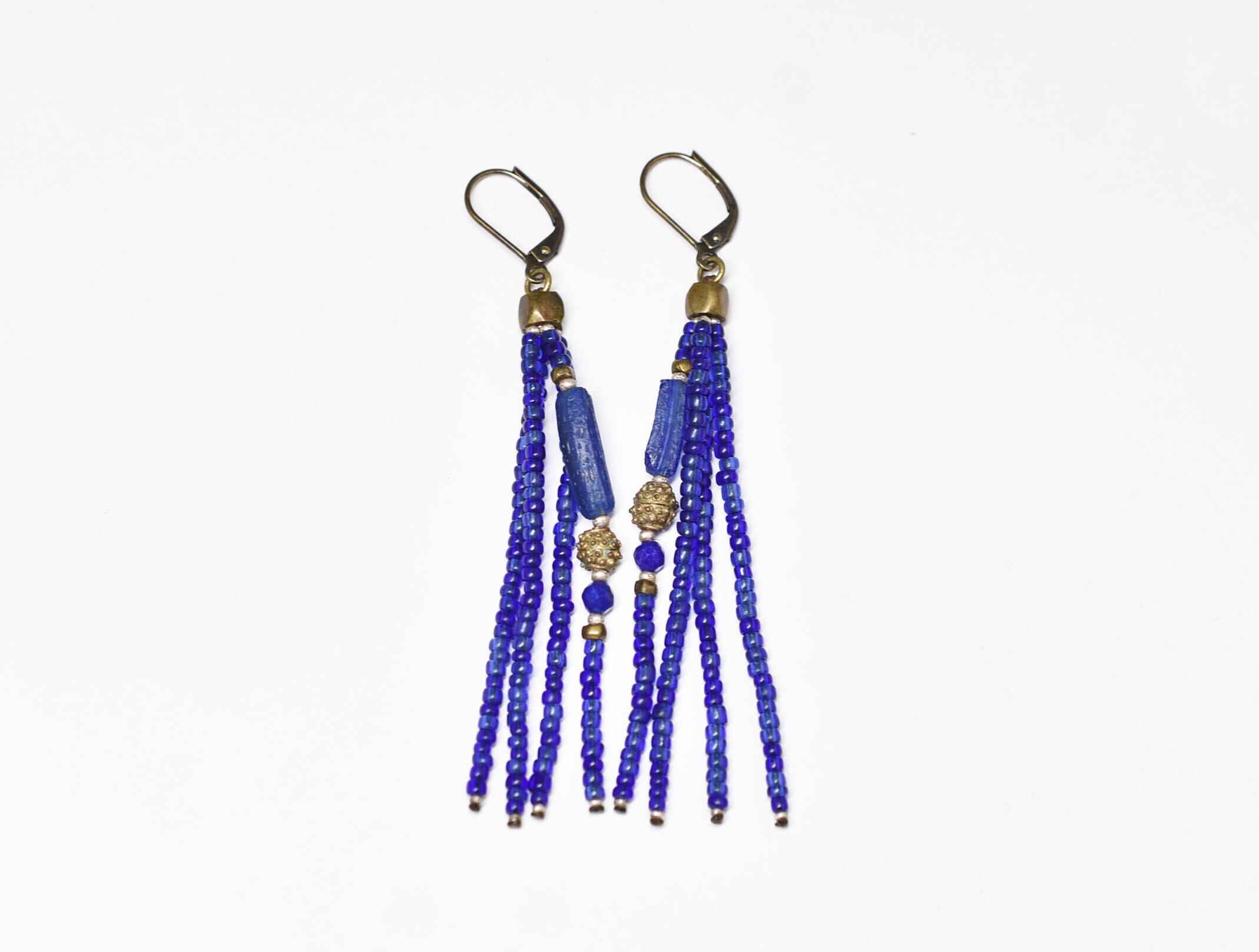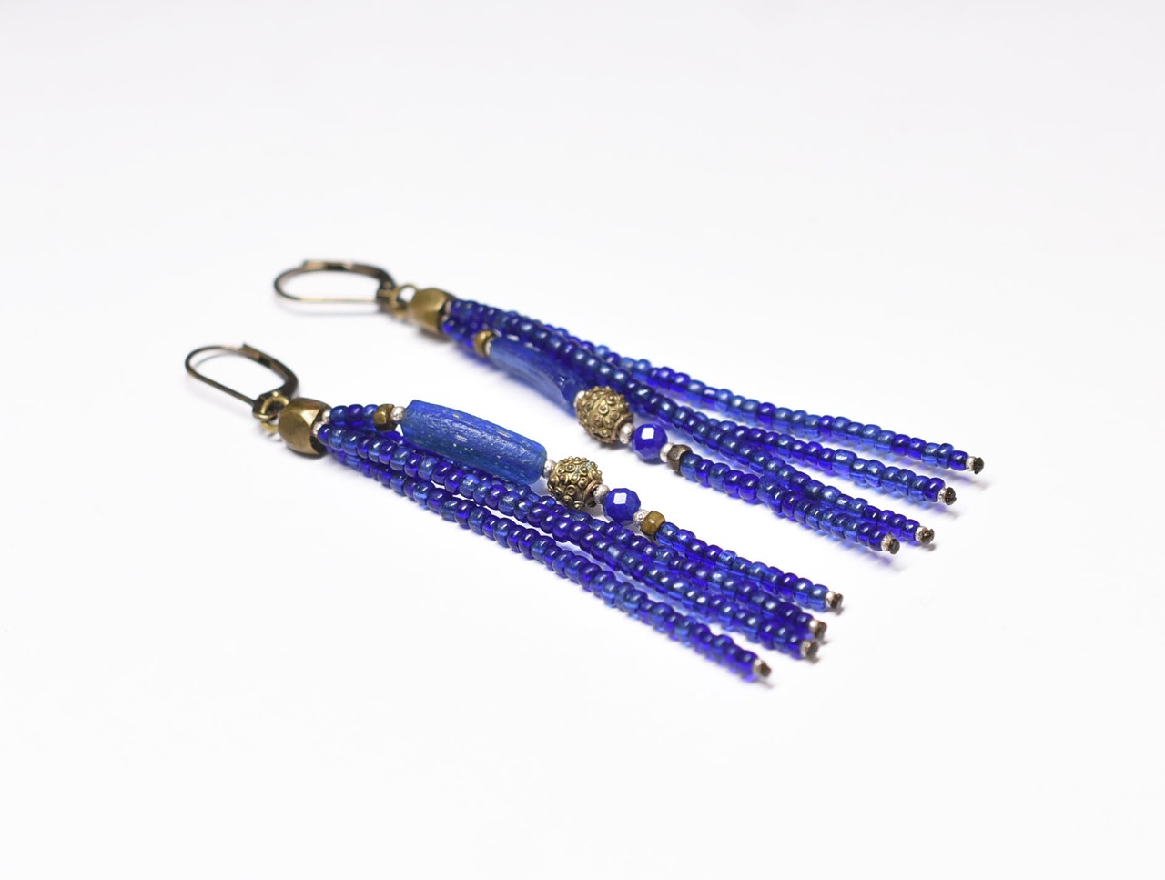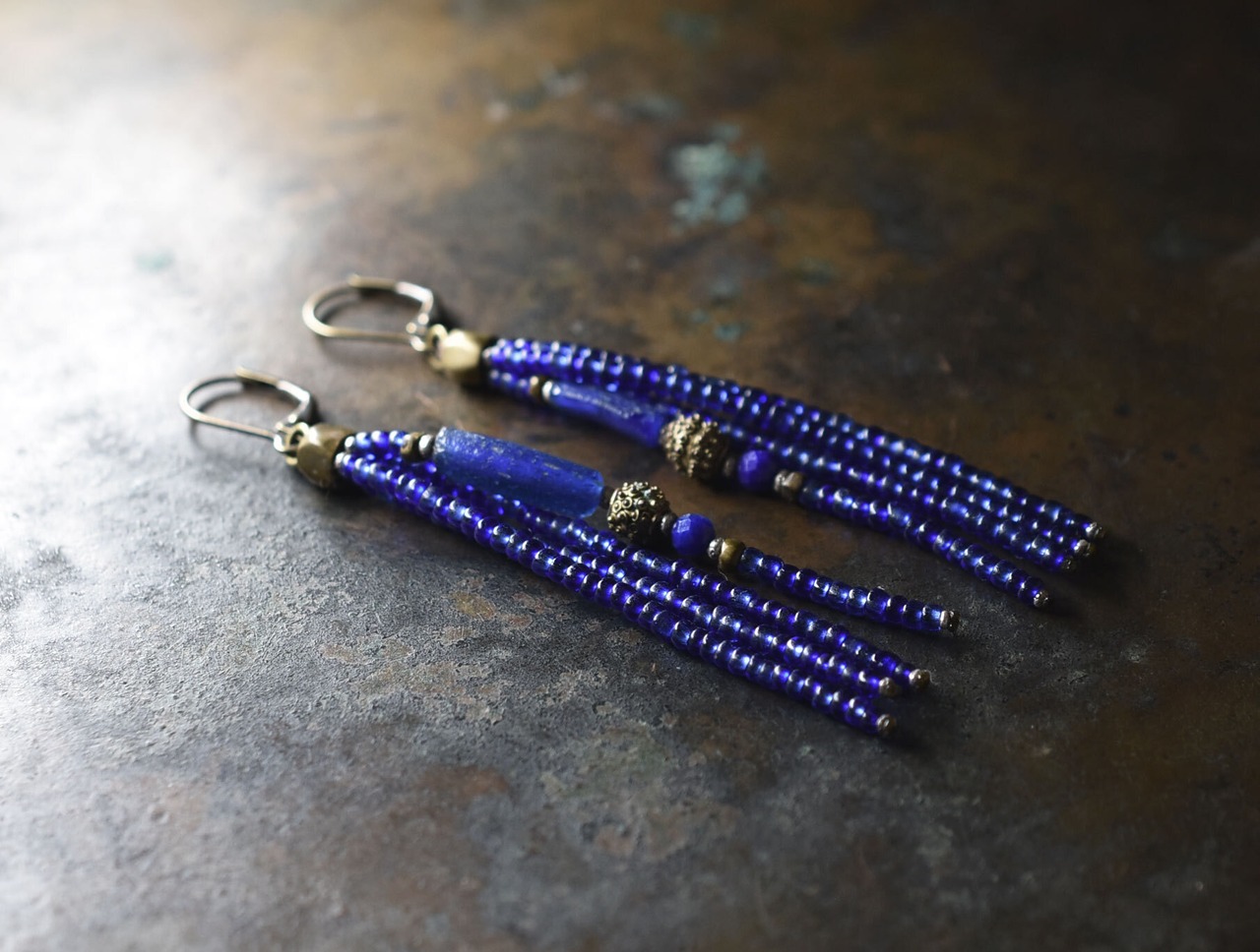 ブルーのシードビーズ、ローマングラス、ラピス、ツブツブブラス、oldオリッサブラスなどで繋いだ4連のピアスです。