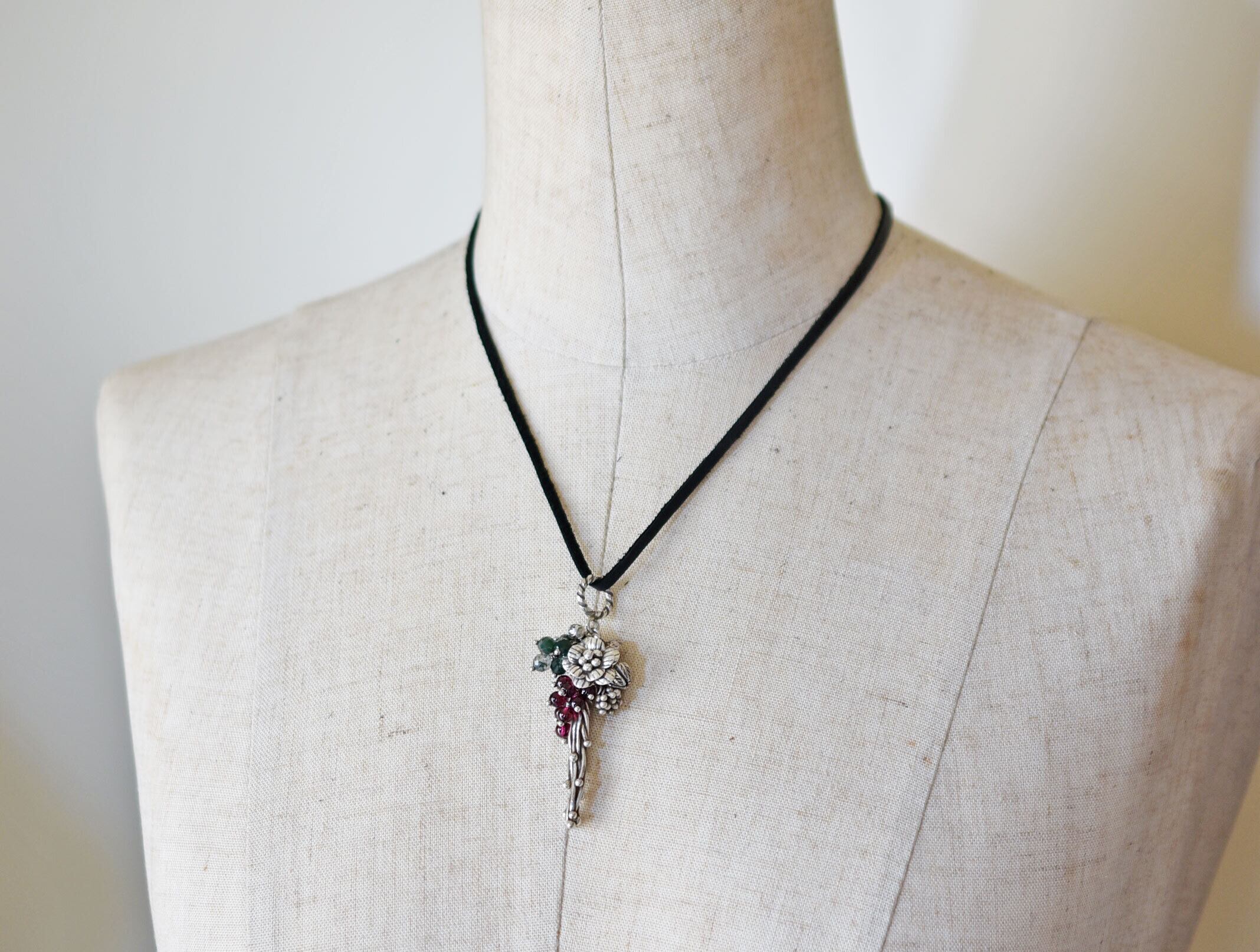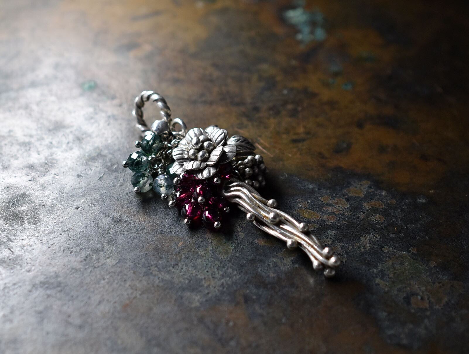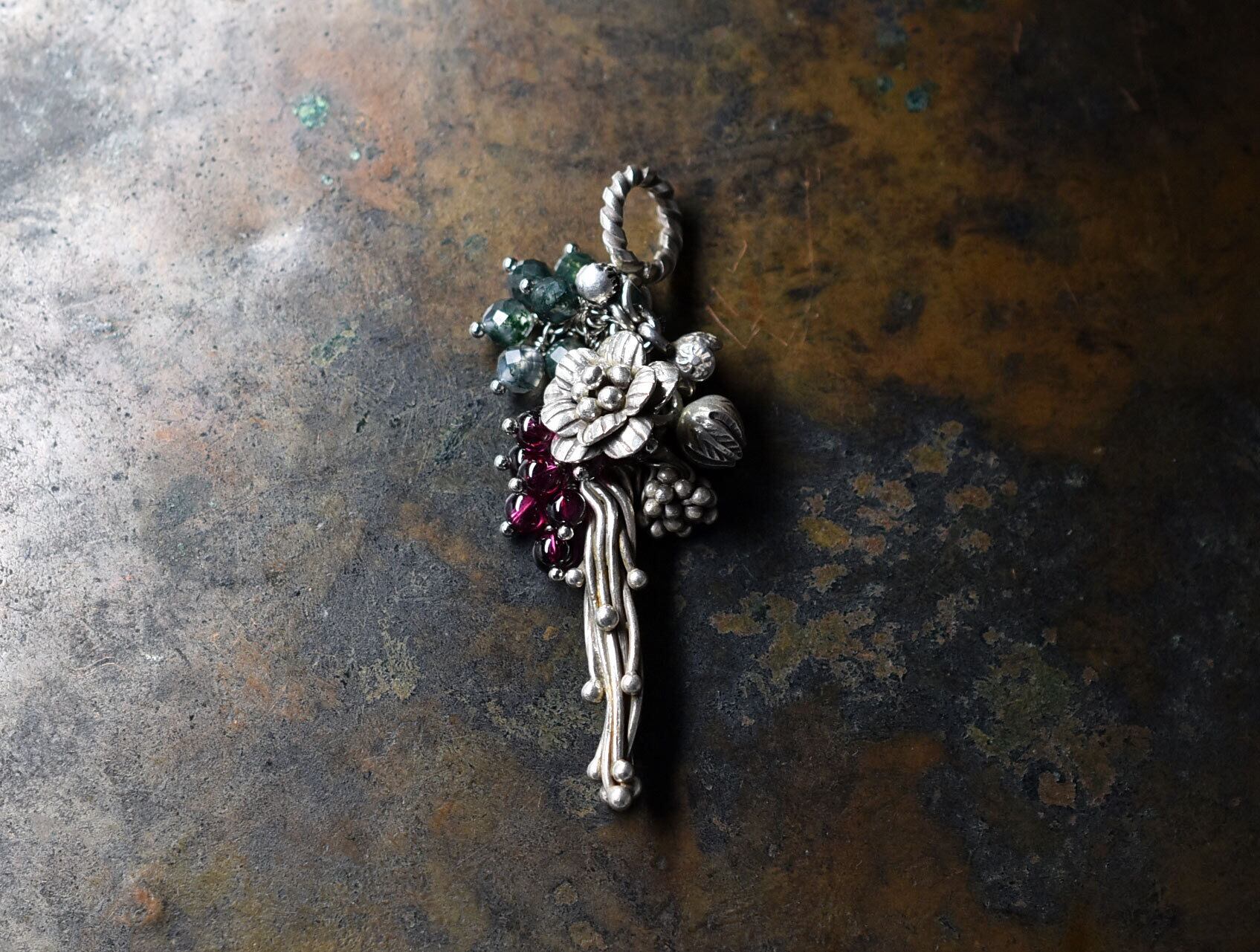 蔦やお花、蕾カレンシルバーとたわわなガーネットとモスアゲートを繋いだペンダントトップです。