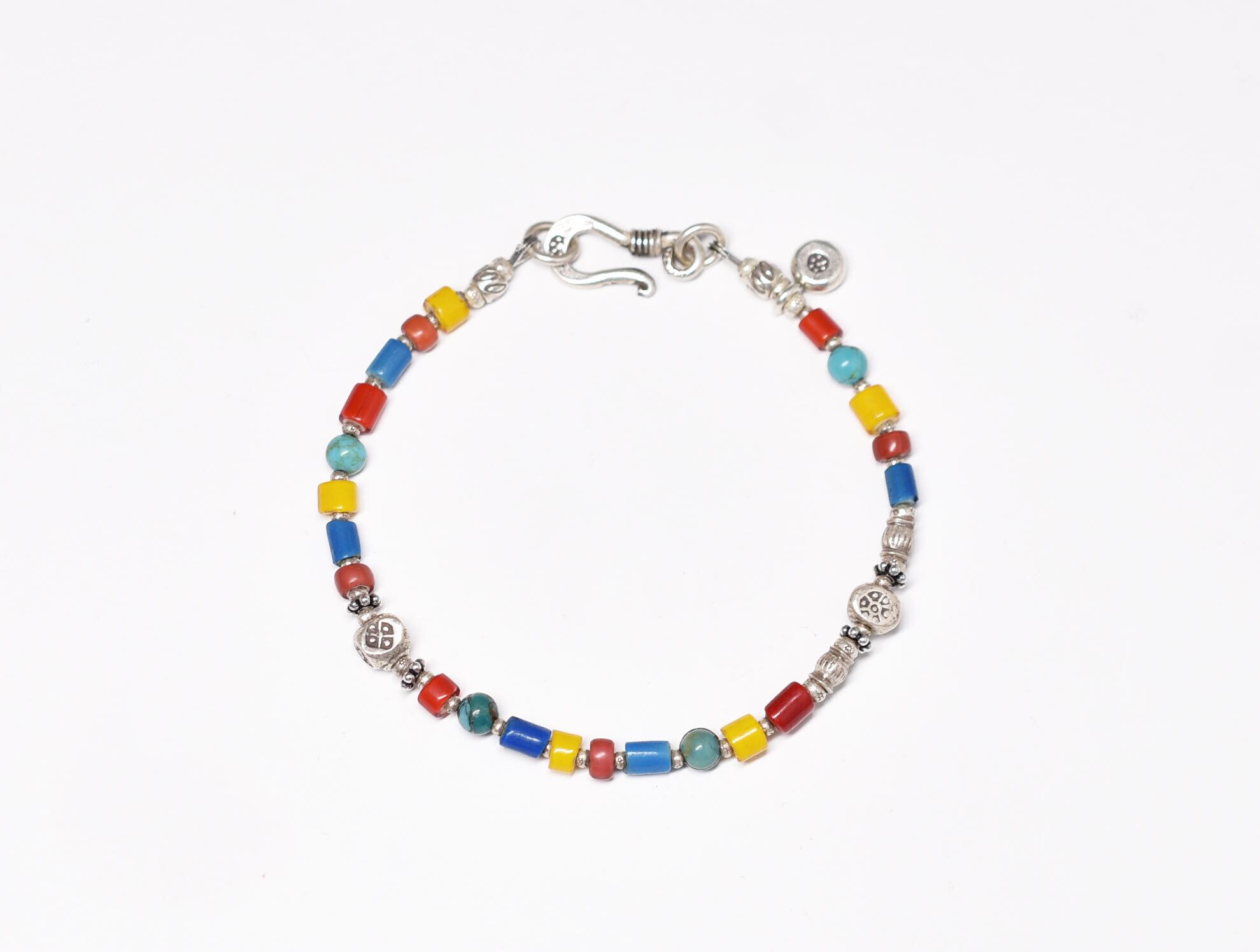 四角形、三角形のビーズ、チャーム、留め金、間の小さなビーズはカレンシルバーです。