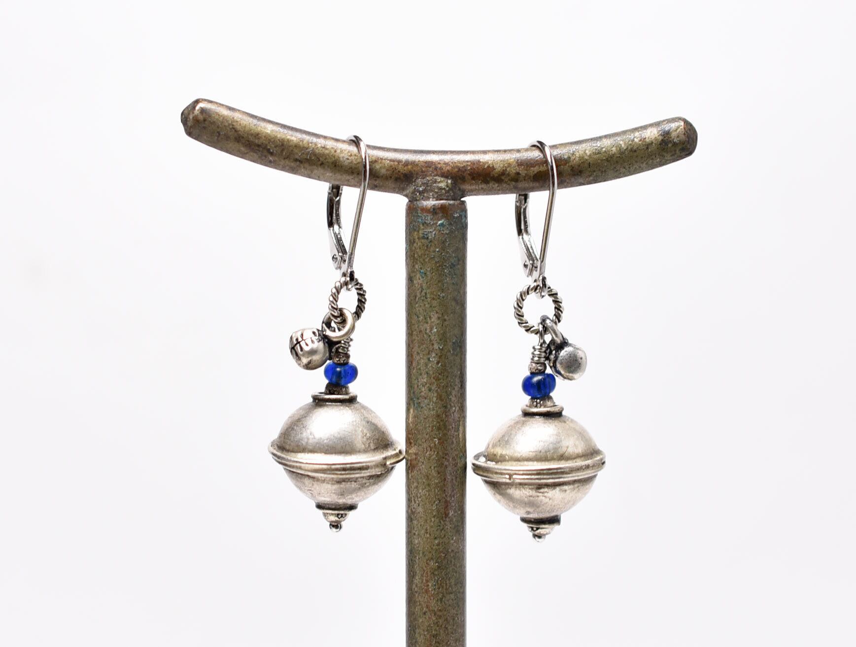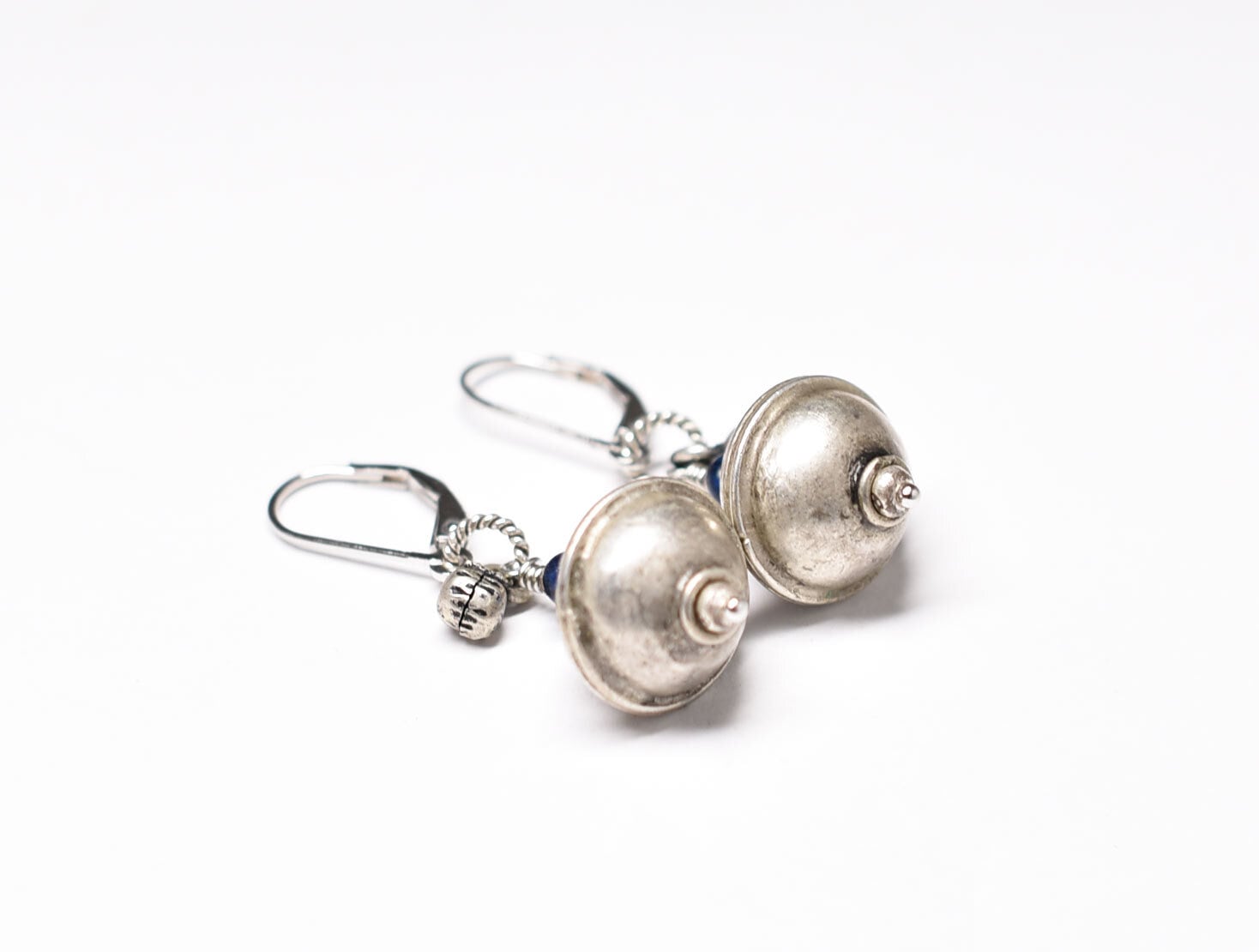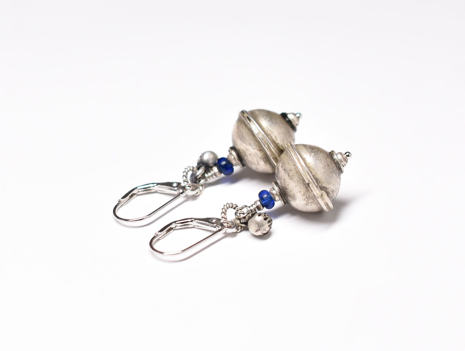 ベルベル族メタルパーツとブルーアンティークビーズ、インドシルバーの小さな鈴のピアス