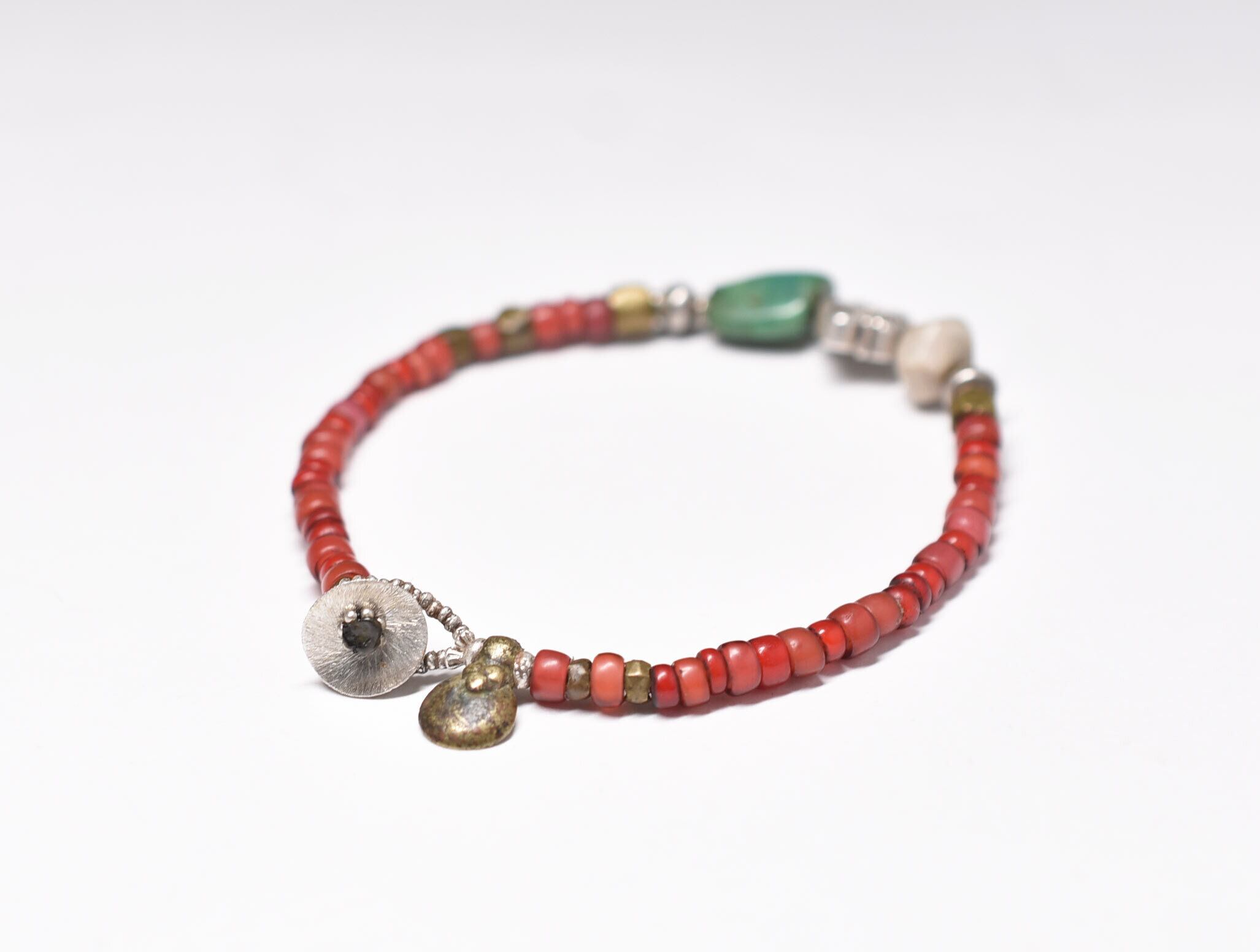 素材:oldチベタンターコイズ、白銅、古代瑪瑙、ガラス、oldチンシルバー、oldオリッサブラス、カレンシルバー、ロウビキ紐