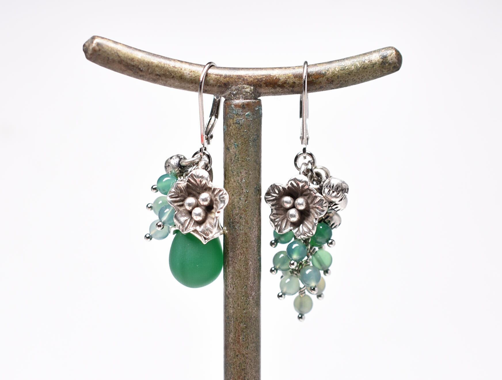 翡翠色ウエディングビーとたわわなグリーン瑪瑙、お花カレンシルバーと小さな鈴のアンシメトリーピアス