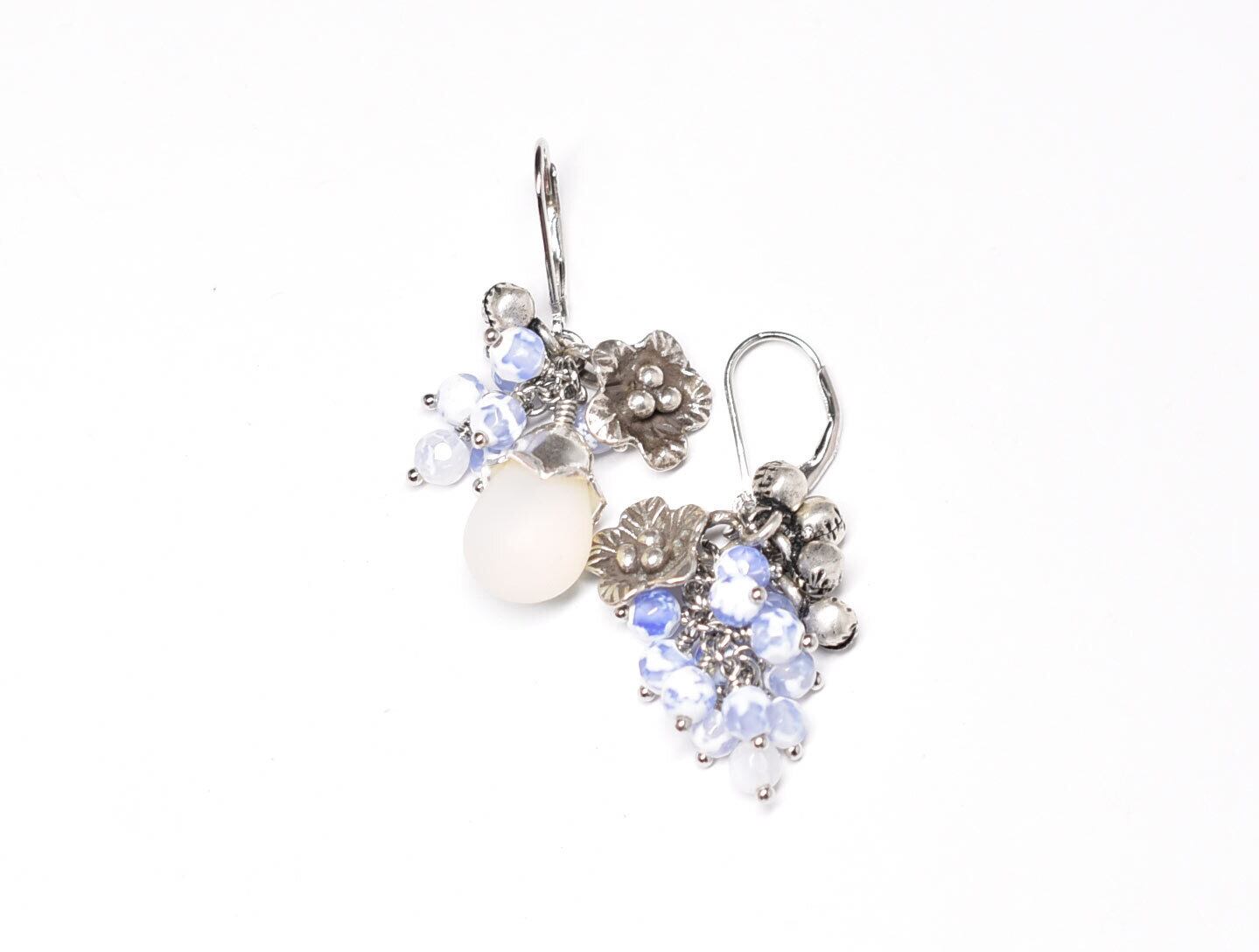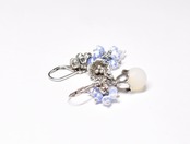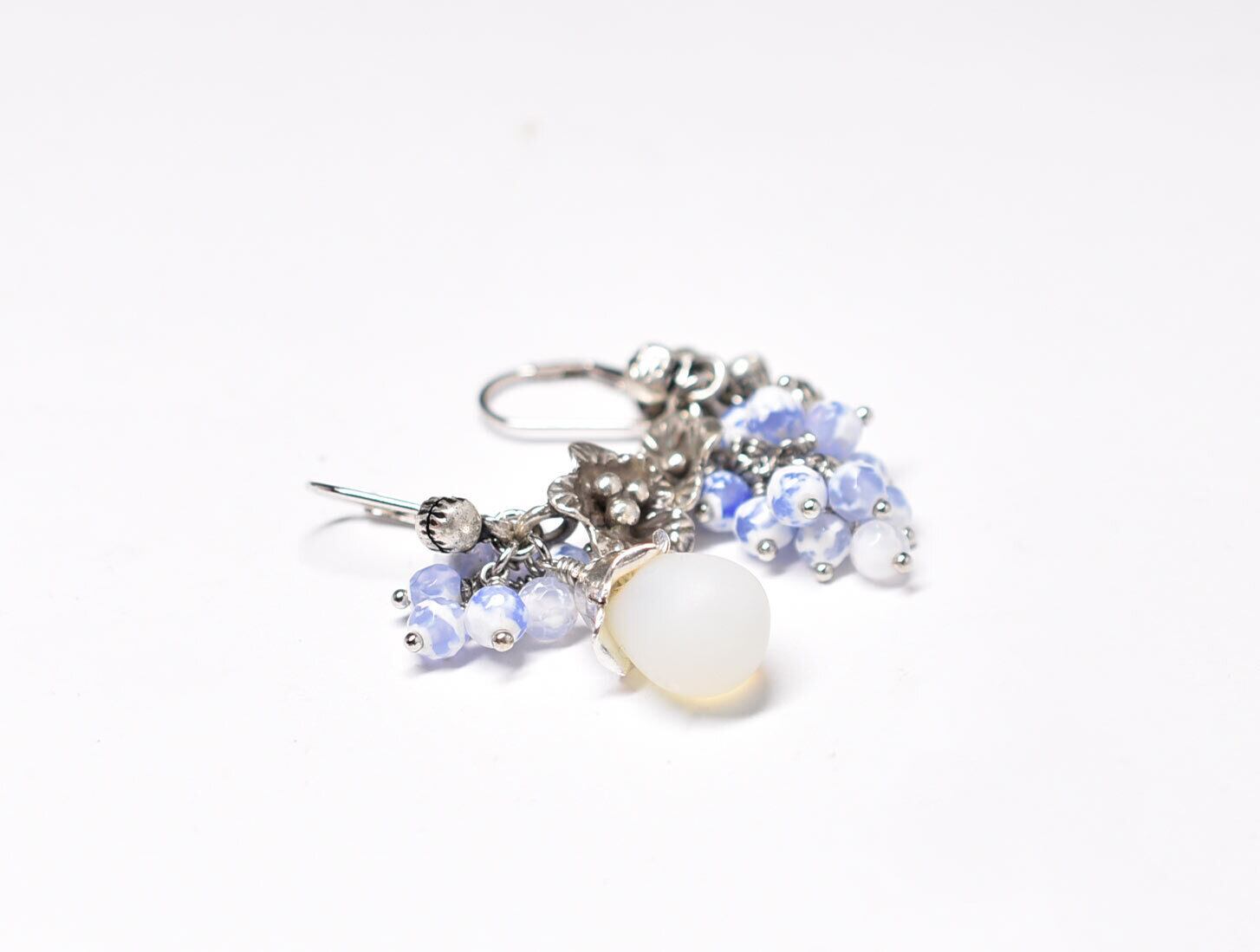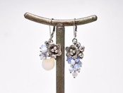 ウエディングビーズとたわわなブルー瑪瑙、お花のカレンシルバー小さな鈴を繋いだピアスです。