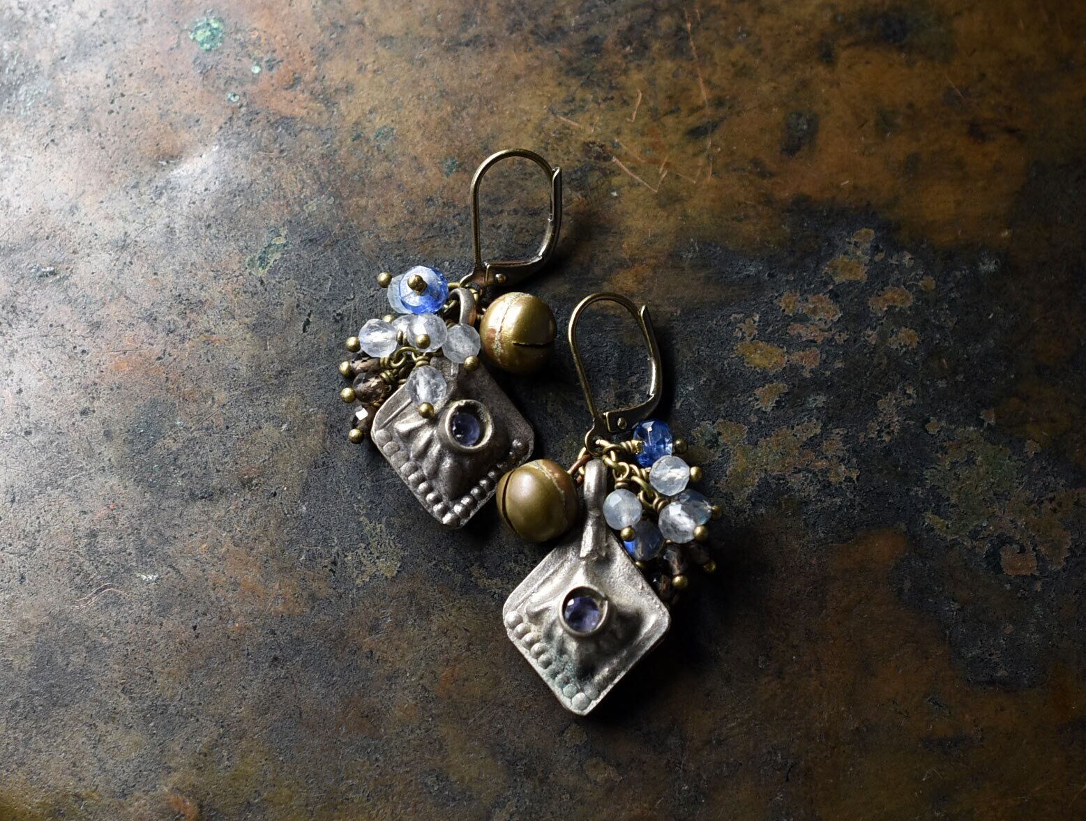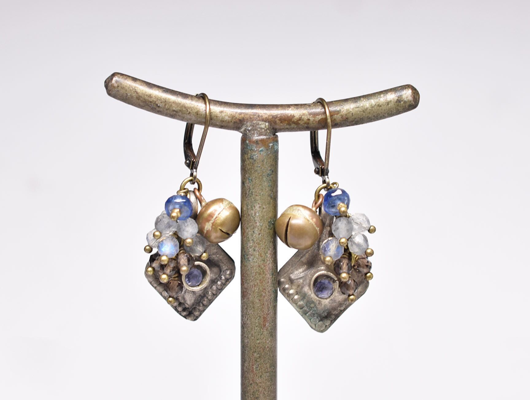 クチ族メタルパーツとたわわなラブラドライトとスモーキークォーツ、カイヤナイト、鈴を繋いだピアスです。