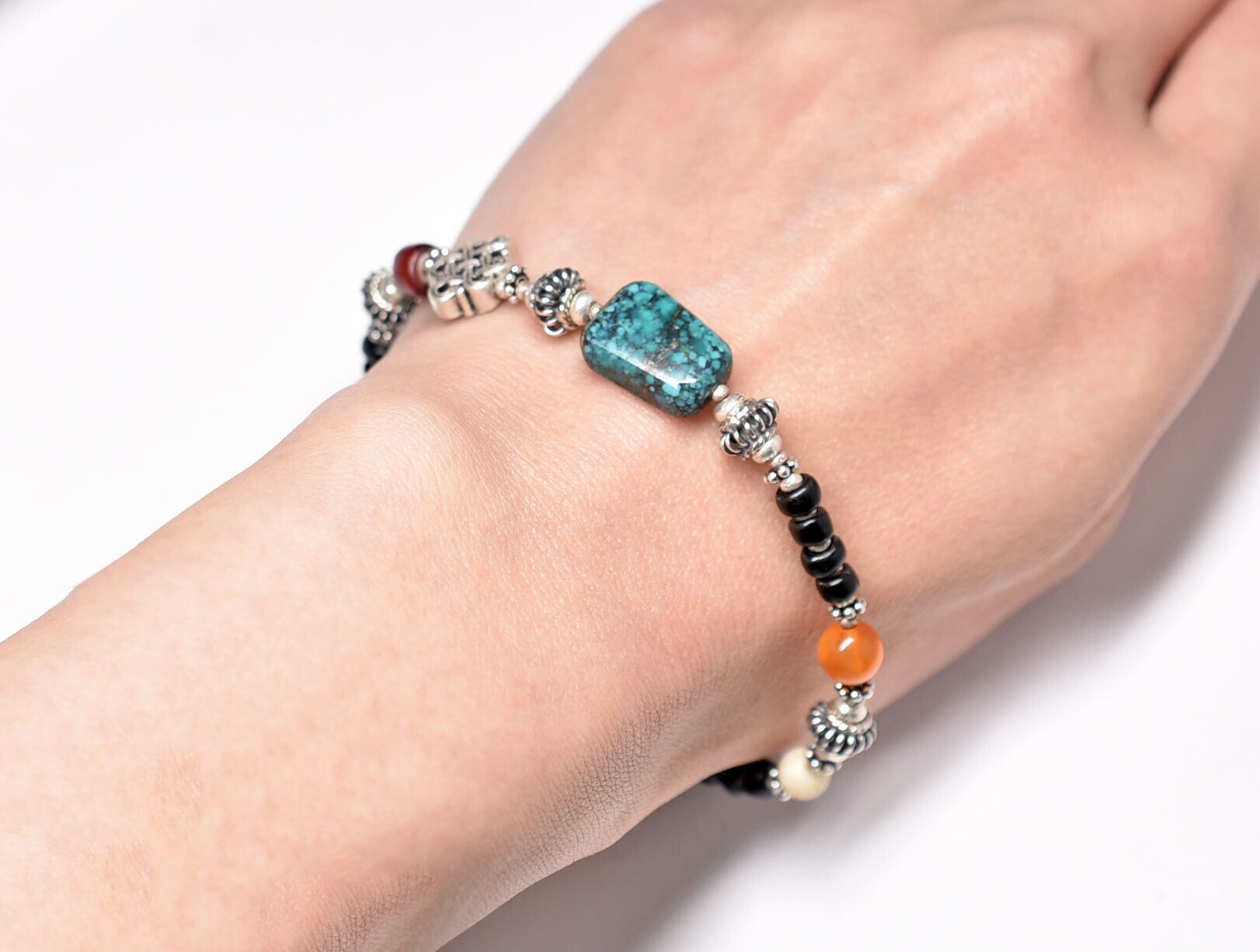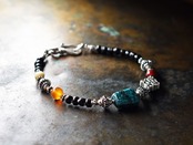 oldチベタンターコイズとエンドレスノット、金赤ホワイトハーツ、古代瑪瑙、古代カーネリアン、漆黒ビーズを繋いだブレスです。