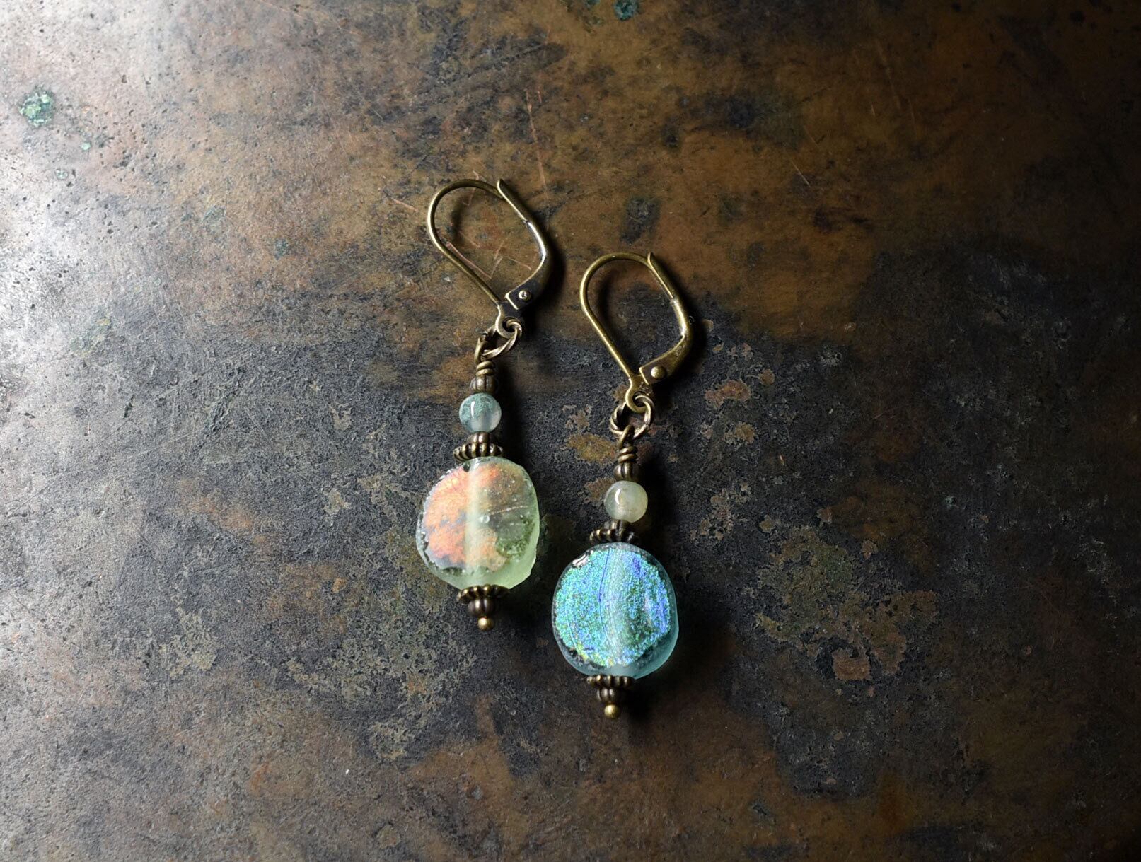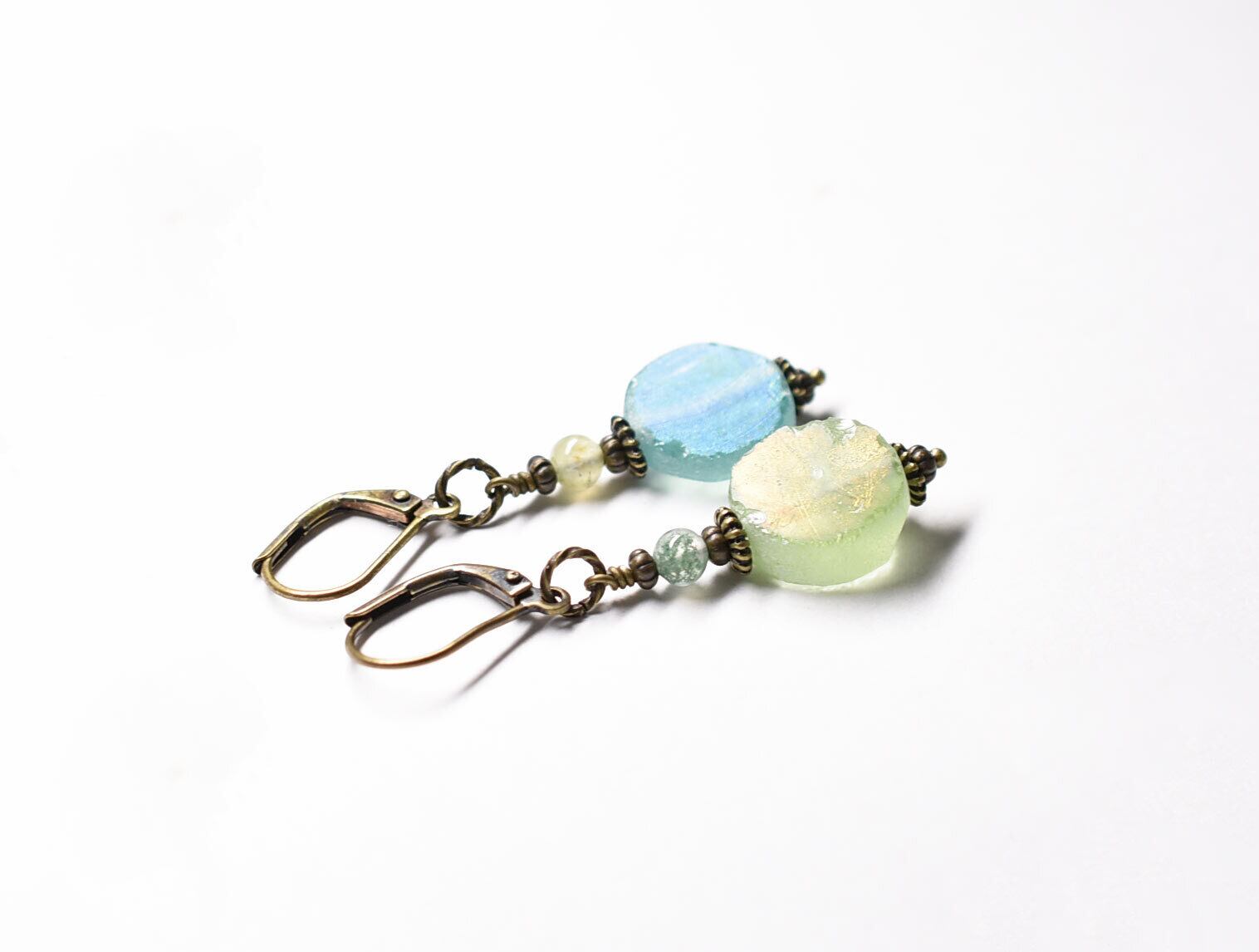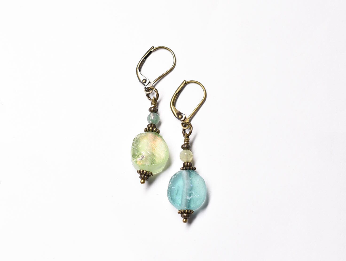 ソーダブルー&オリーブイエロー銀化ローマングラスとモスアゲートのピアス