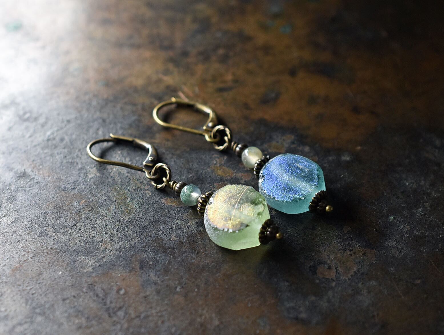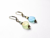 ソーダブルー&オリーブイエロー銀化ローマングラスとモスアゲートを繋いだピアスです。