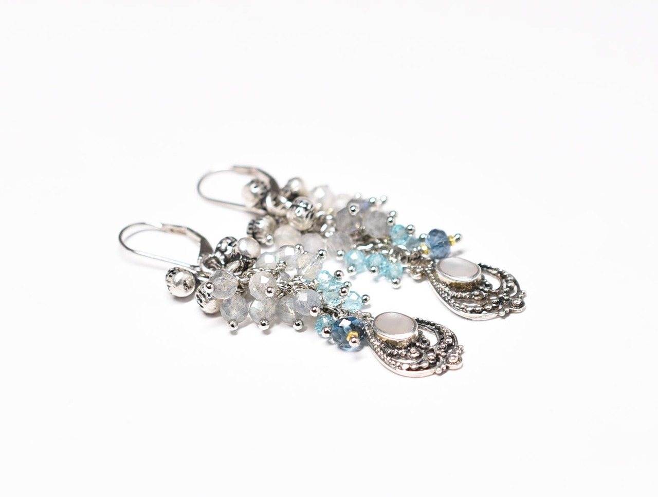 白蝶貝繊細透かしシルバー装飾とたわわなラブラドライトとアパタイト、ロンドンブルートパーズ、鈴のピアス