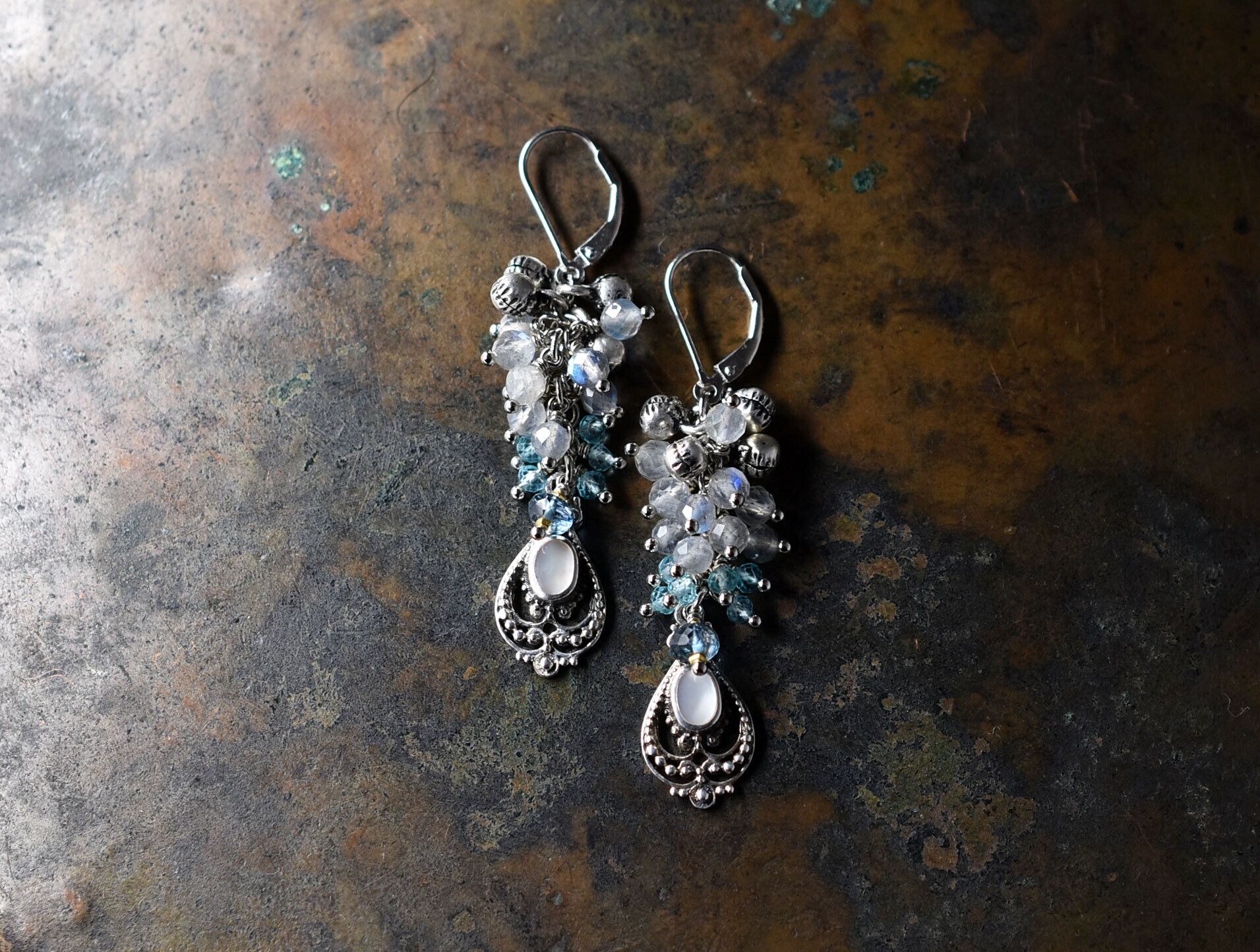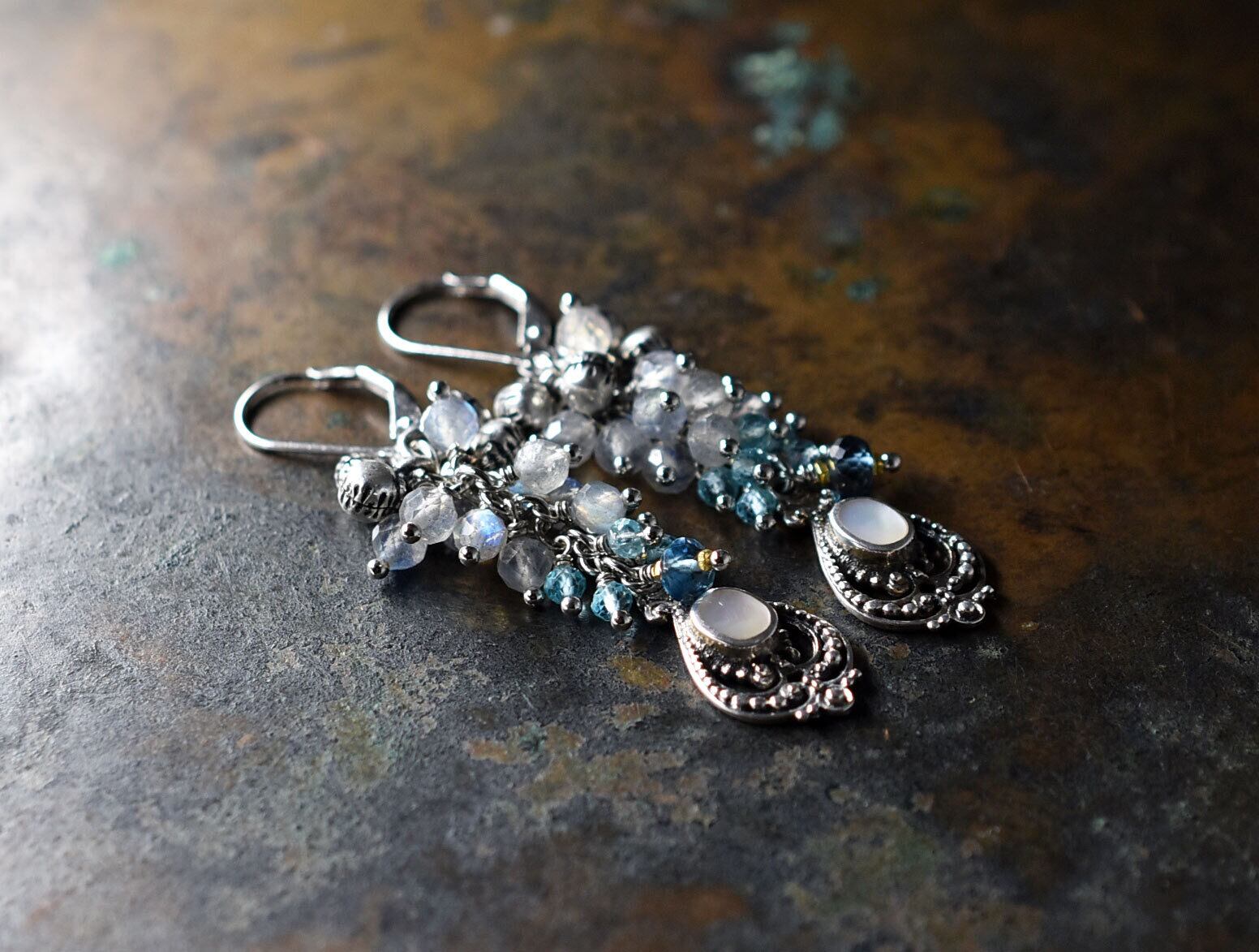 白蝶貝繊細透かしシルバー装飾とたわわなラブラドライトとアパタイト、ロンドンブルートパーズ、鈴を繋いだピアスです。