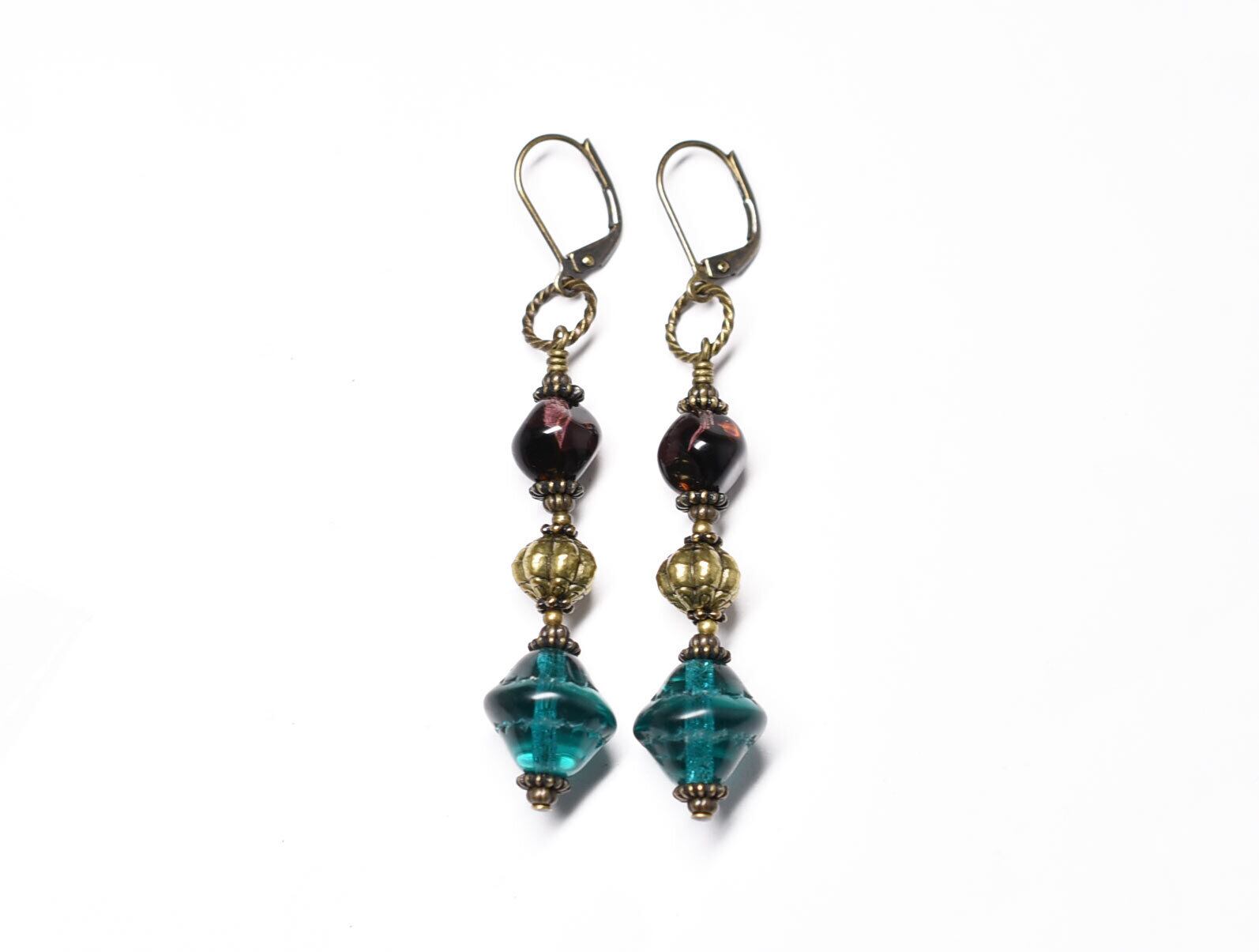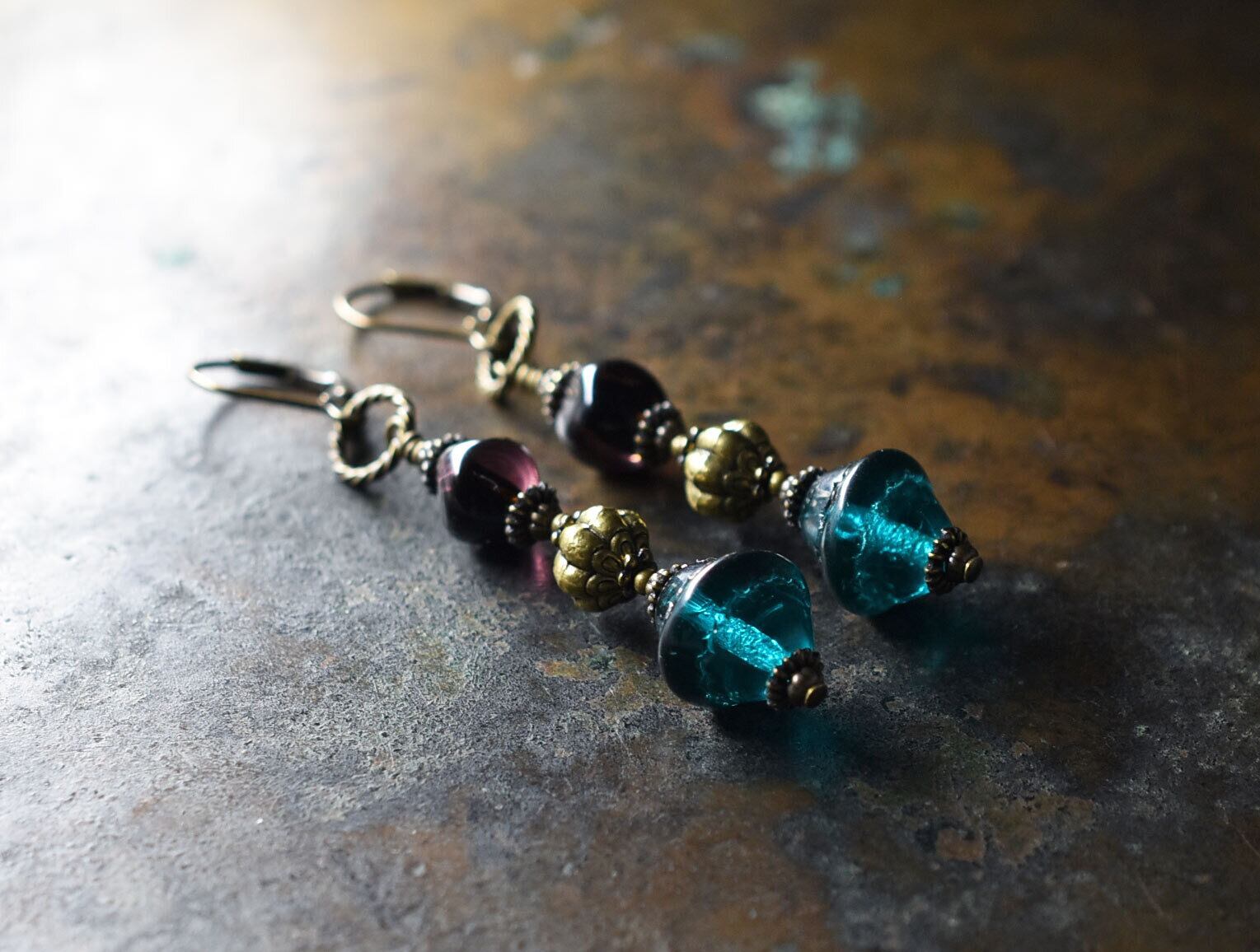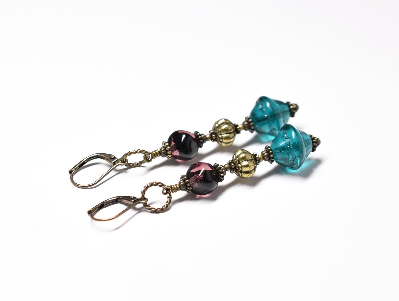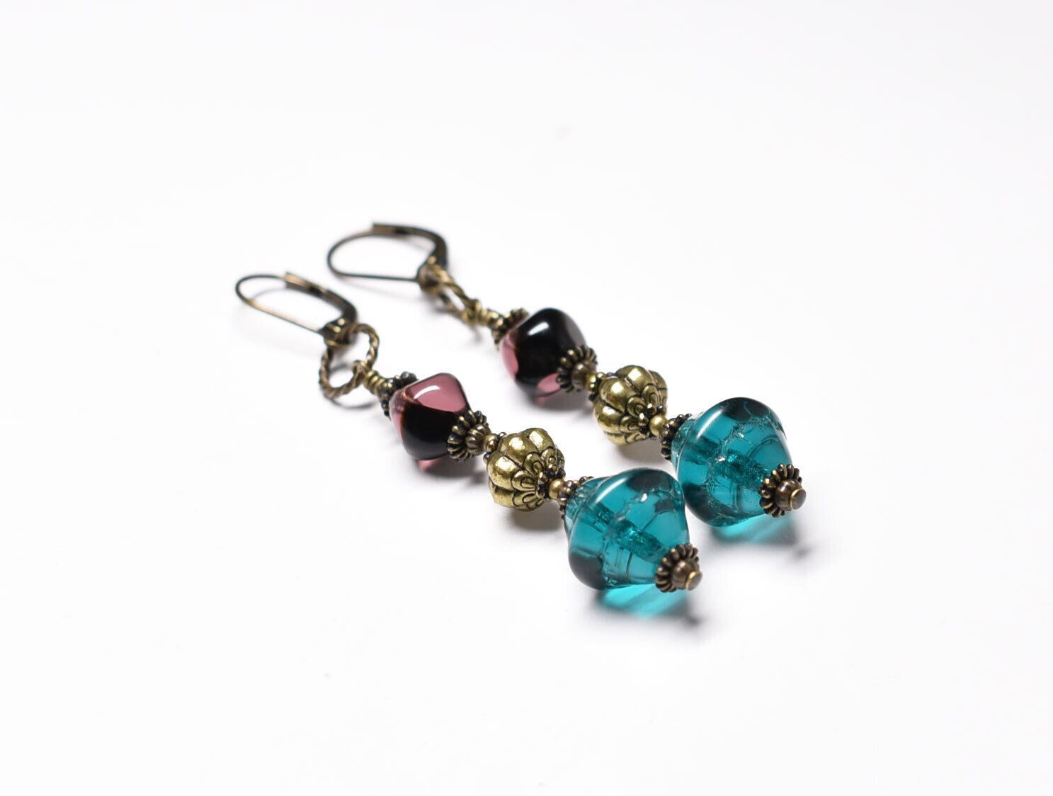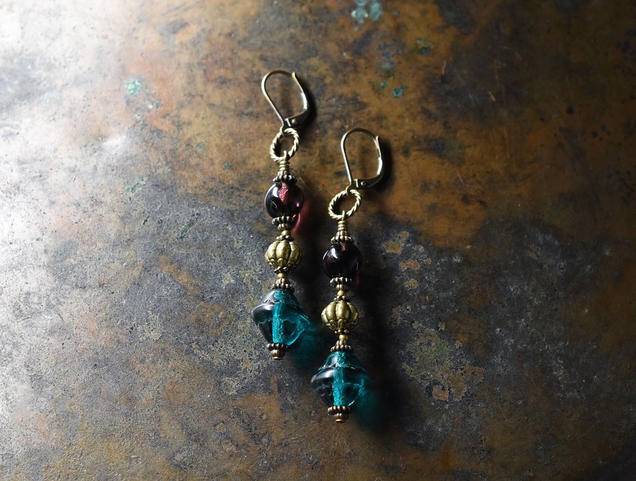 ブルーグリーン&マーブルパープルヴィンテージビーズと手毬ブラスを繋いだやや長めのピアスです。
