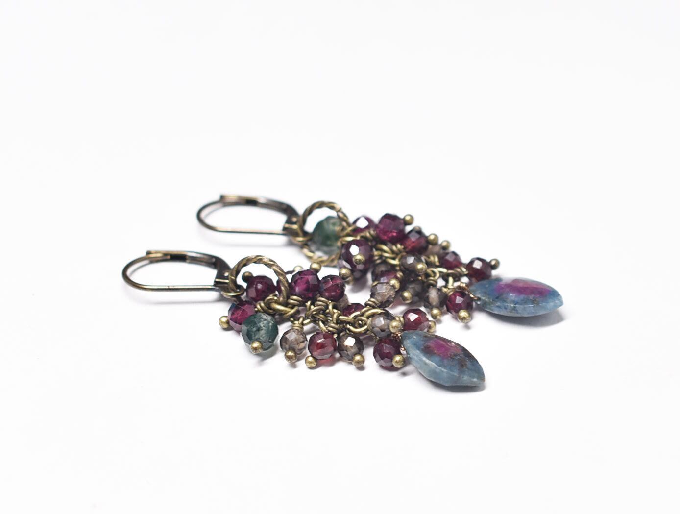 ルビーインゾイサイト、たわわなガーネットとスモーキークォーツ、モスアゲートのピアス