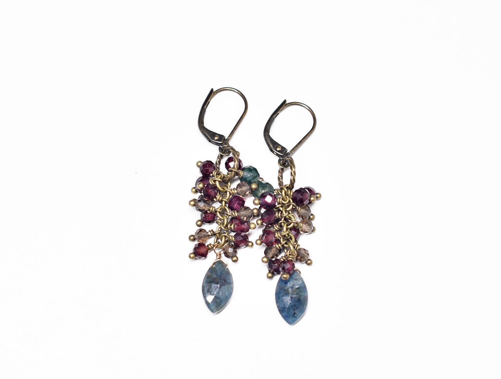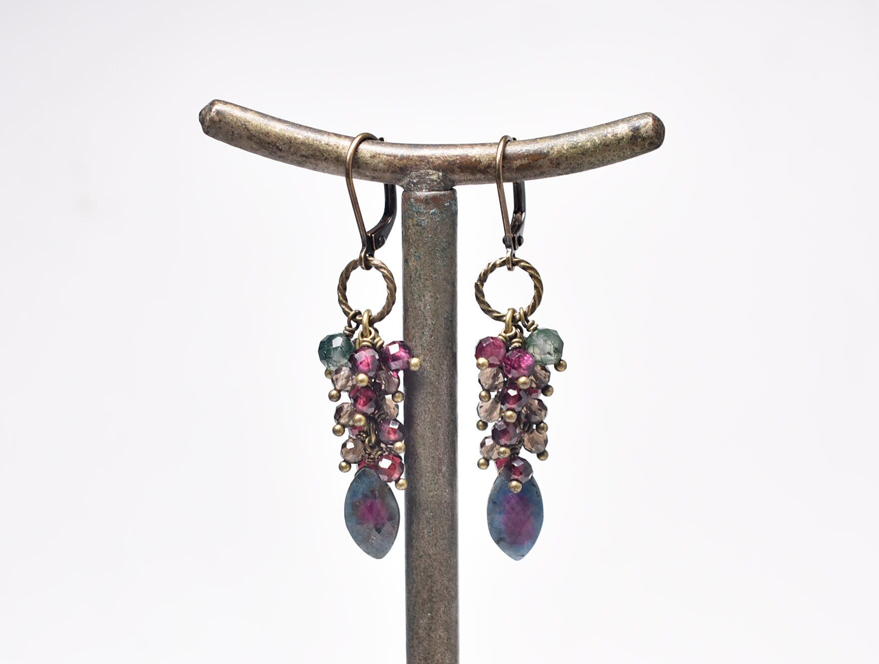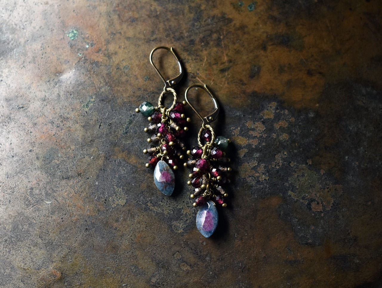 ルビーインゾイサイト、たわわなガーネットとスモーキークォーツ、モスアゲートを繋いだピアスです。