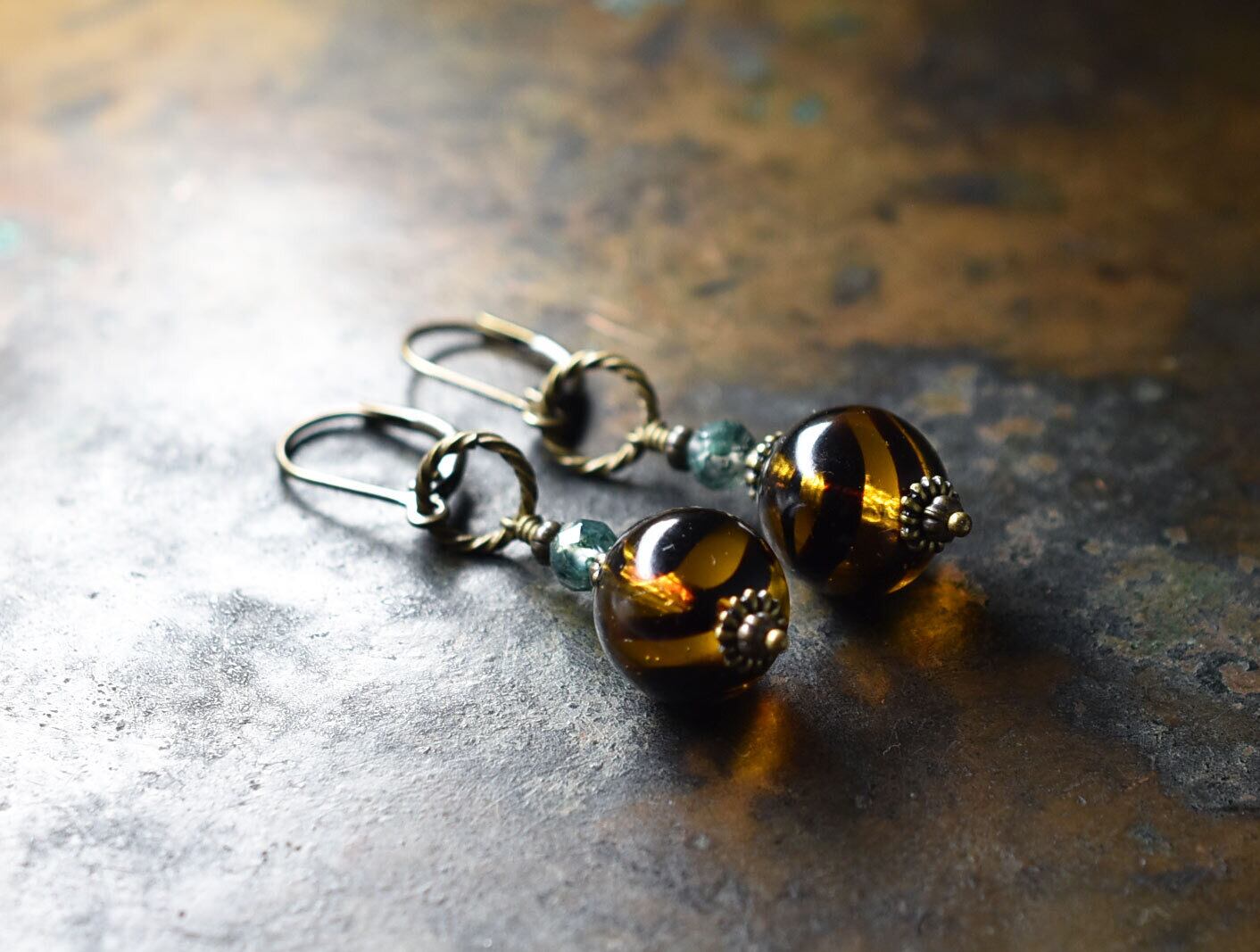 まん丸なべっ甲色のビーズはドイツのヴィンテージビーズです。