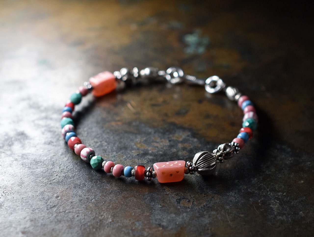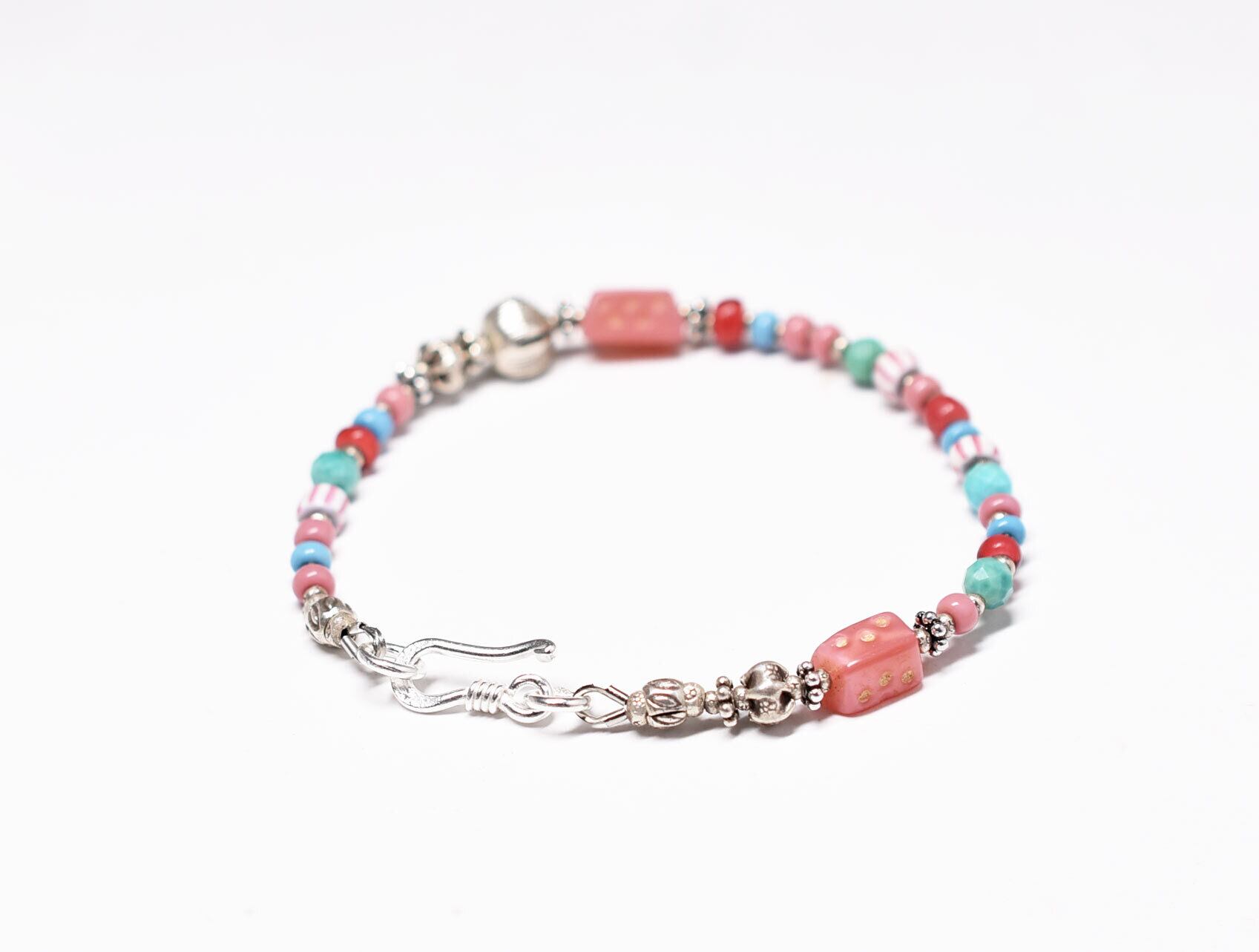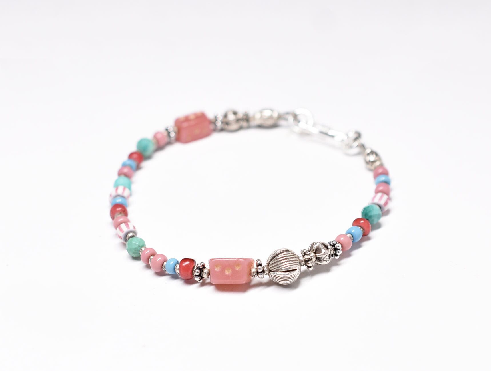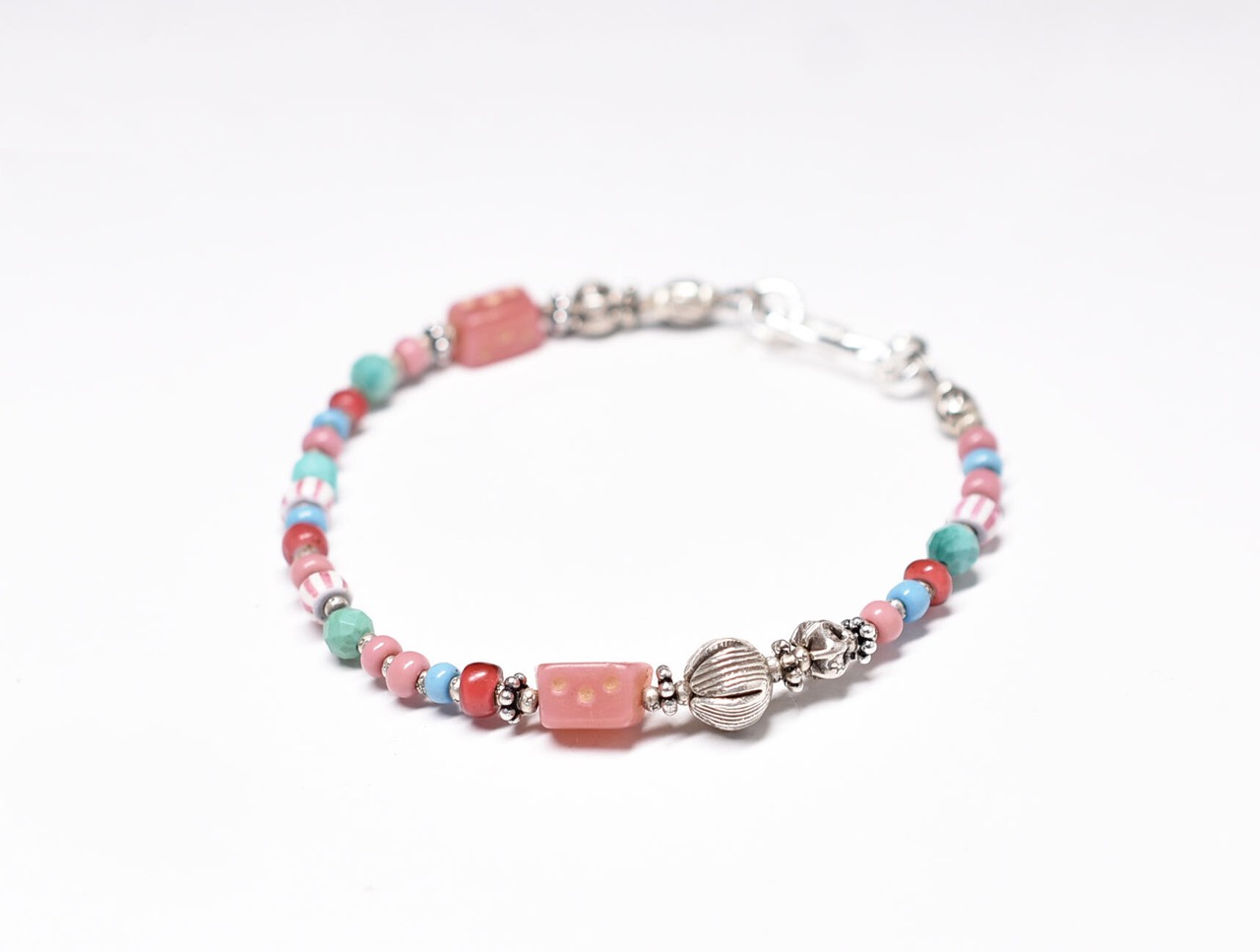 多彩なベネチアビーズと、ピンク色のダイスビーズ、ターコイズ、カレンシルバーを繋いだブレスです。
