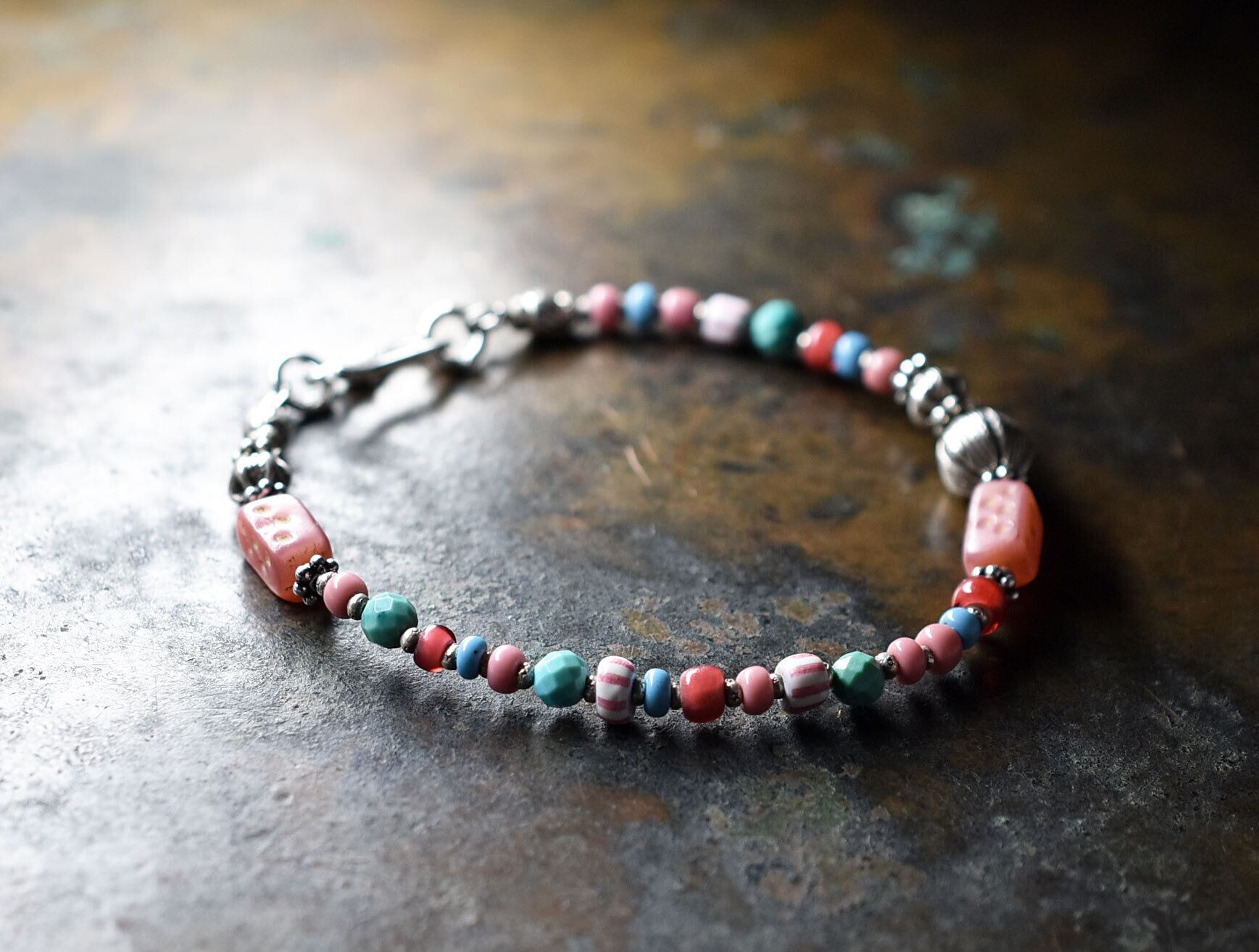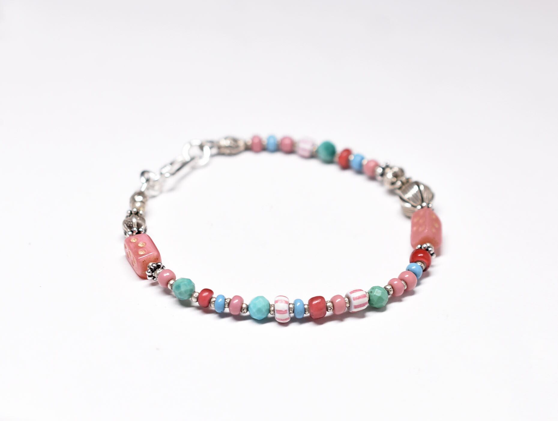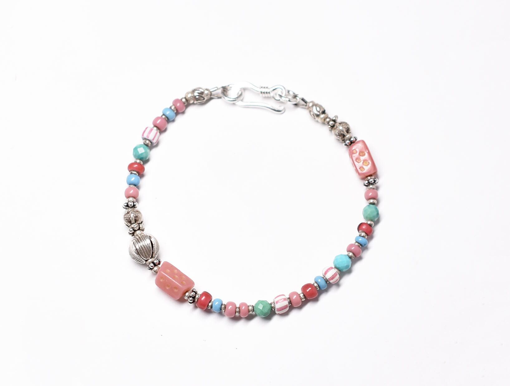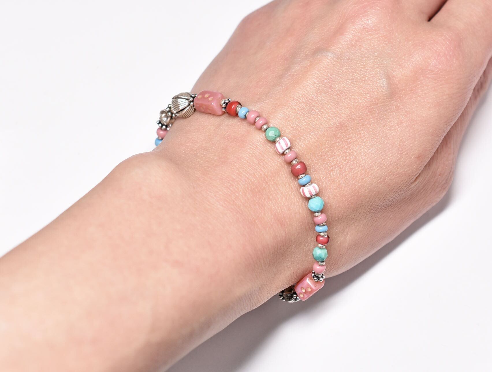多彩なベネチアビーズと、ピンク色のダイスビーズ、ターコイズ、カレンシルバーを繋いだブレスです。