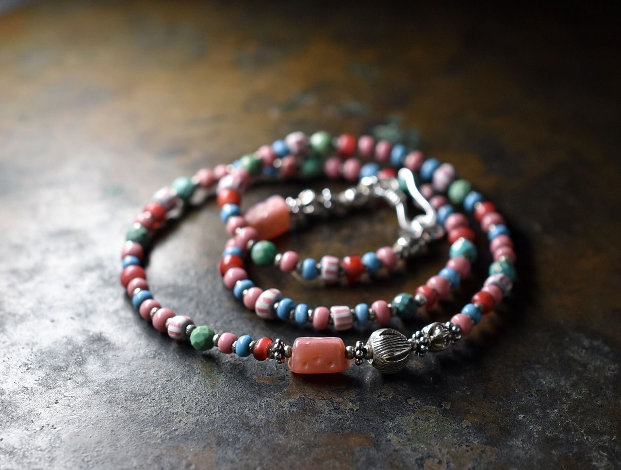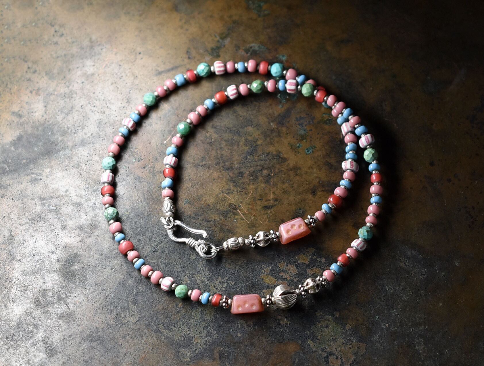 カレンシルバーとヴェネチアアンティークビーズとダイスビーズ、ターコイズのシャーベットカラーネックレス