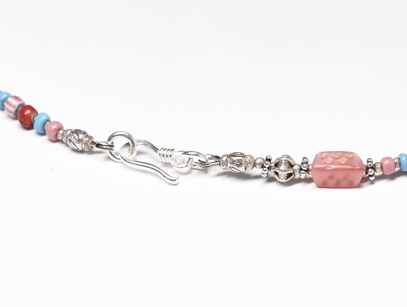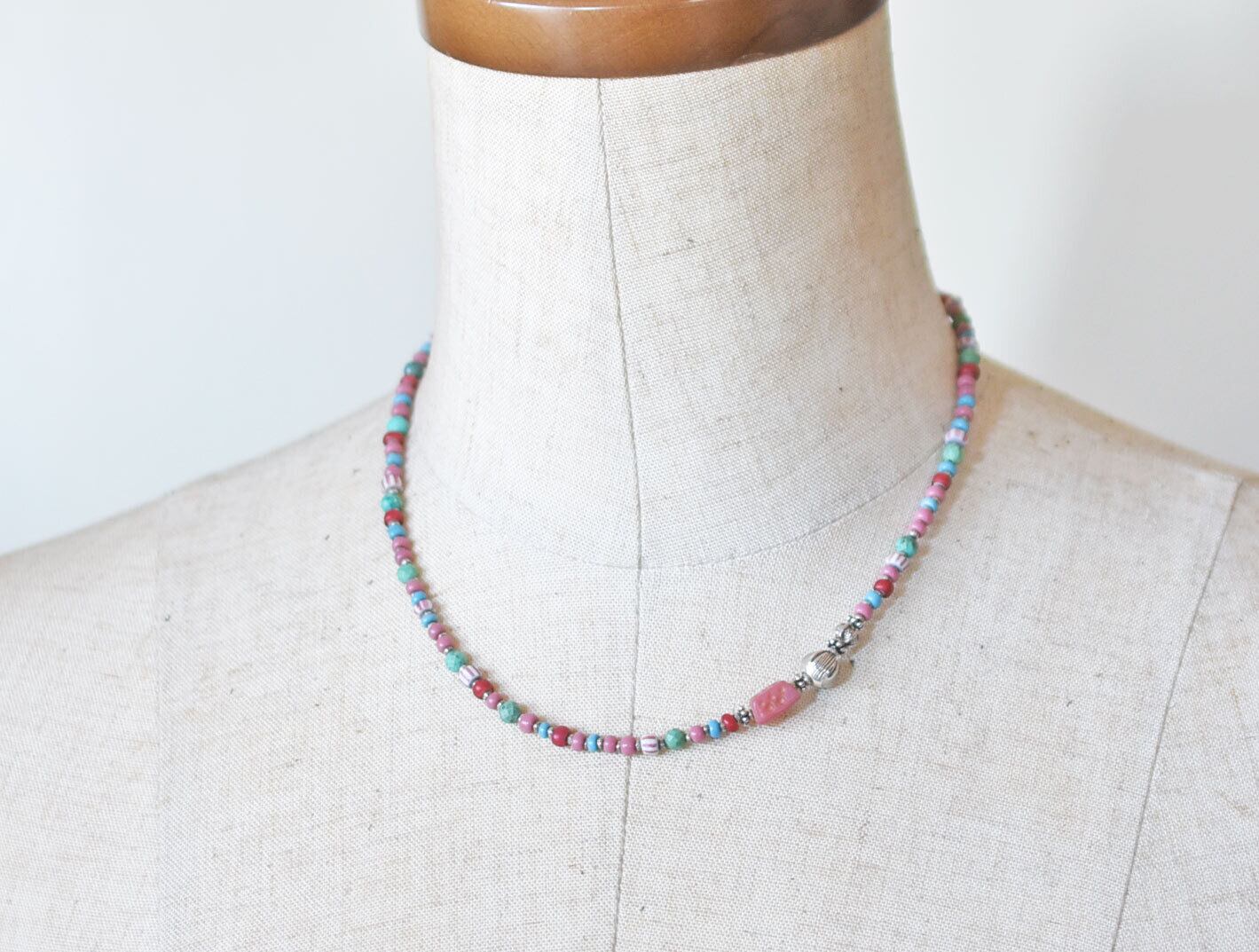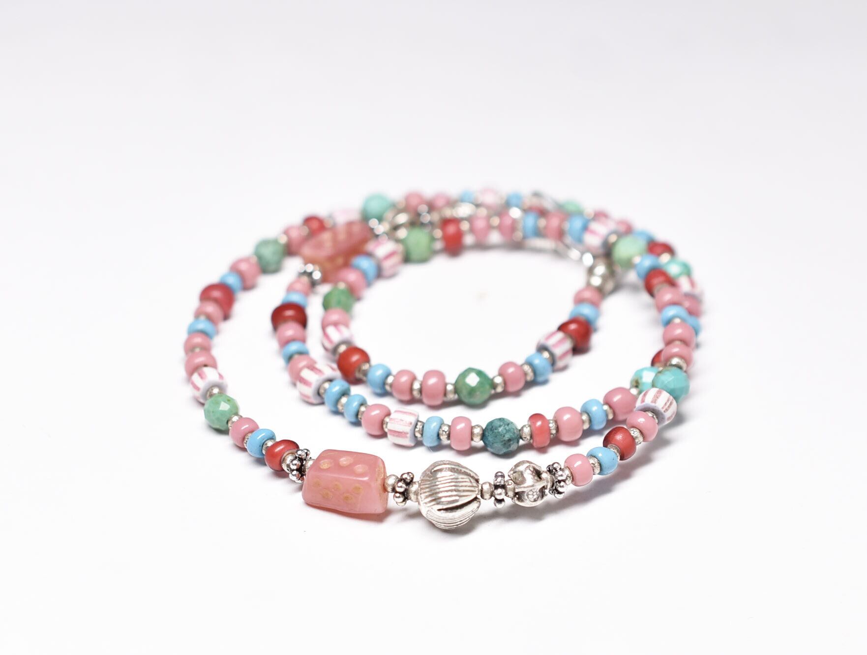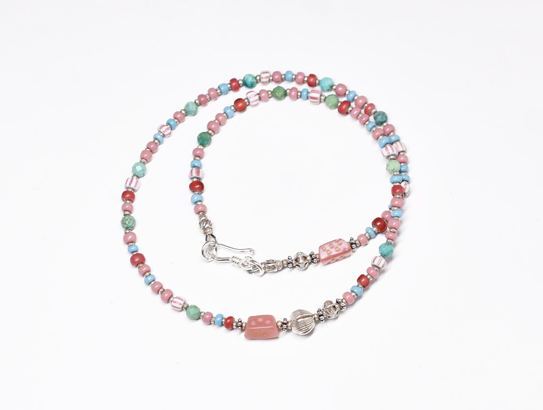 多彩なベネチアビーズと、ピンク色のダイスビーズ、ターコイズ、カレンシルバーを繋いだネックレスです。