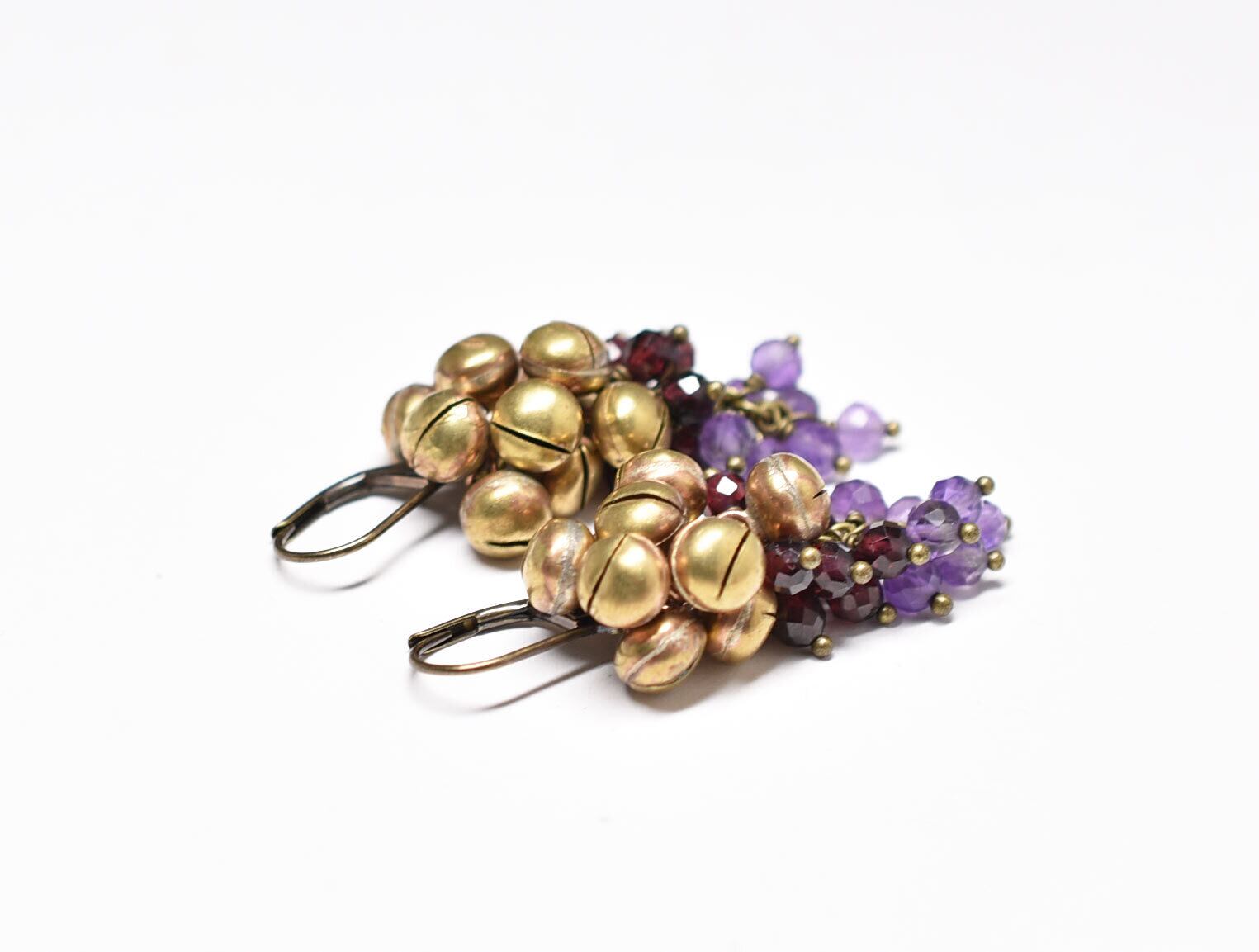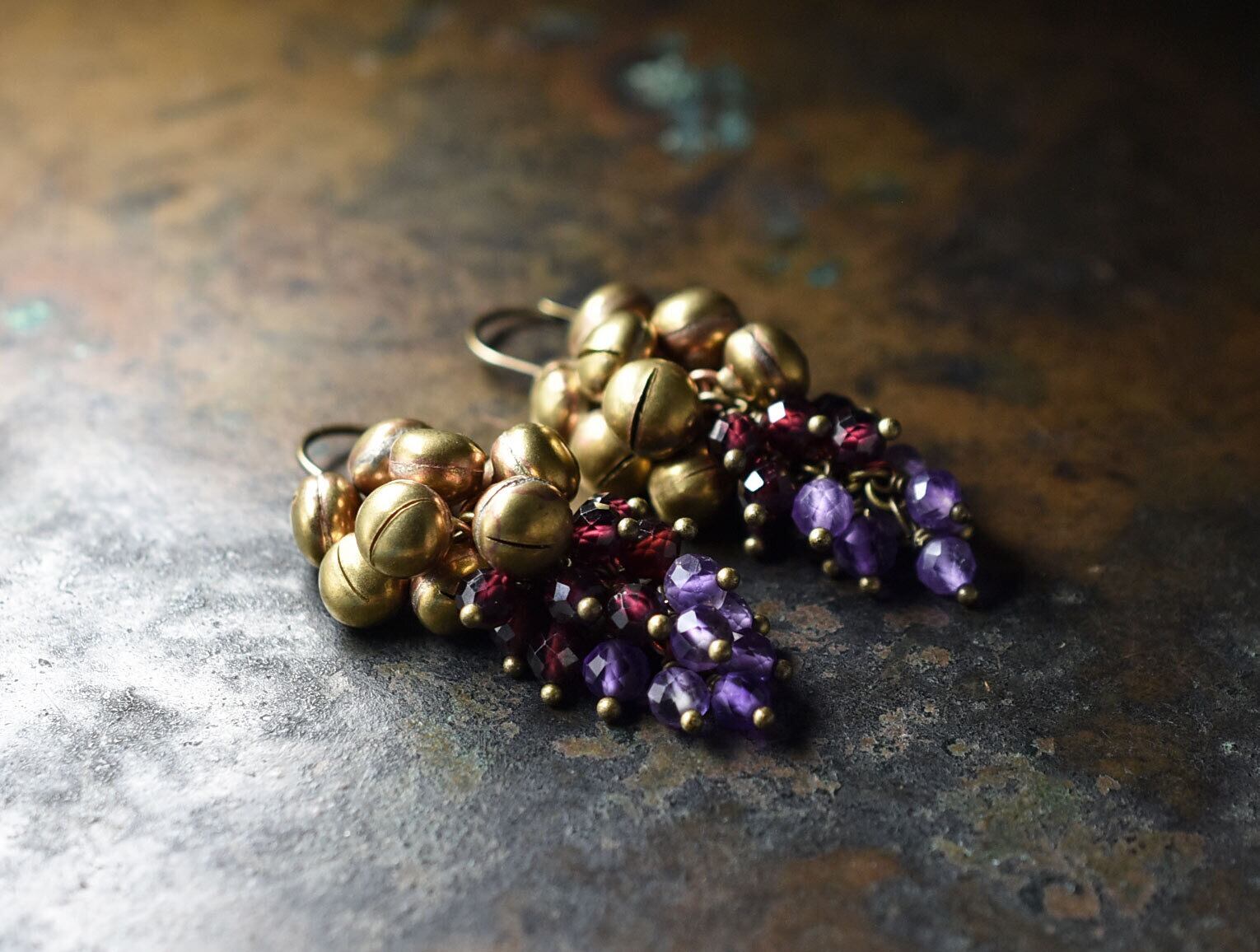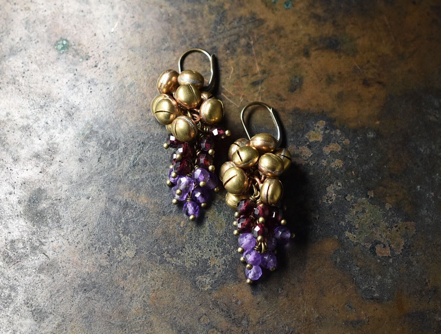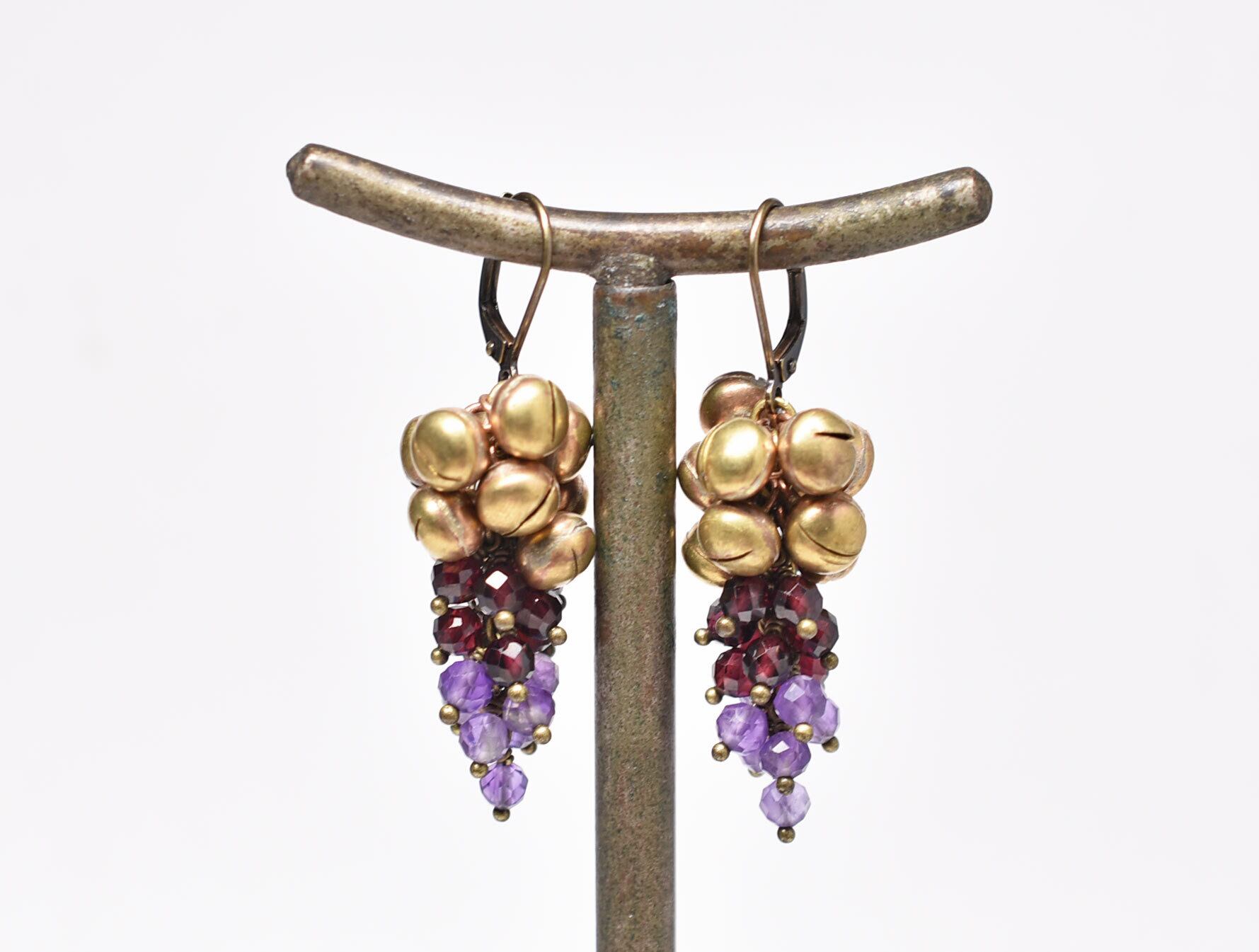たわわな鈴とガーネット、アメジストを実らせたピアスです。