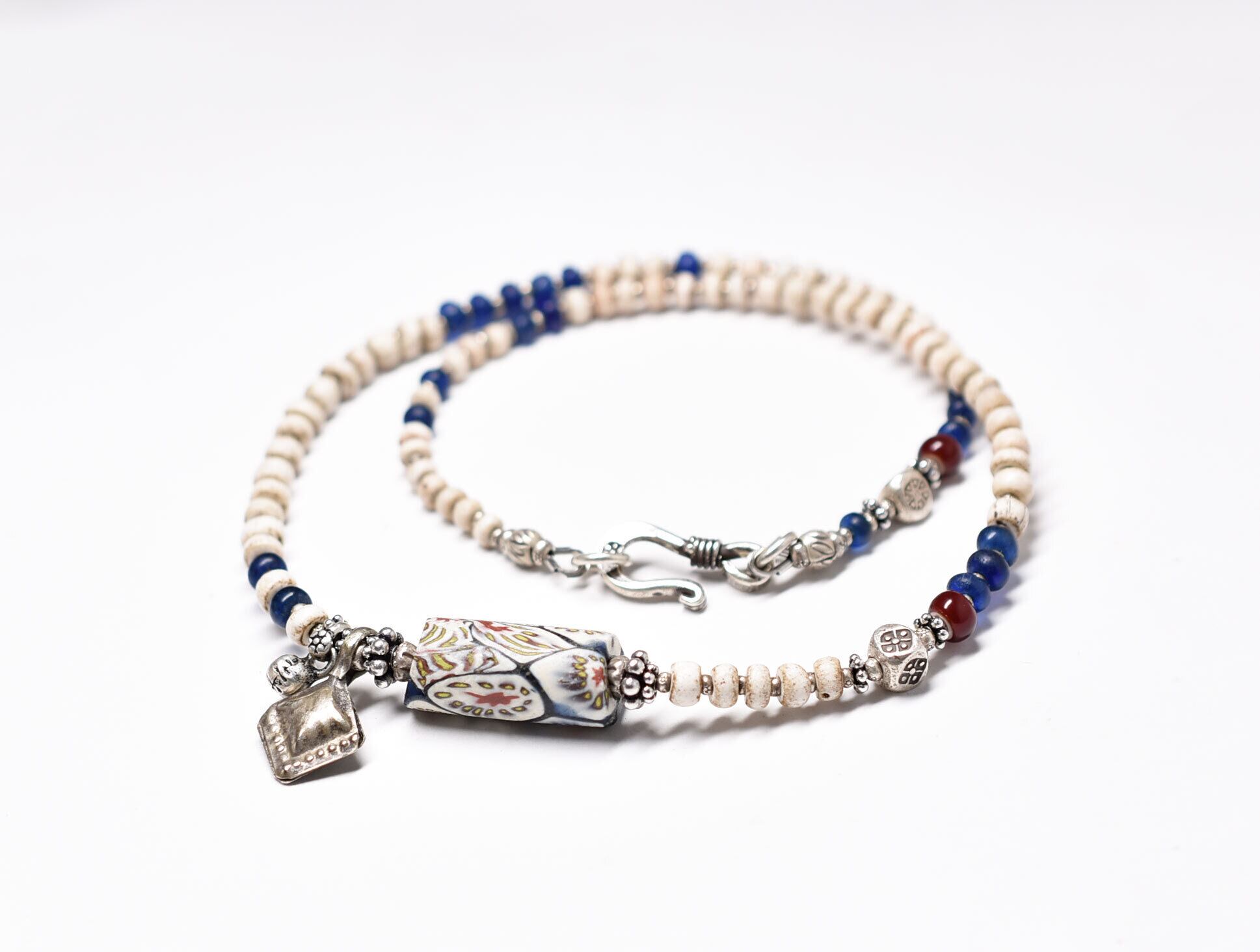 アンティーク星模様ミルフィオリビーズとホワイト&ブルービーズ、血赤ホワイトハーツ、カレンシルバーなどを繋いだネックレスです。