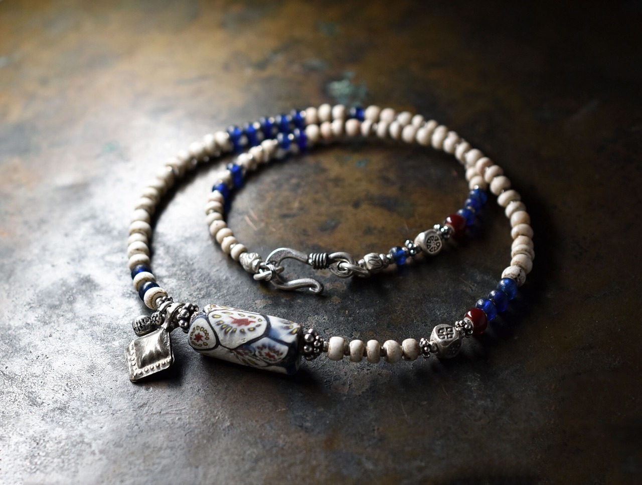 アンティーク星模様ミルフィオリビーズとホワイト&ブルービーズ、血赤ホワイトハーツ、カレンシルバーのネックレス