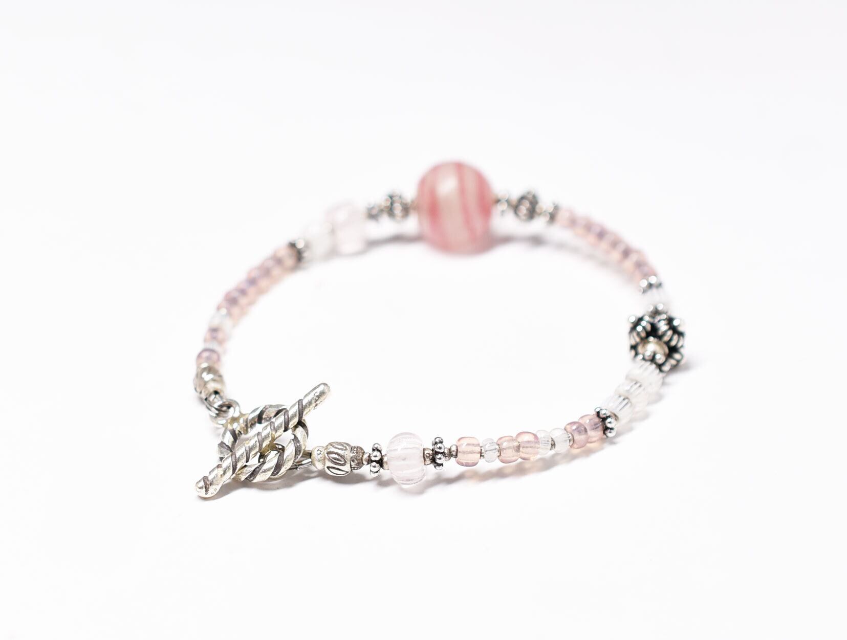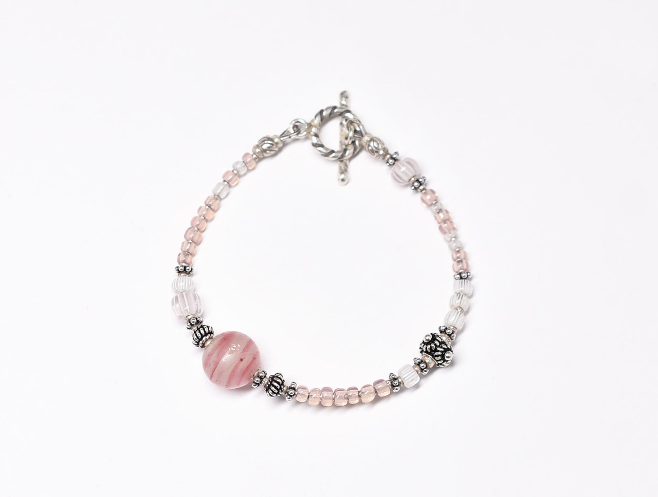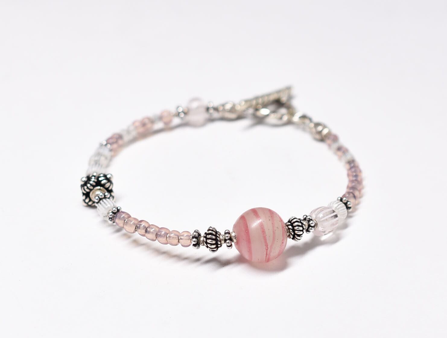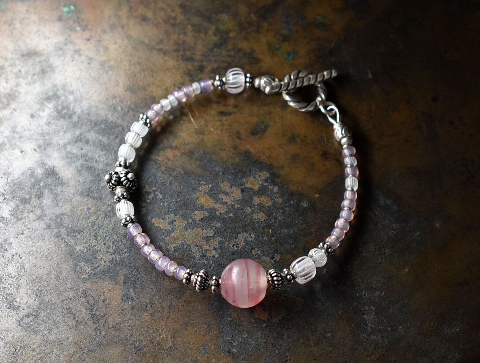 アンティーク金赤マーブルビーズとグーズベリー、ピンクオパールビーズ、シルバー、カレンシルバーを繋いだブレスです。