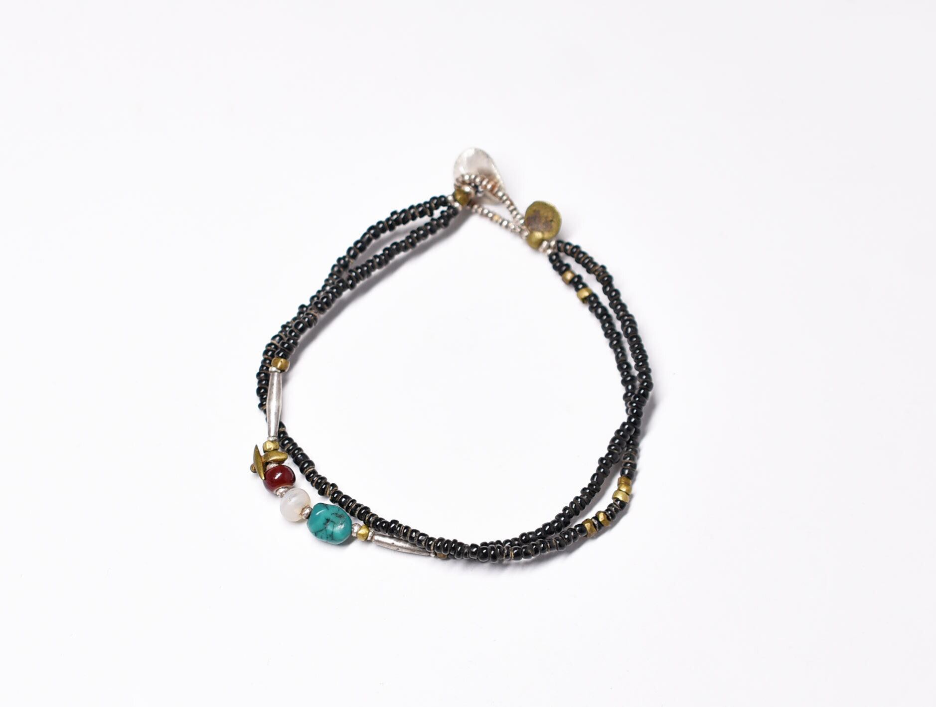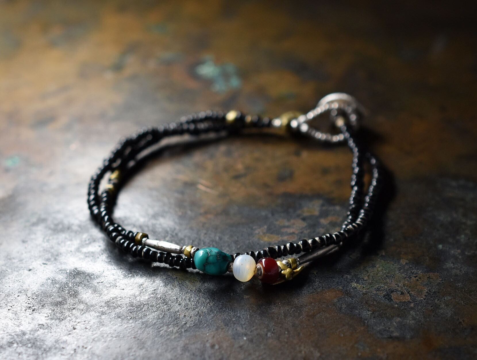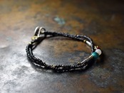 oldチベタンターコイズ、血赤ホワイトハーツ、古代瑪瑙、oldチンシルバー、oldオリッサブラス、漆黒ビーズの華奢な2連ブレス