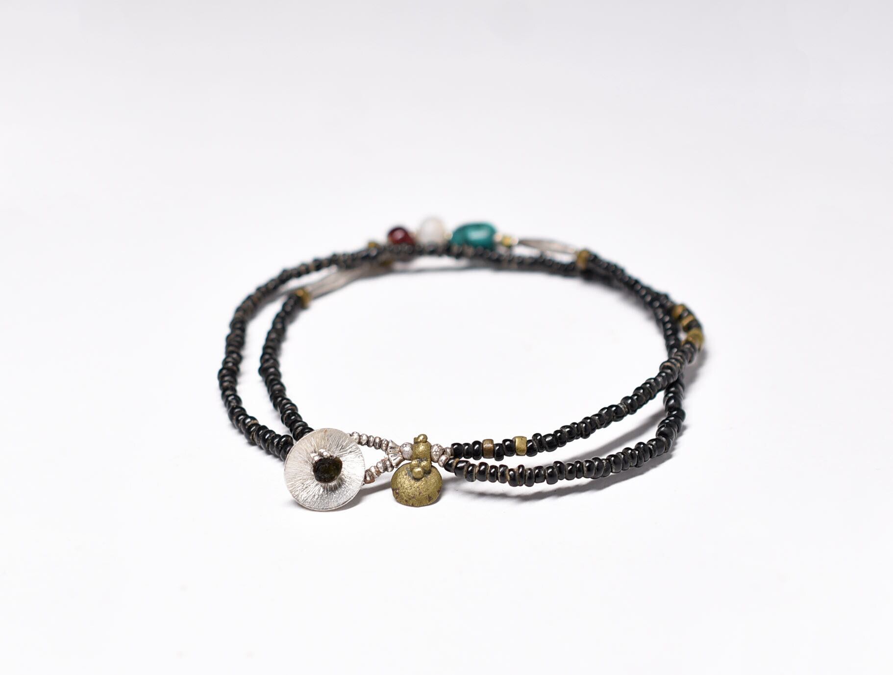素材:oldチベタンターコイズ、ガラス、古代瑪瑙、oldチンシルバー、oldオリッサブラス、カレンシルバー、ロウビキ紐