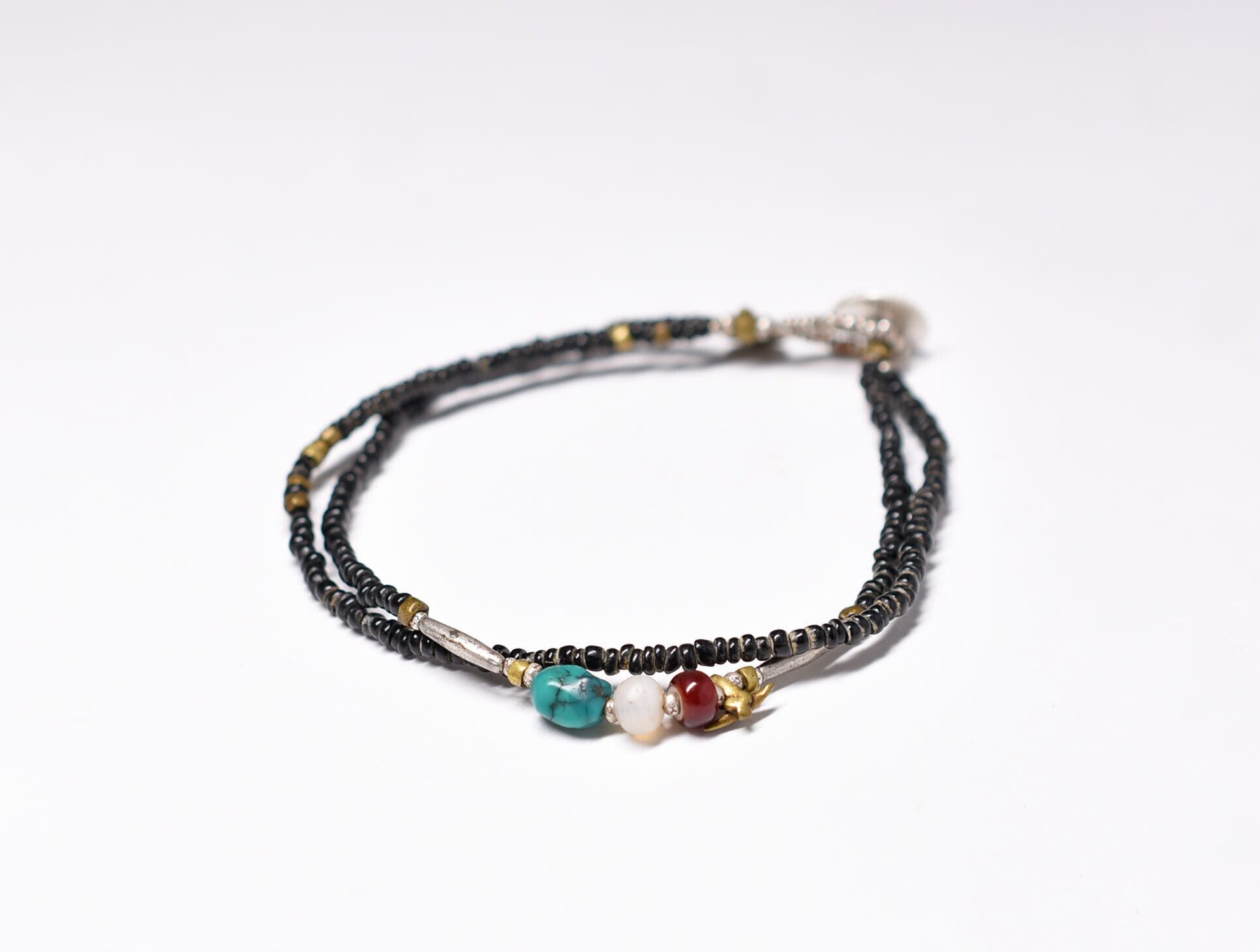 oldチベタンターコイズ、血赤ホワイトハーツ、古代瑪瑙、oldチンシルバー、oldオリッサブラス、漆黒ビーズを繋いだ華奢な2連のブレスです。