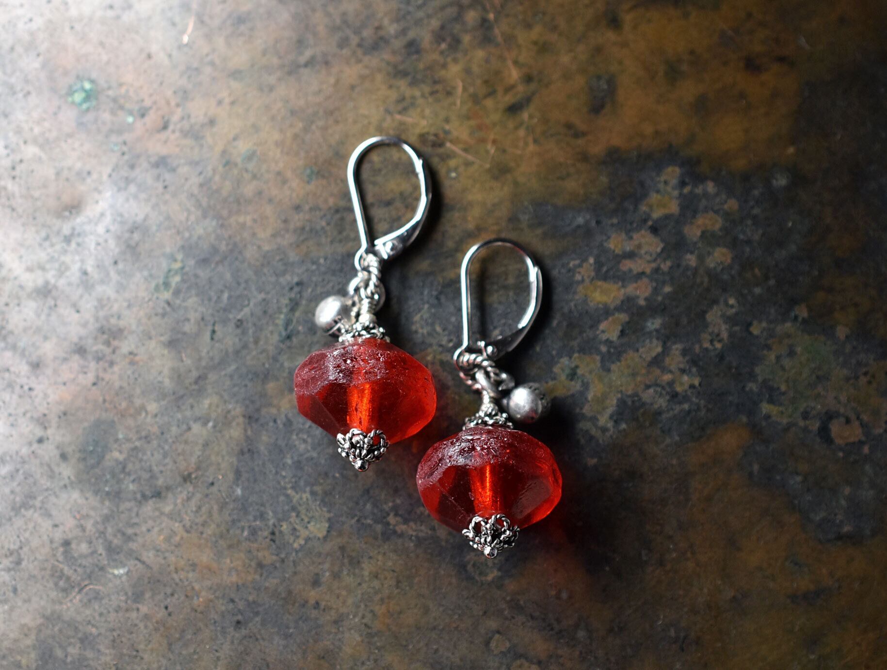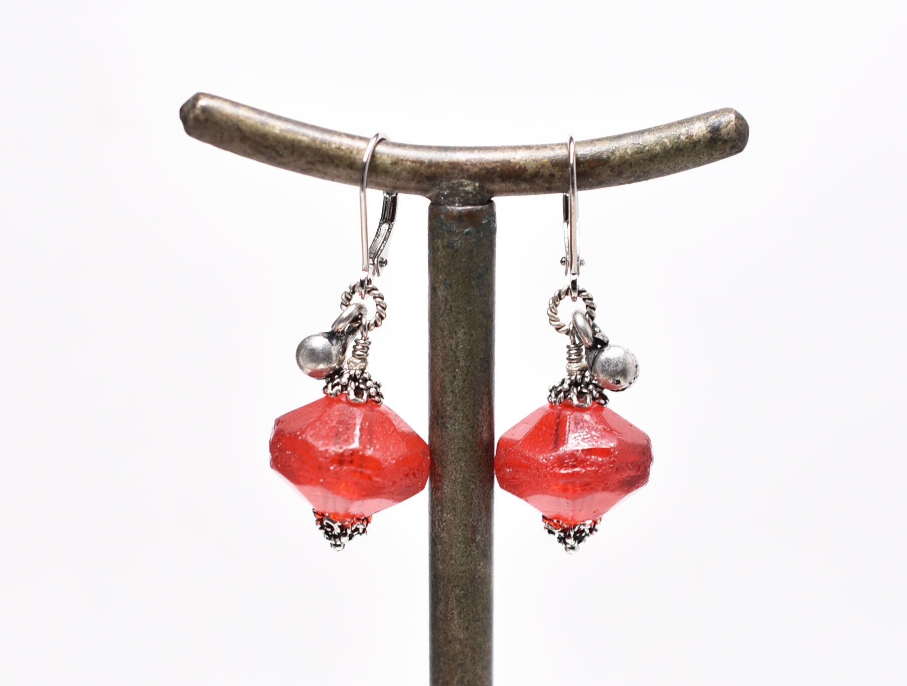 真っ赤な算盤型アンティークボヘミアビーズとインドシルバーの小さな鈴のピアス
