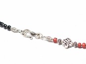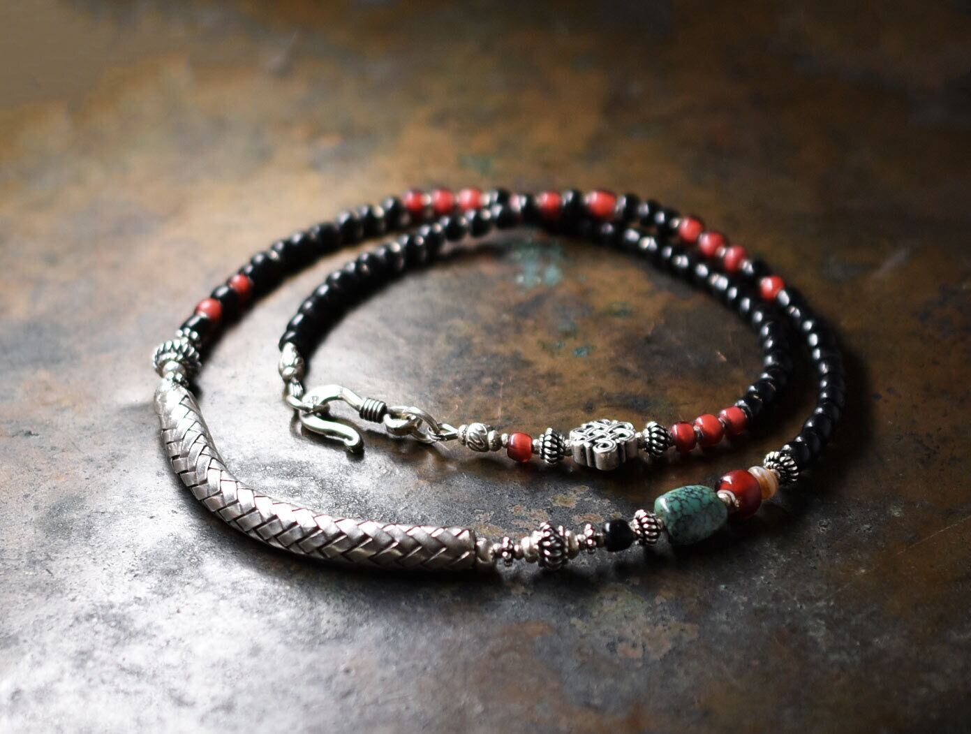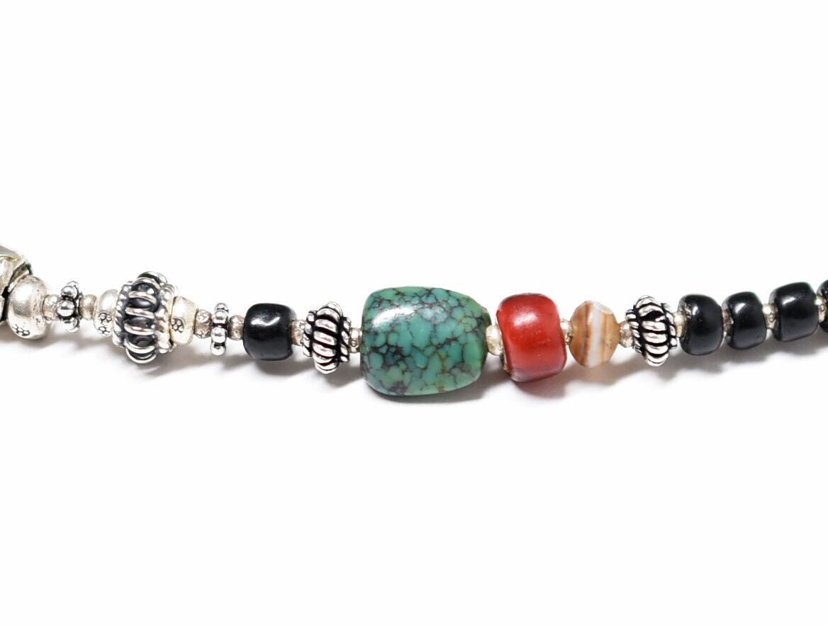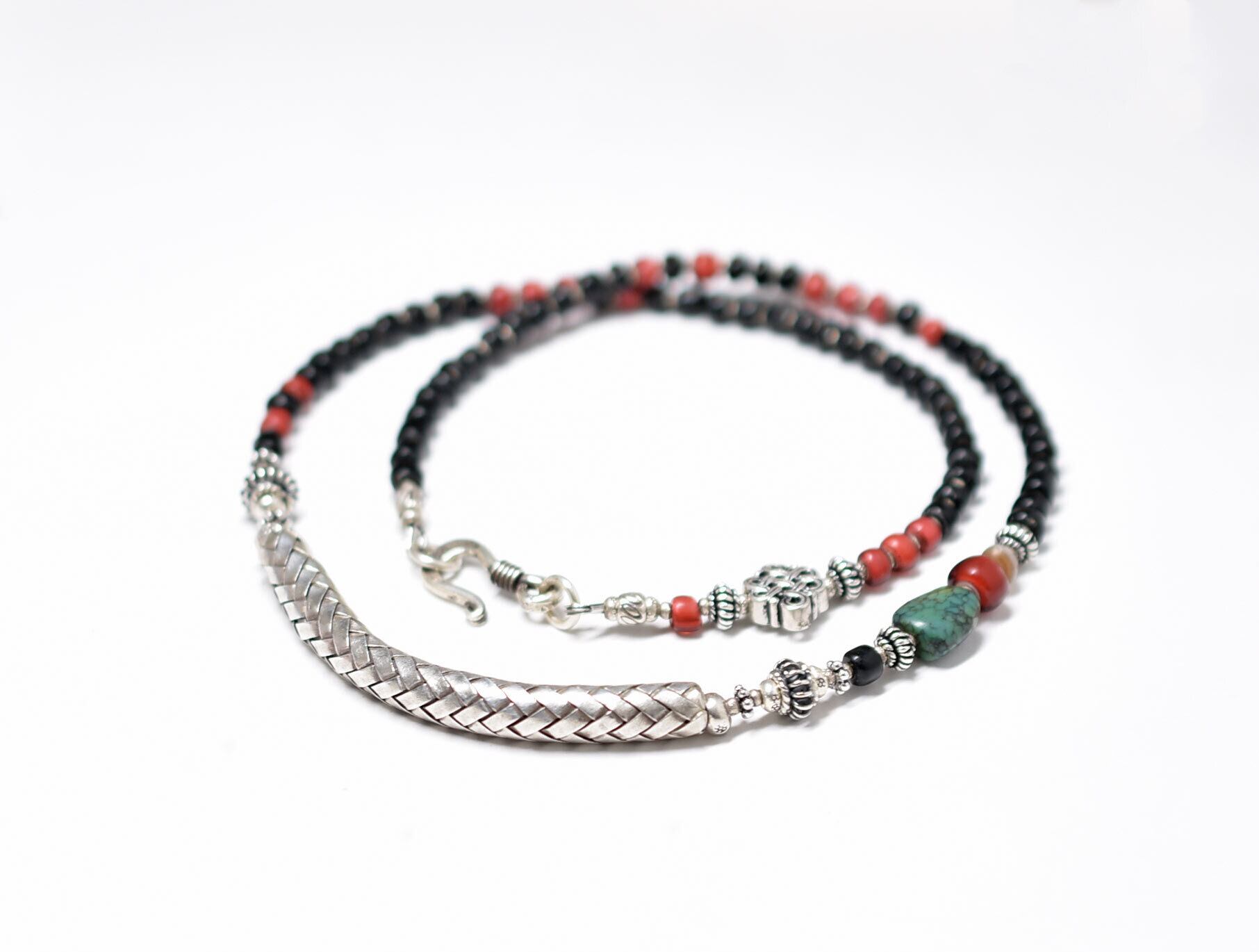湾曲網目カレンシルバーとoldチベタンターコイズ、古代瑪瑙、漆黒ビーズ、金赤ホワイトハーツ、エンドレスノットのネックレス