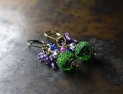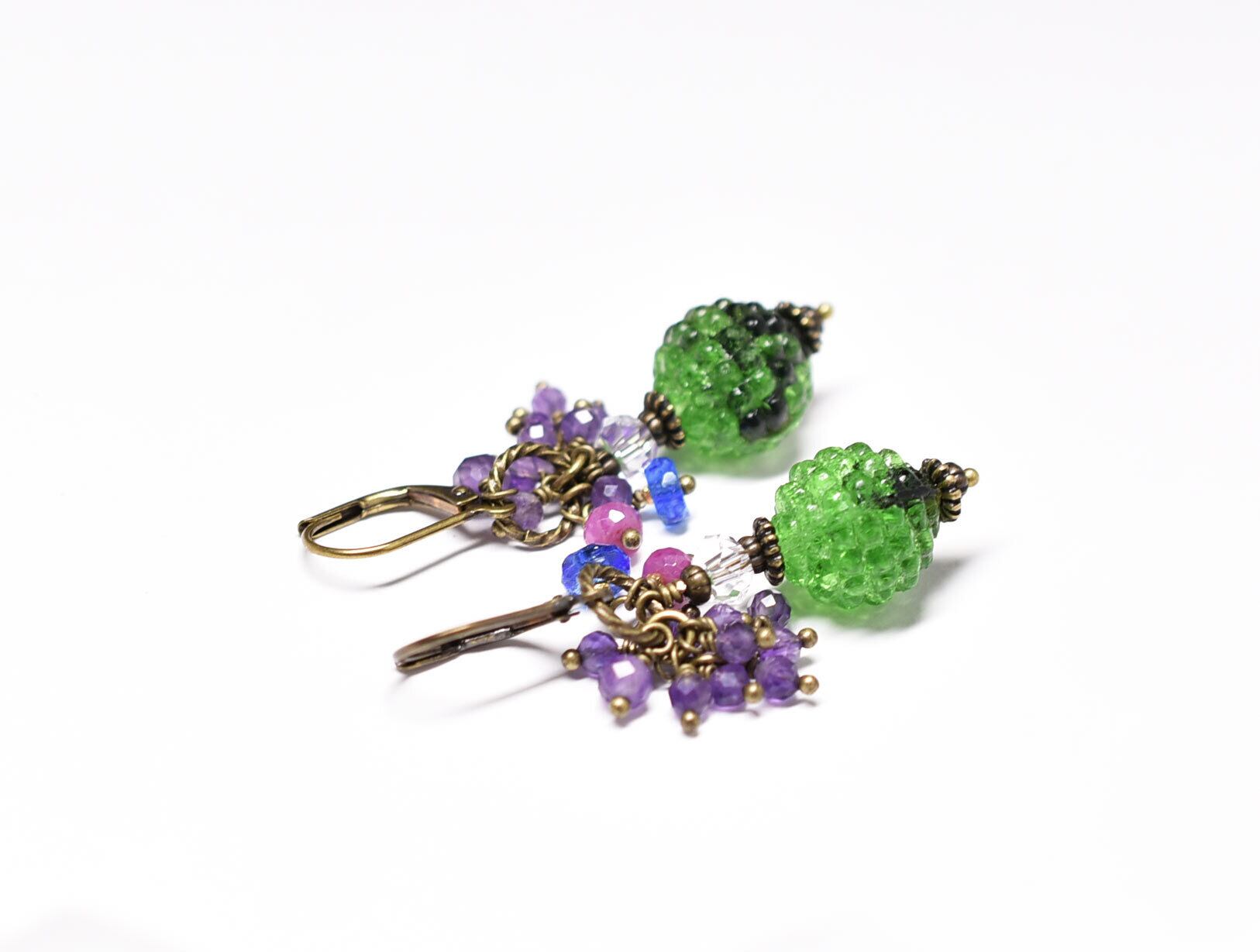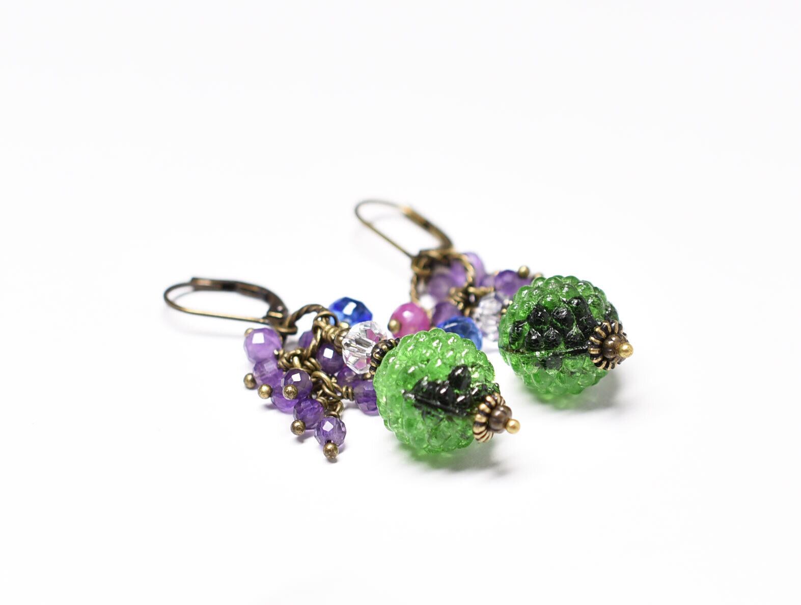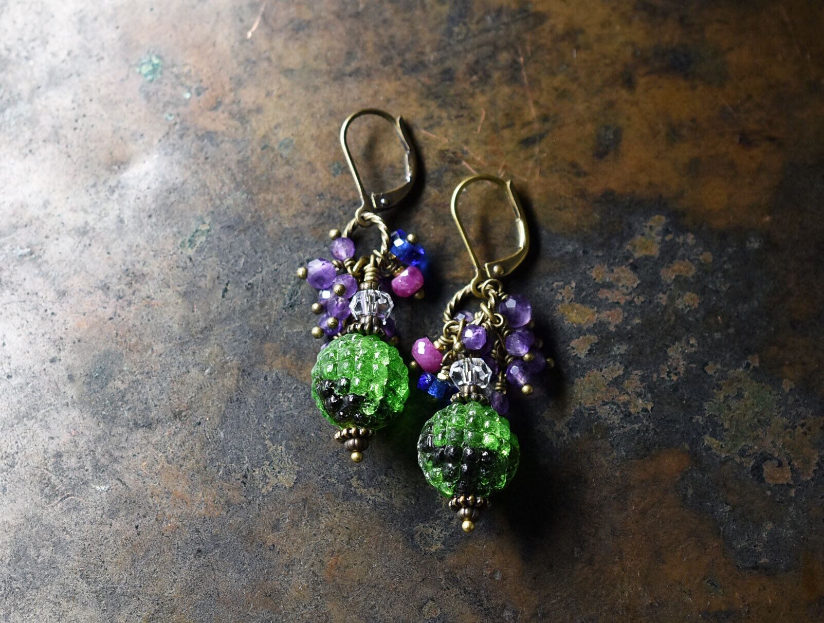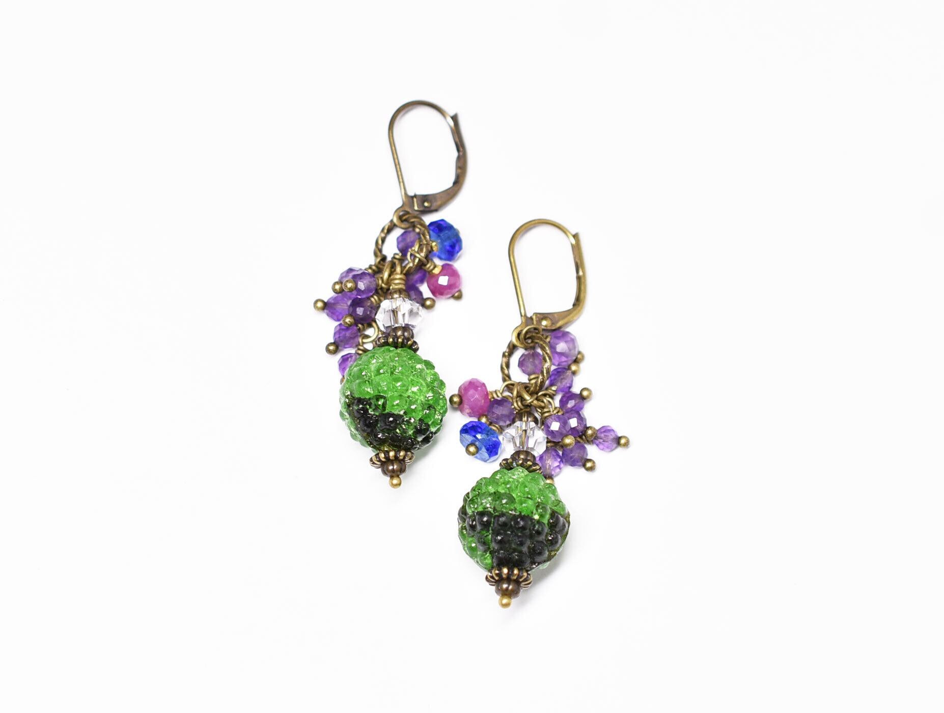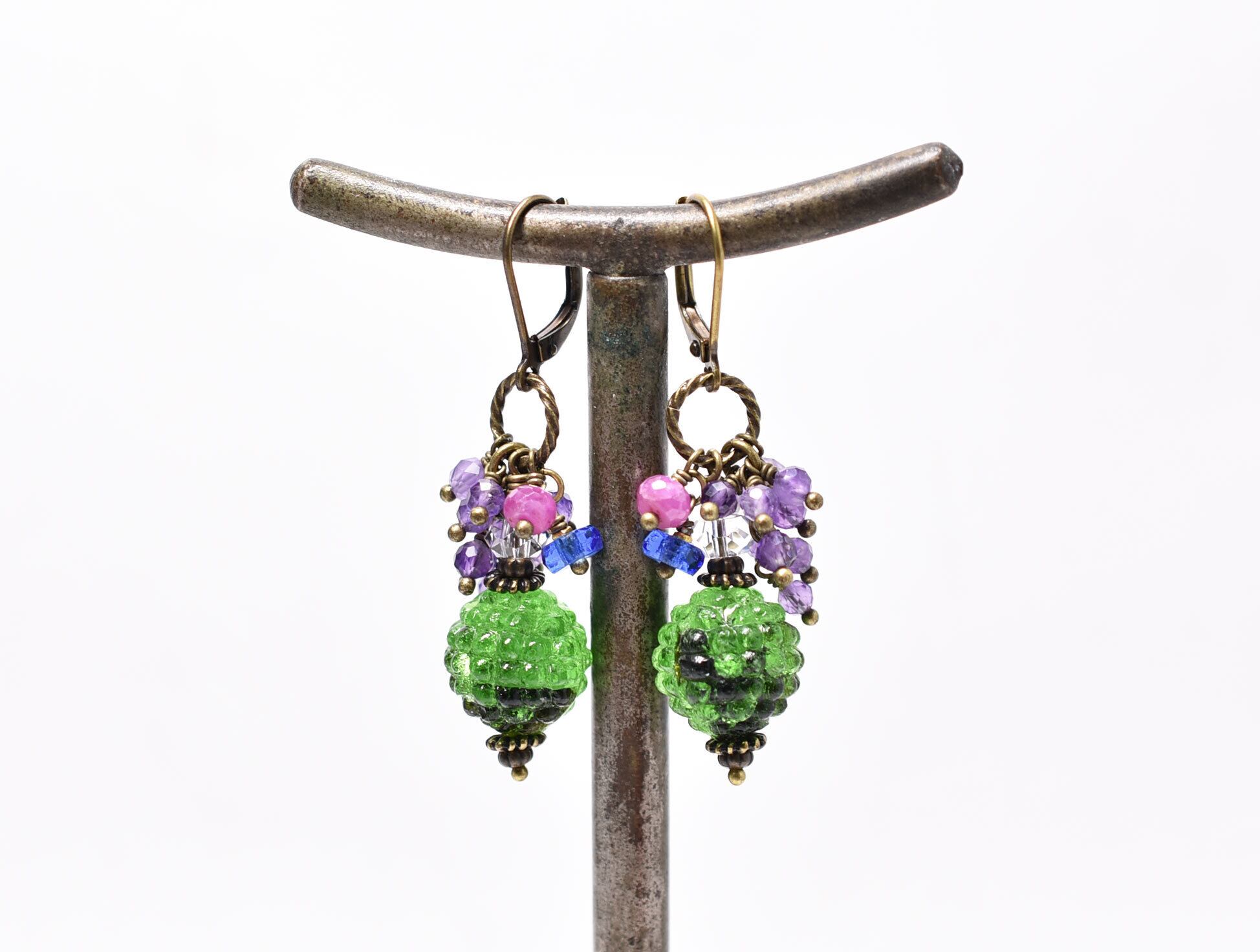 ヴィンテージシュガービーズとたわわなアメジスト、ルビー、クォーツ、ブルービーズのピアス