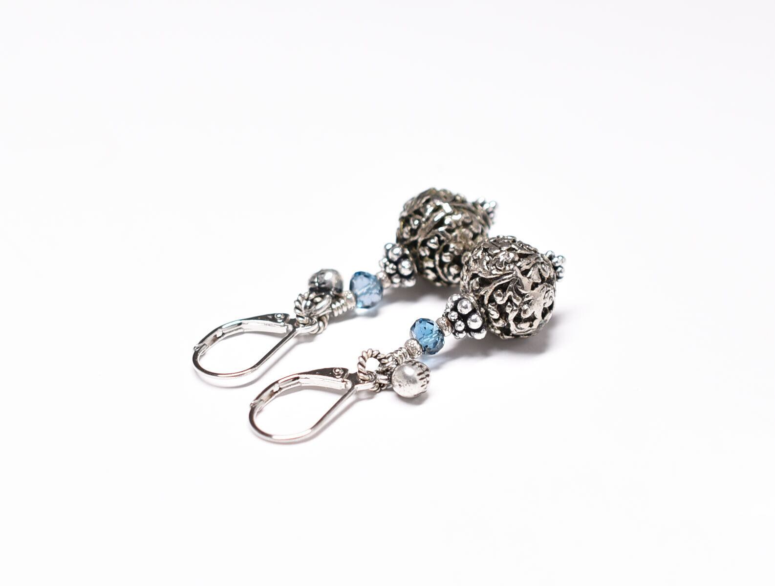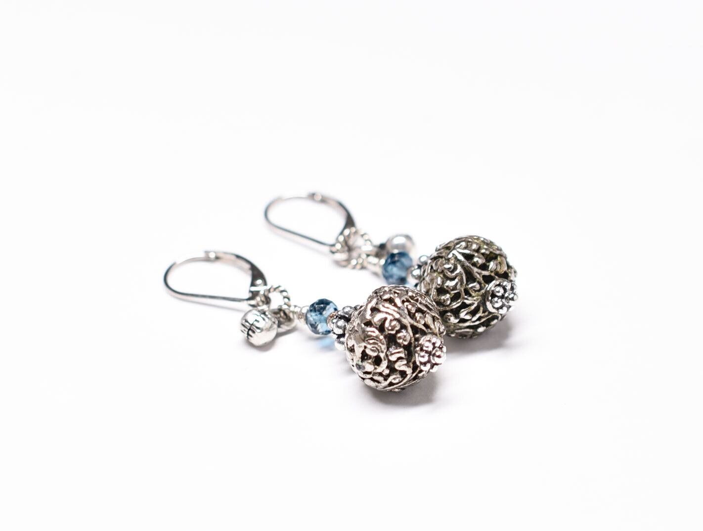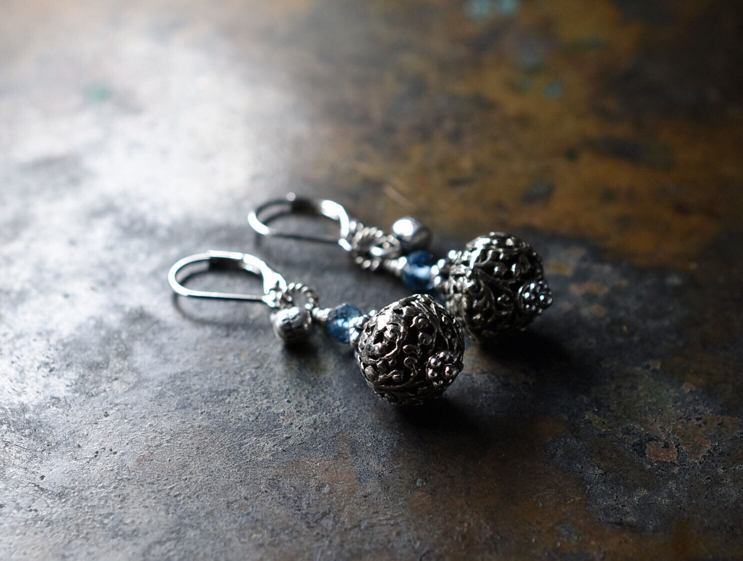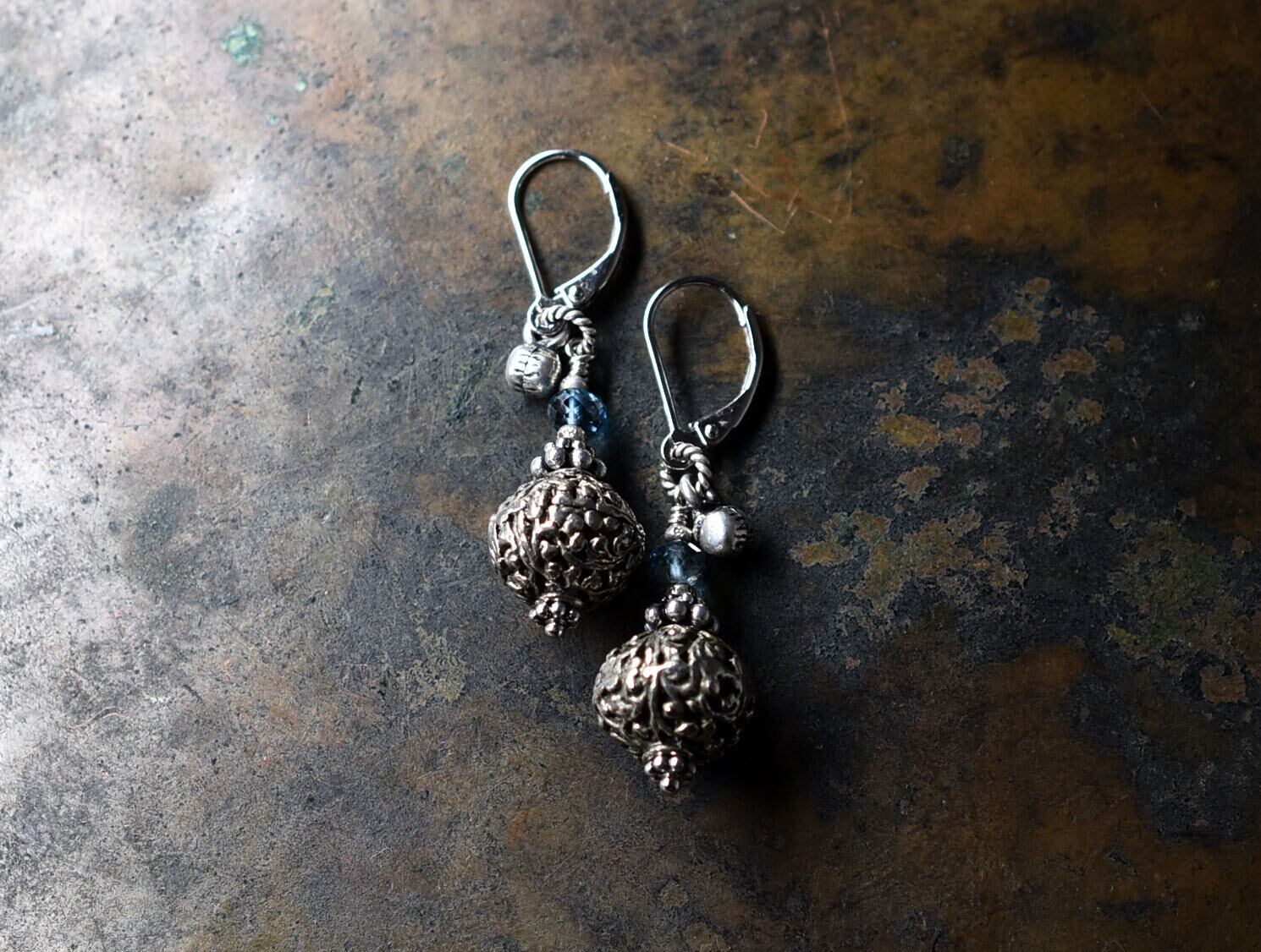 繊細細工メタルパーツとロンドンブルートパーズ、インドシルバーの小さな鈴のピアス