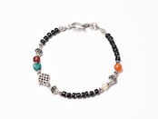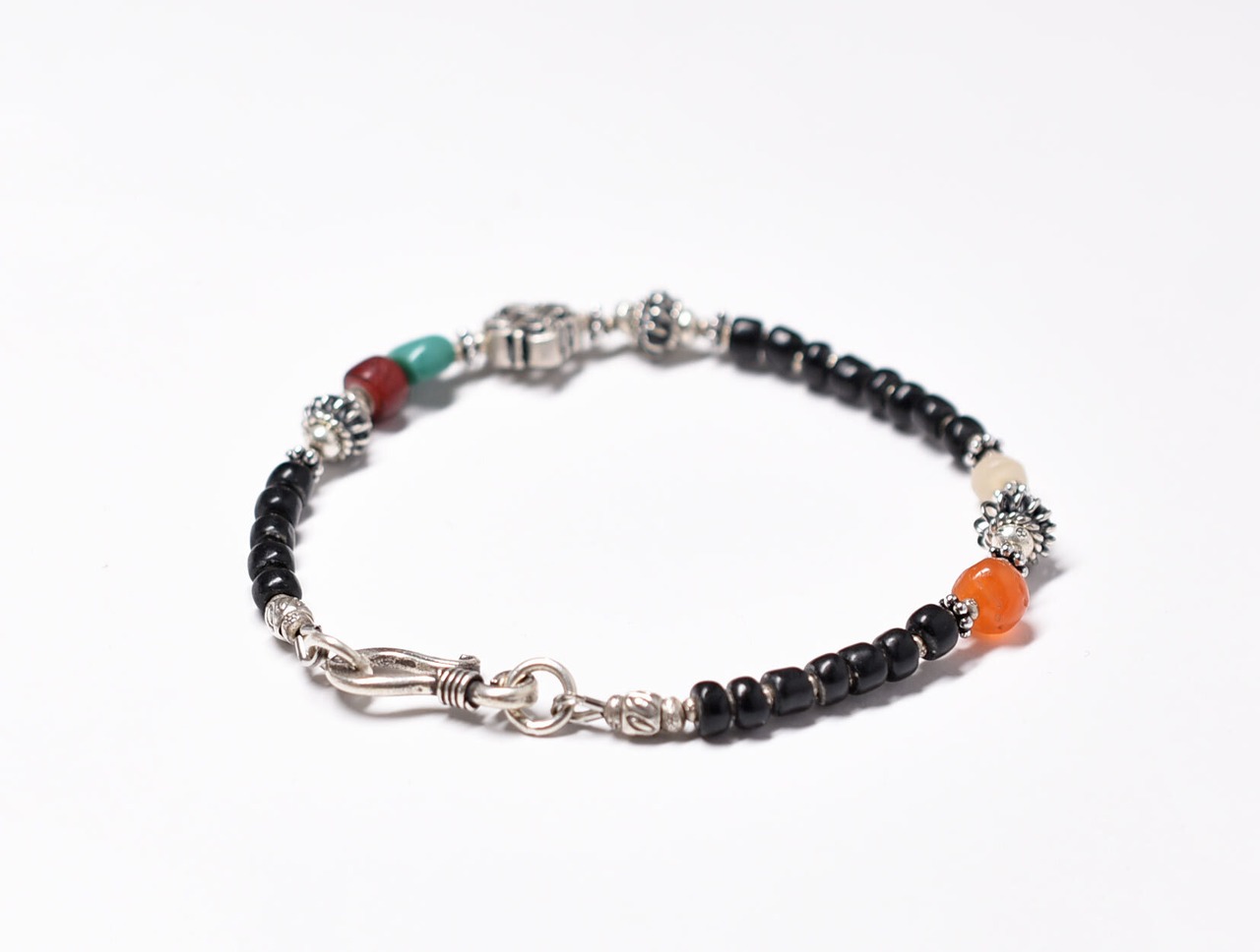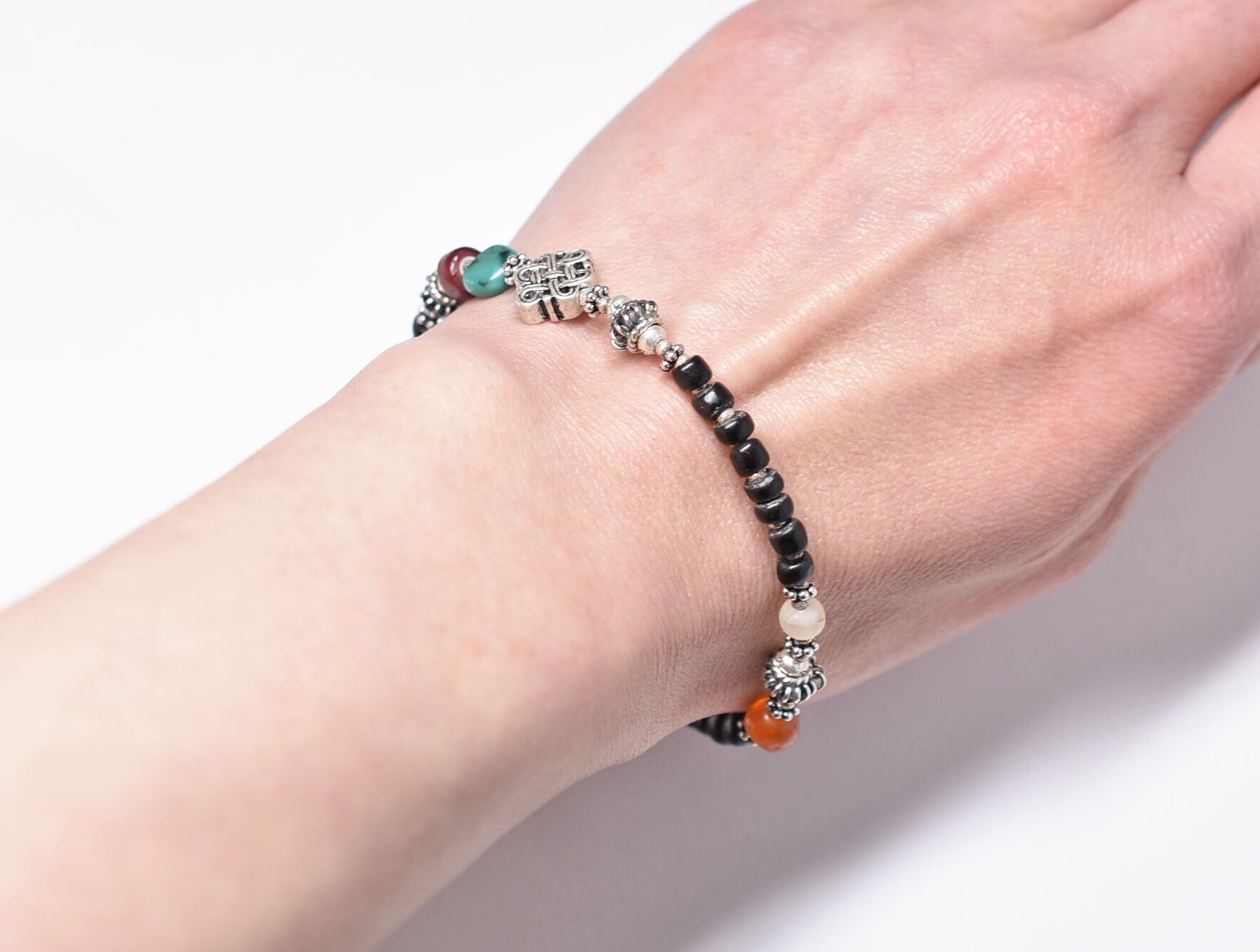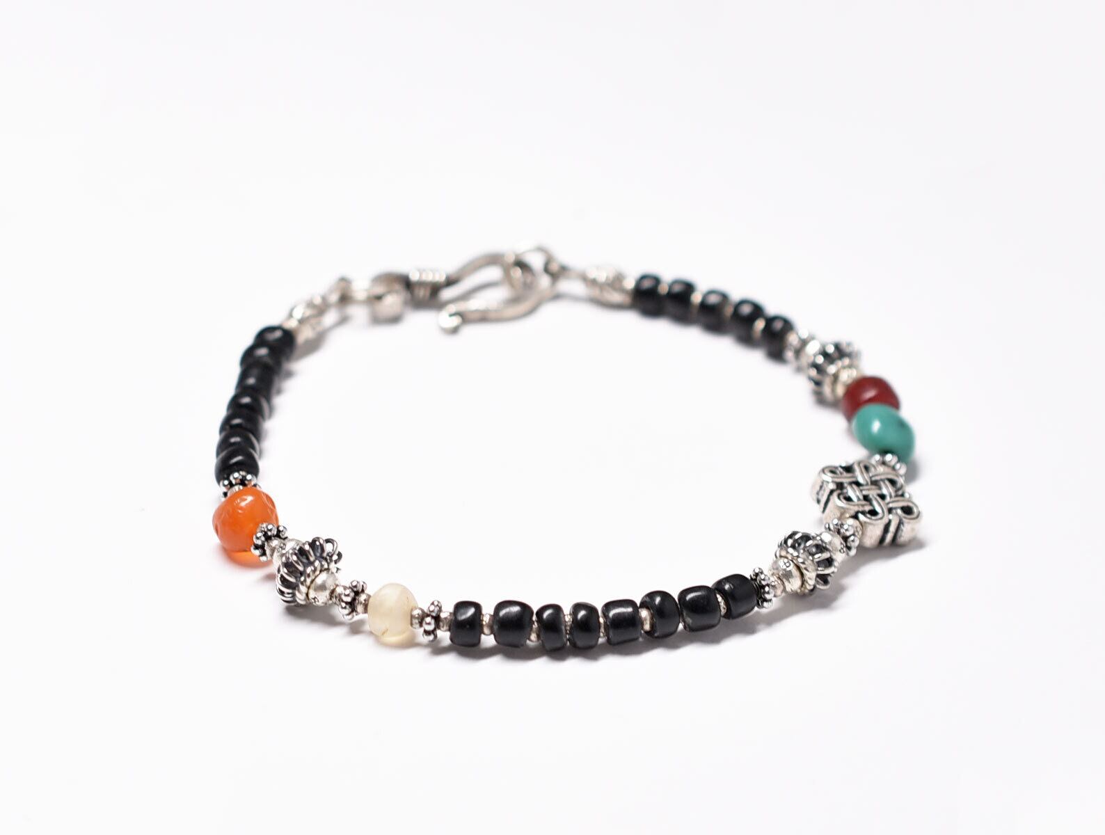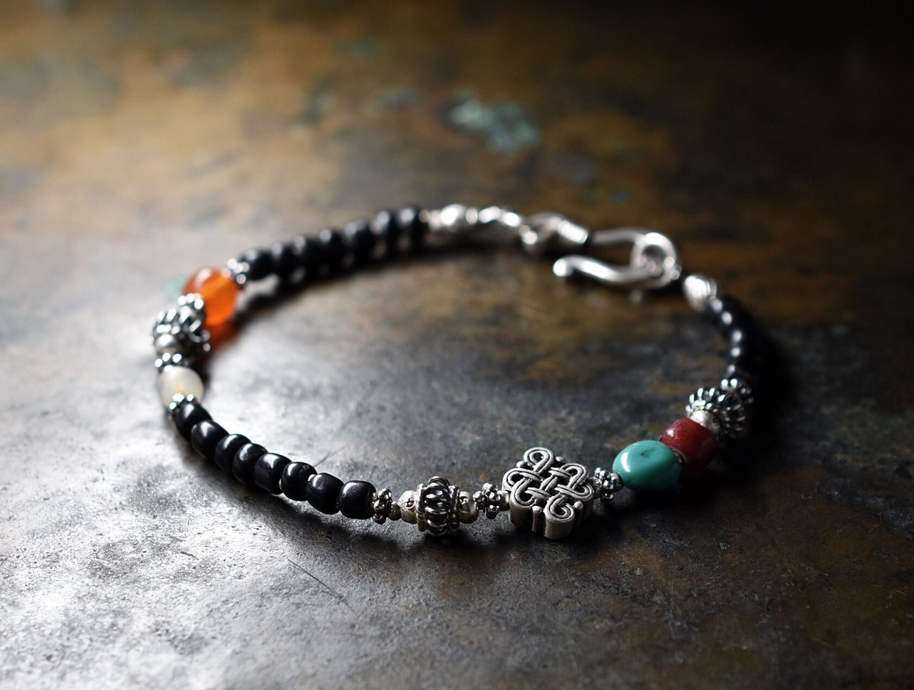 エンドレスノットとoldチベタンターコイズ、金赤ホワイトハーツ、古代瑪瑙、古代カーネリアン、漆黒ビーズを繋いだブレスです。